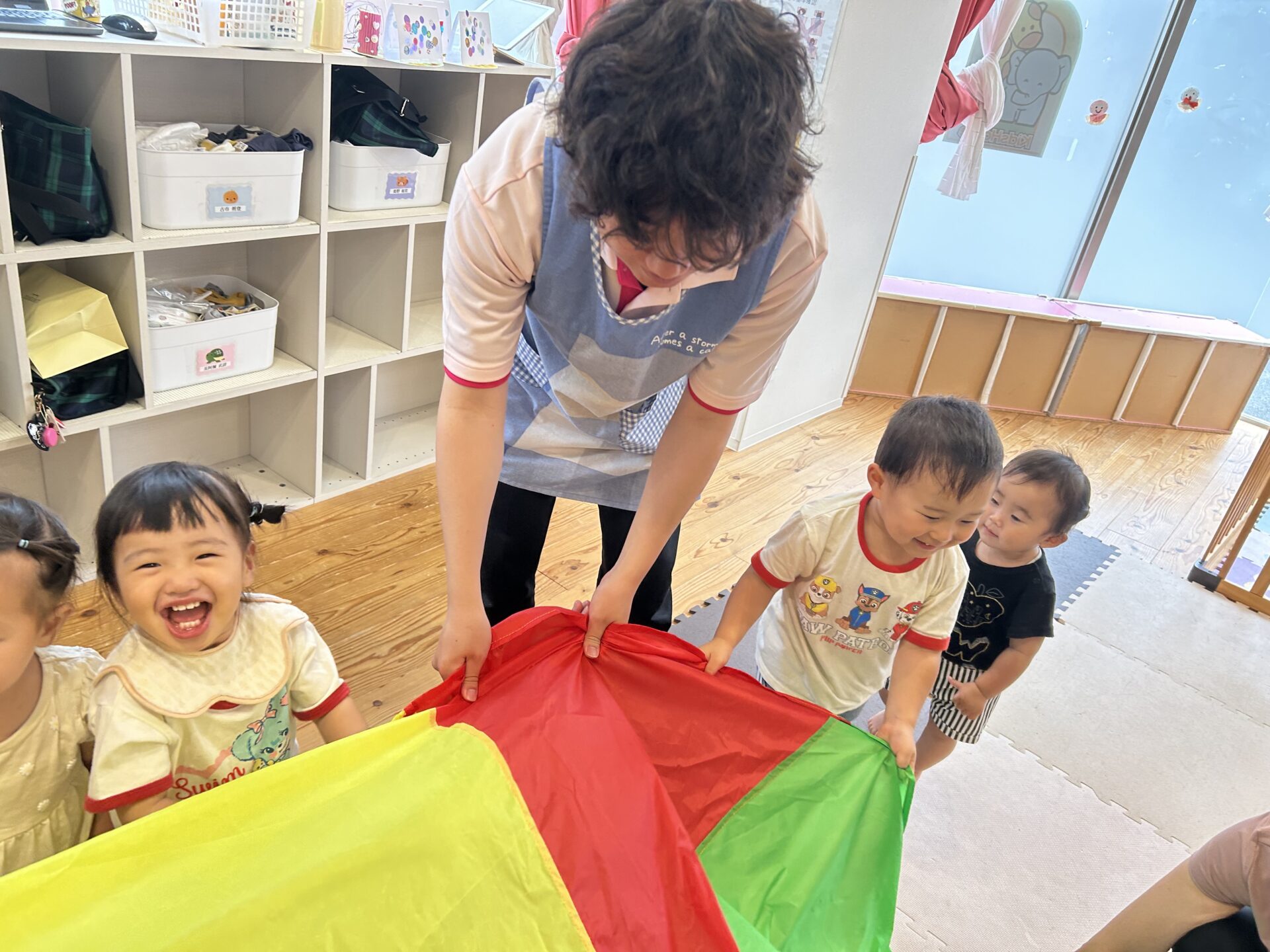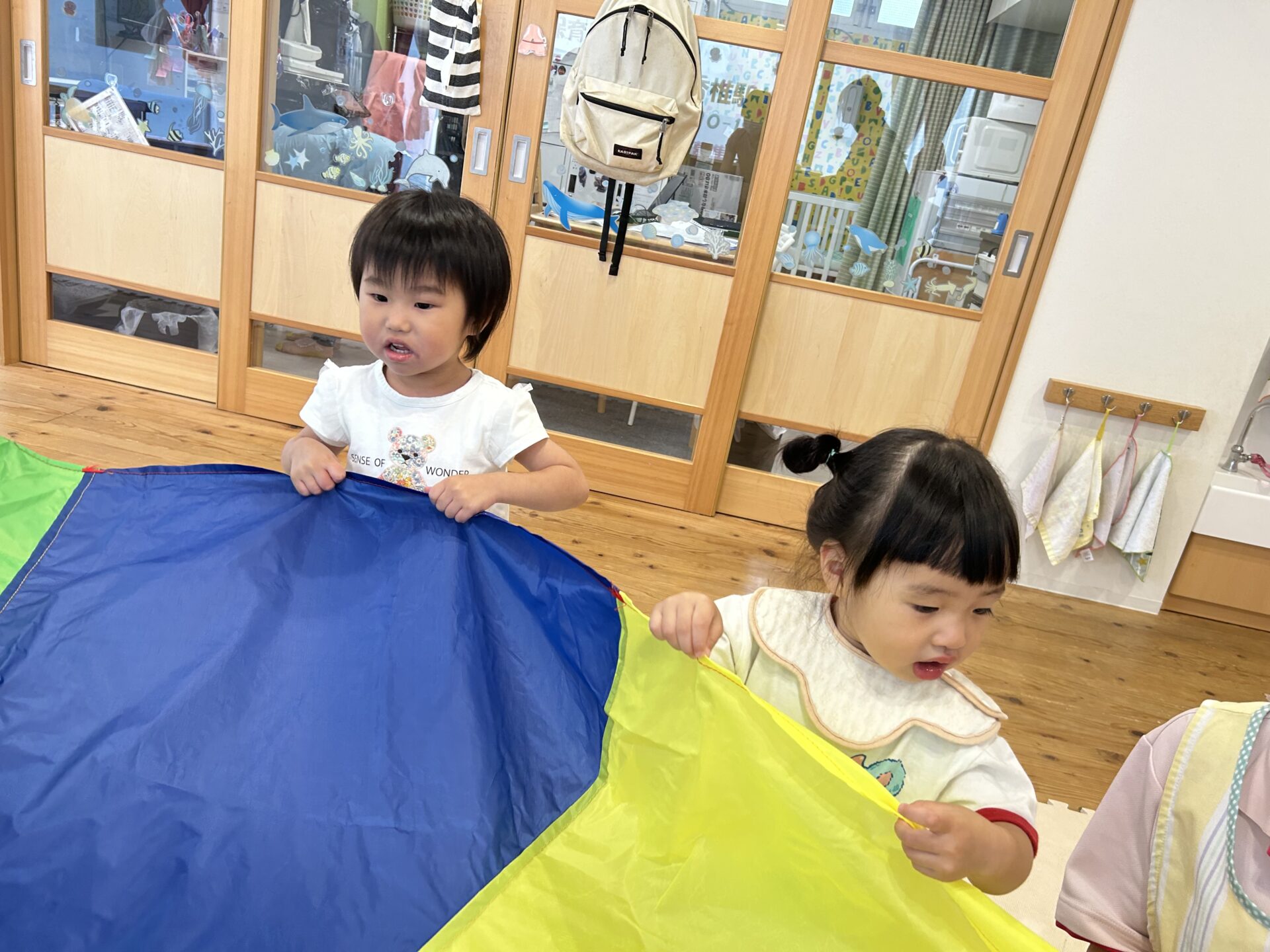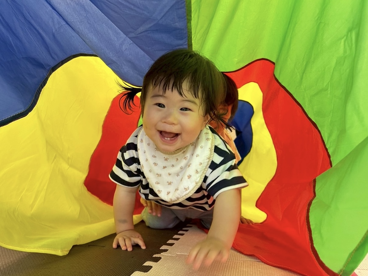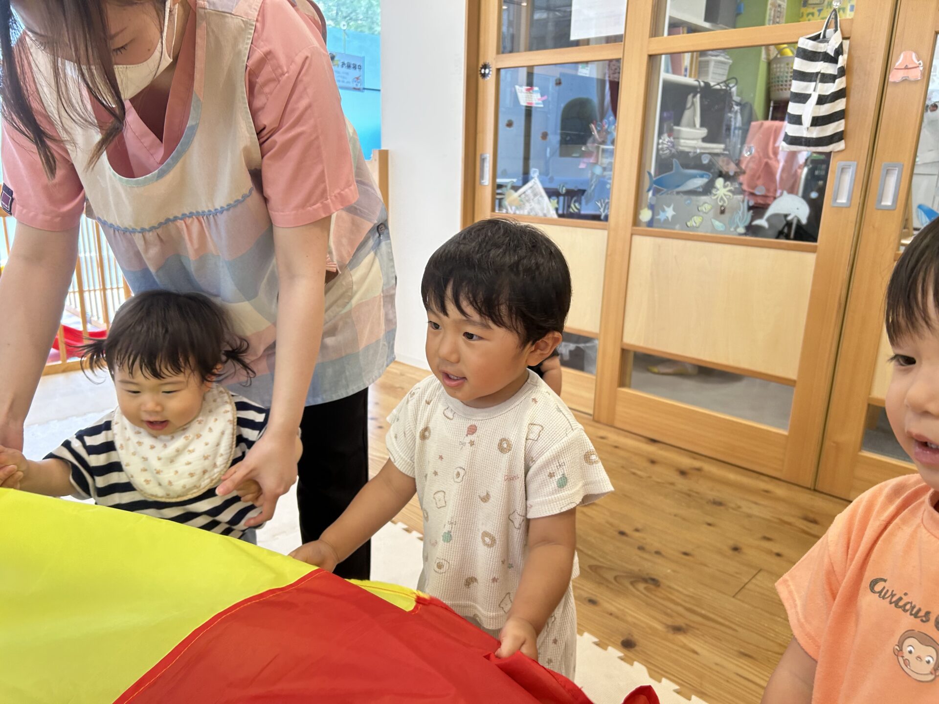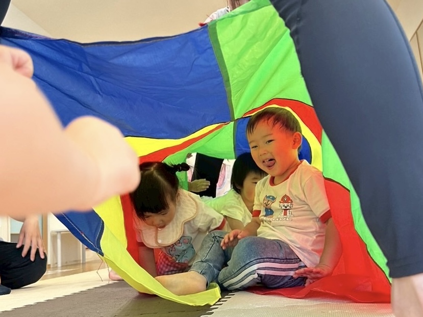 みんなで端を持ってくるくる回ってみたり、先生たちに「ピカブー」をしてもらい布の下に隠れたりと🤭✨