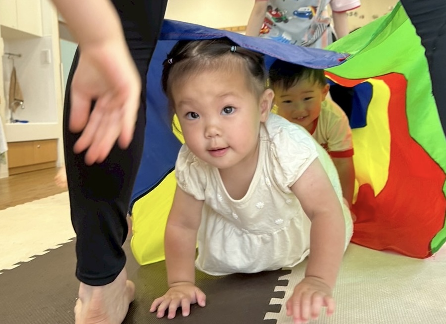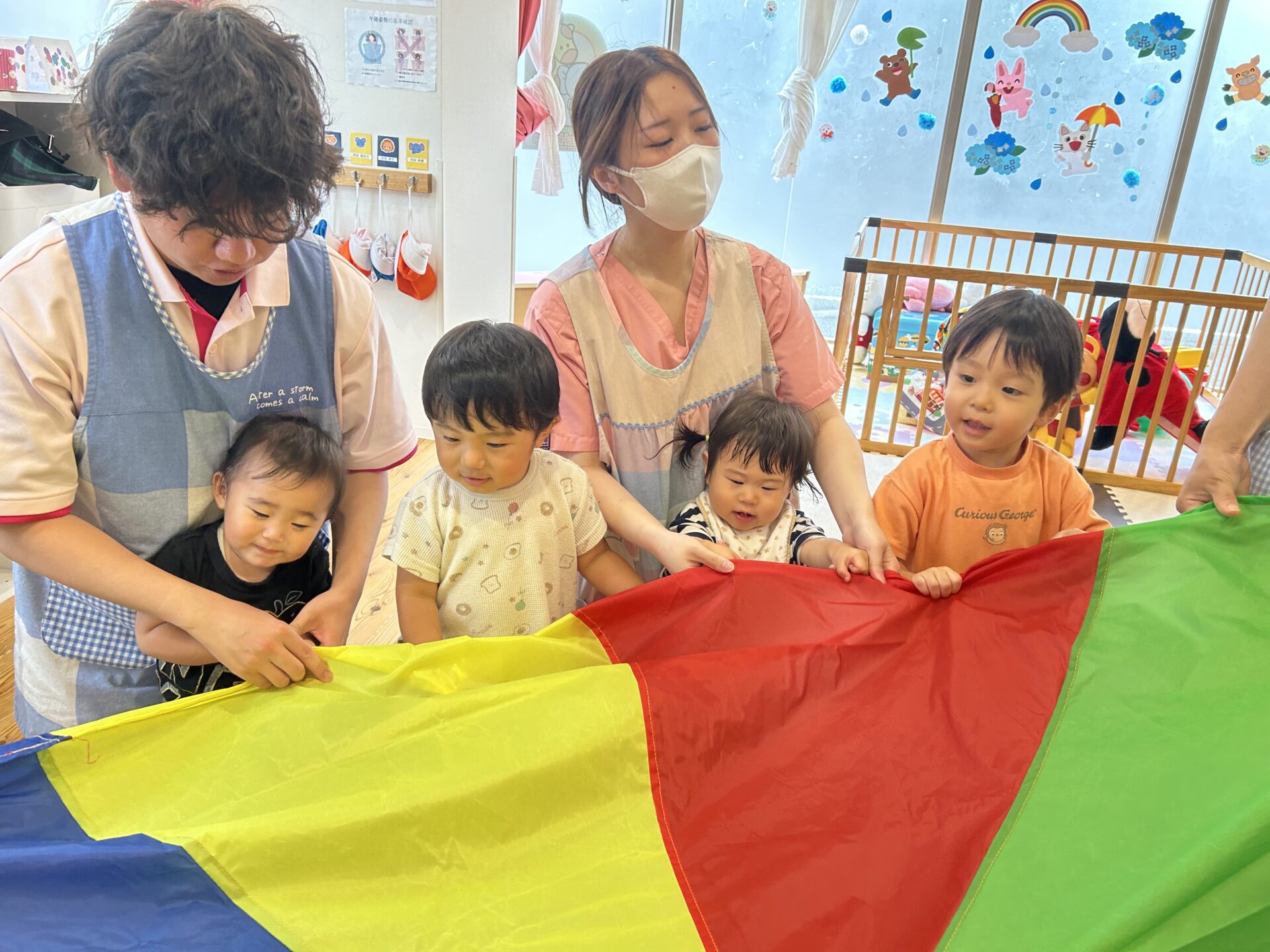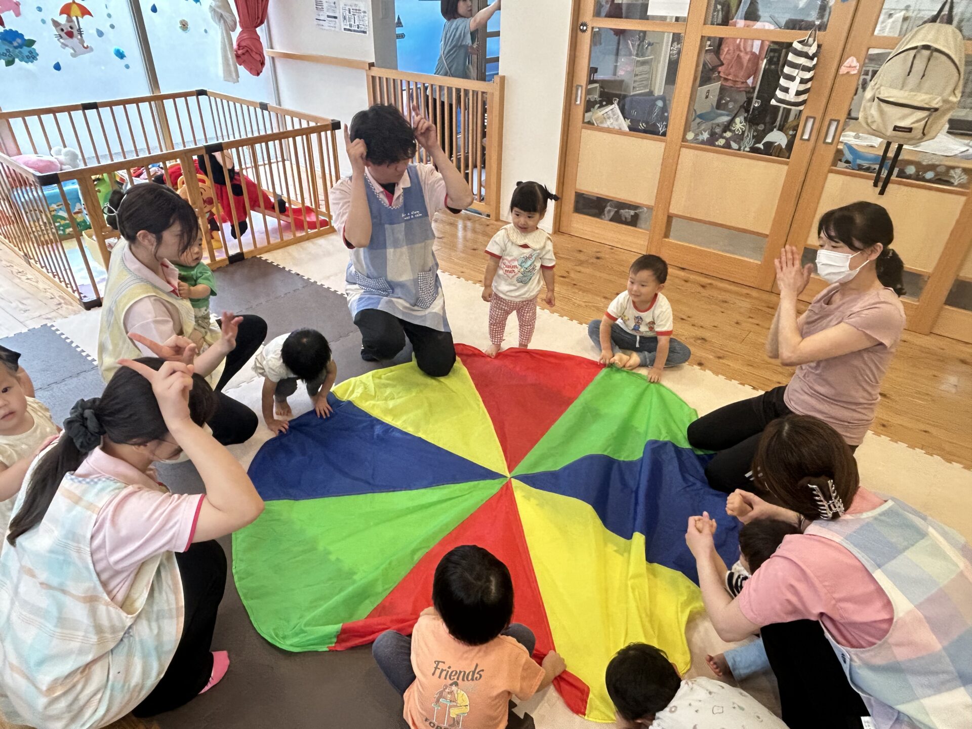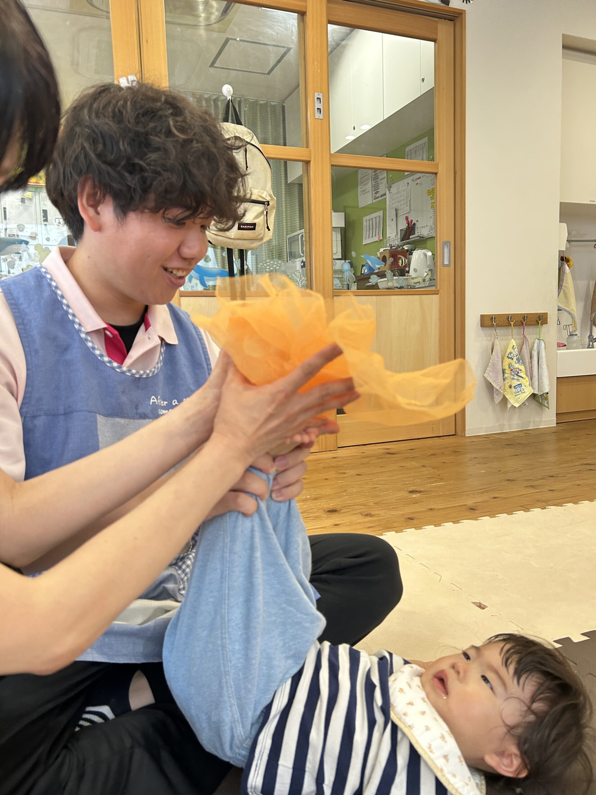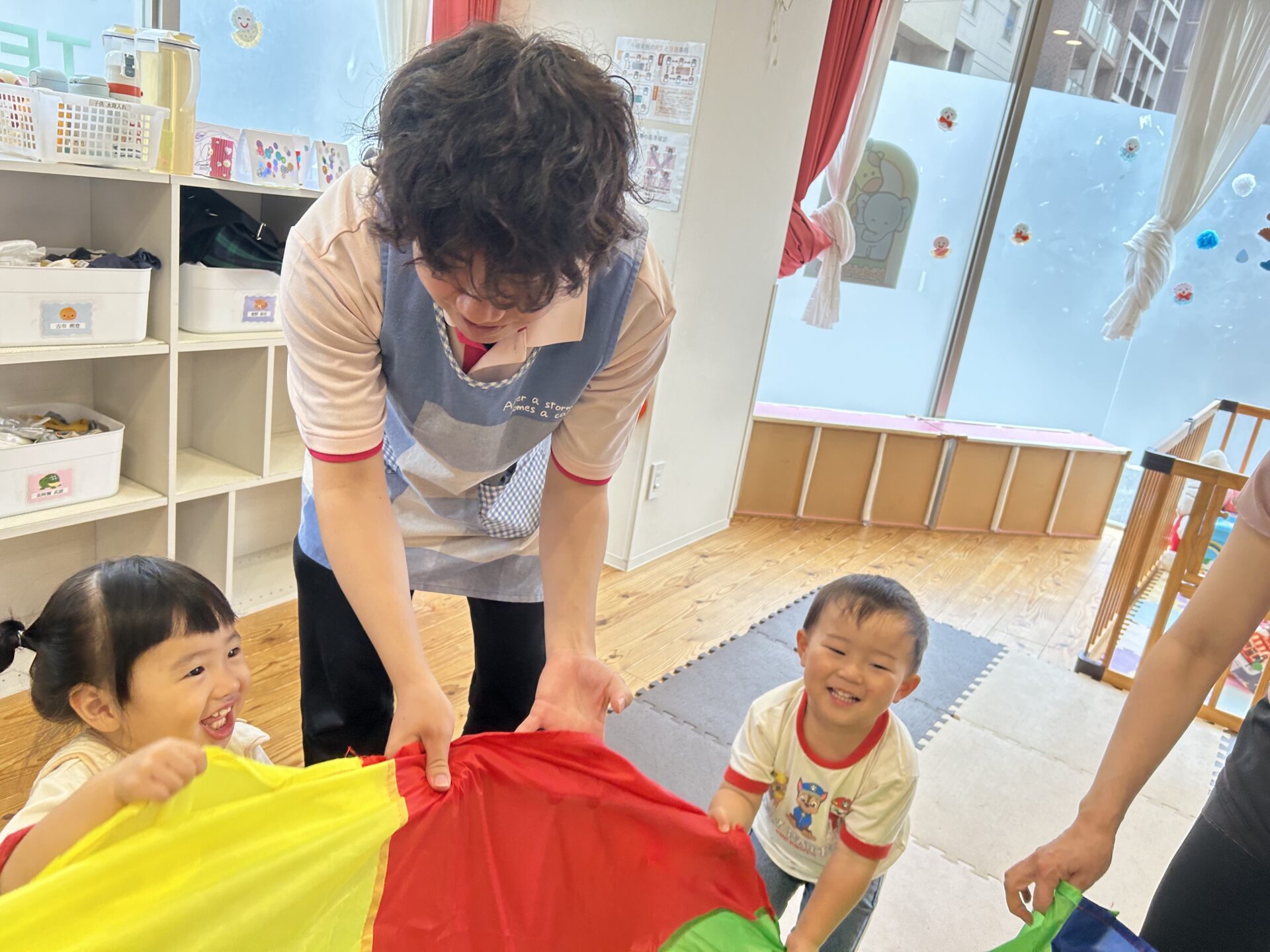 みんなで端を持ってくるくる回ってみたり、先生たちに「ピカブー」をしてもらい布の下に隠れたりと🤭✨