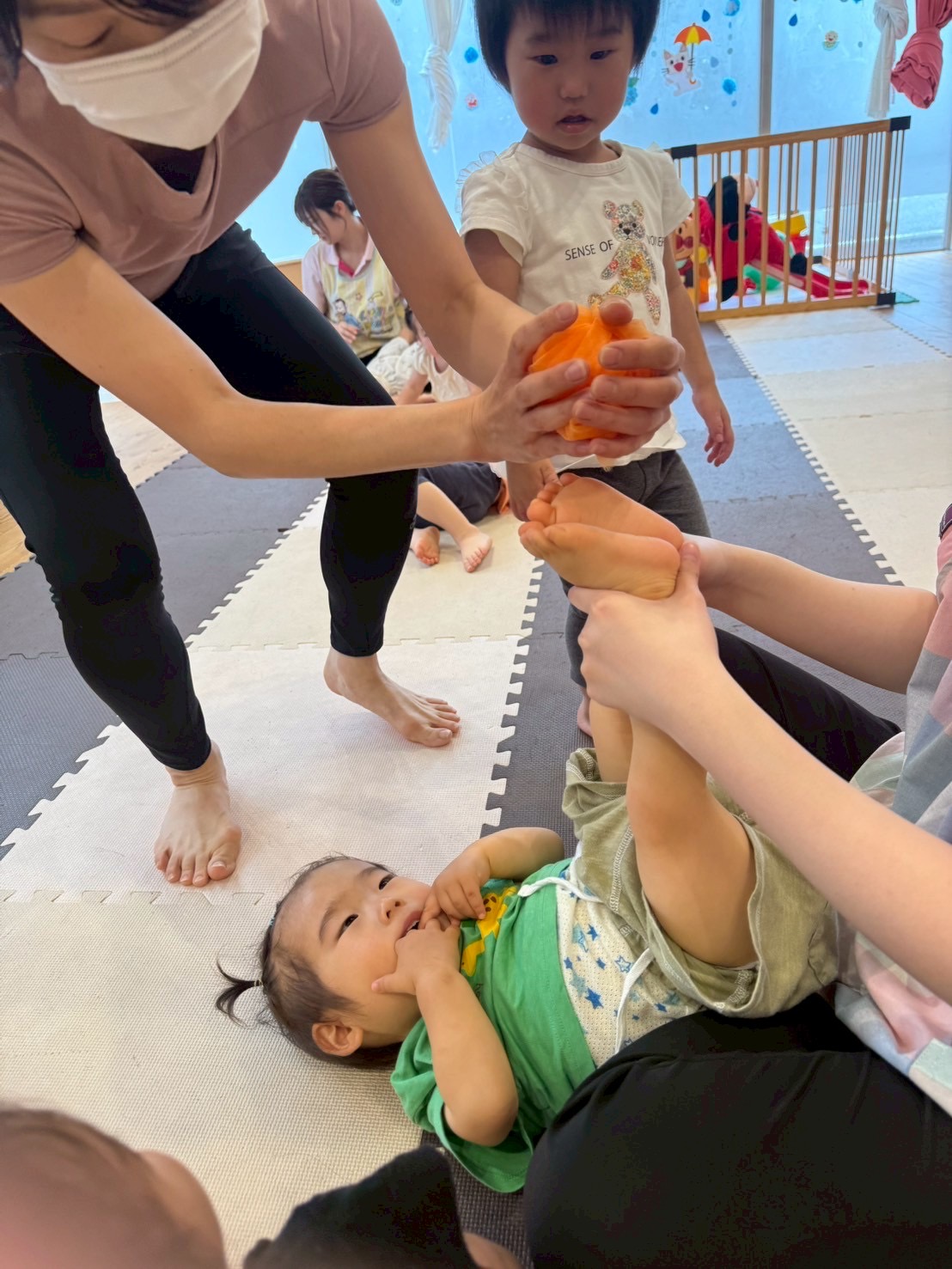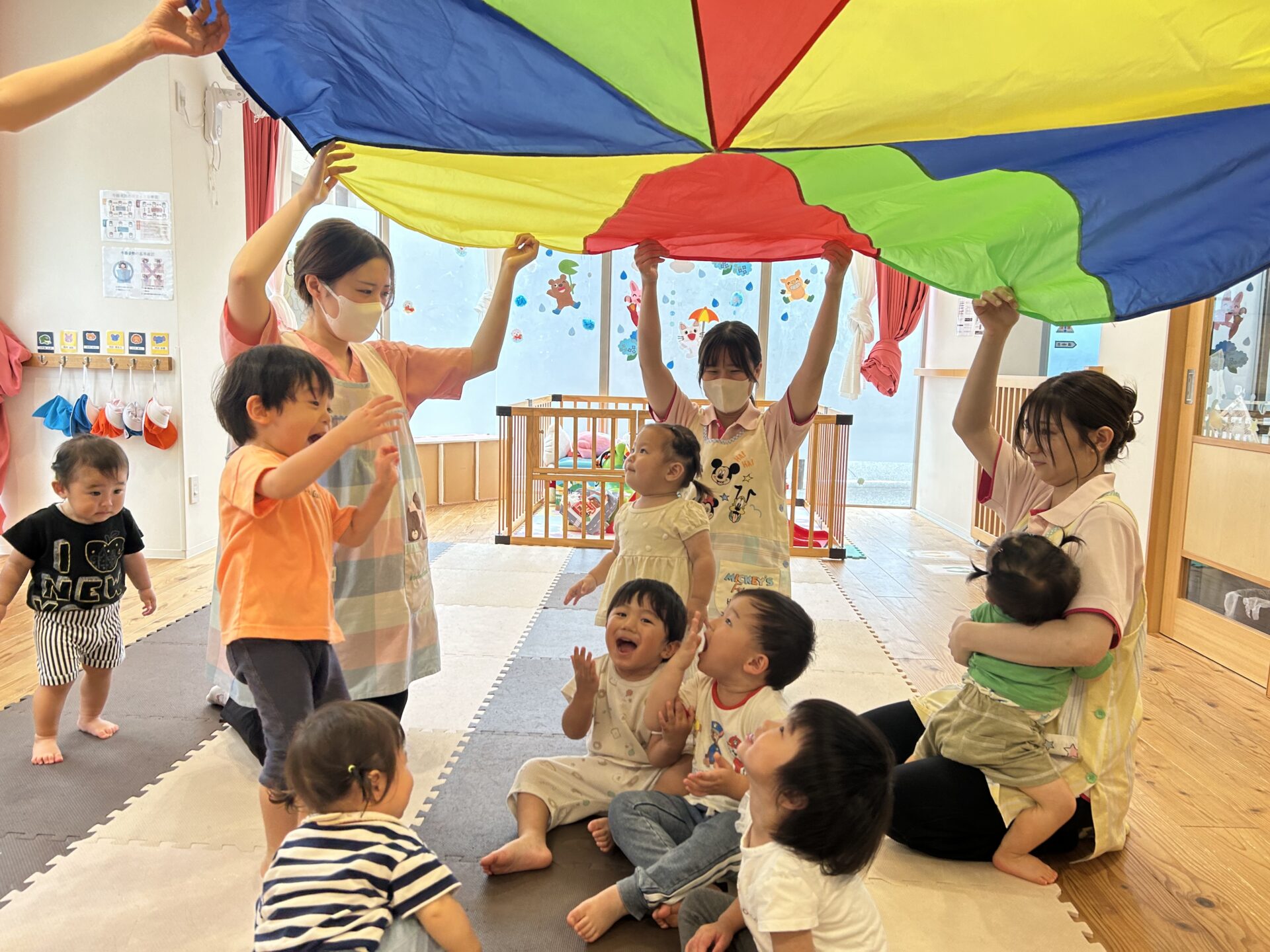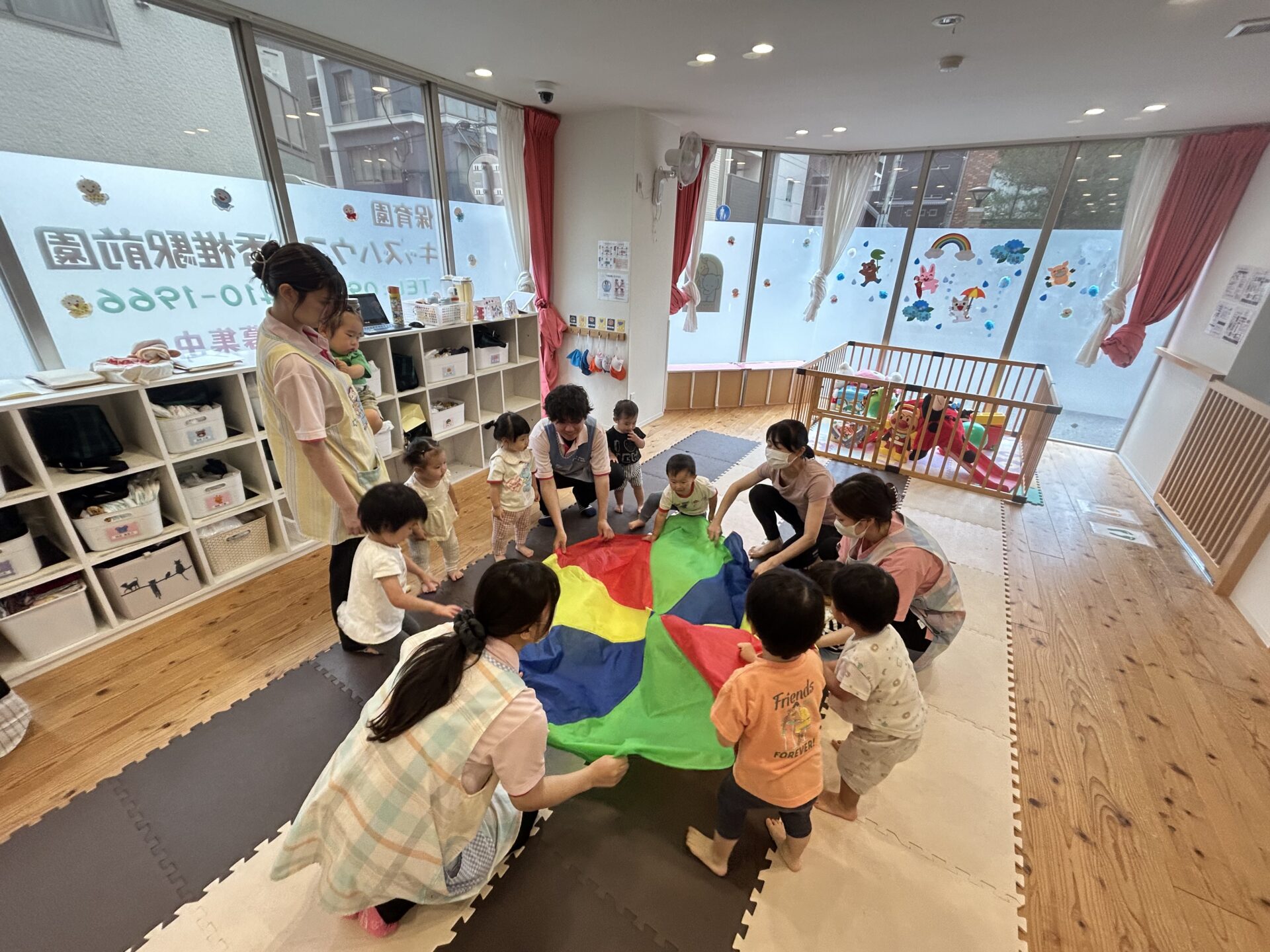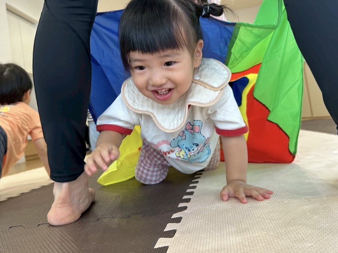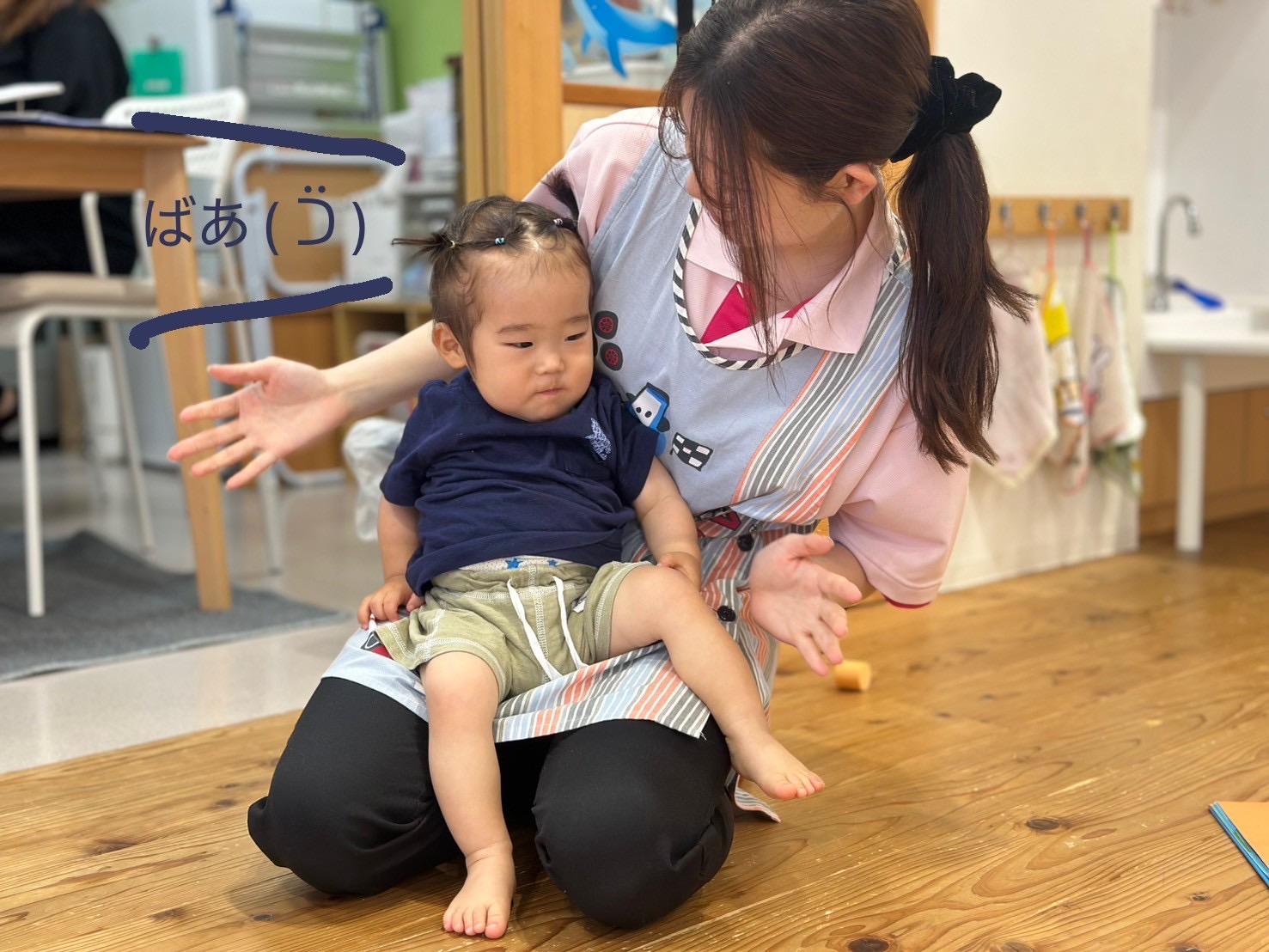 みんなで端を持ってくるくる回ってみたり、先生たちに「ピカブー」をしてもらい布の下に隠れたりと🤭✨