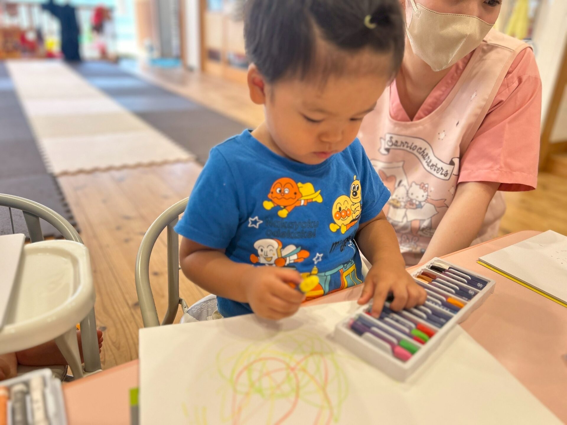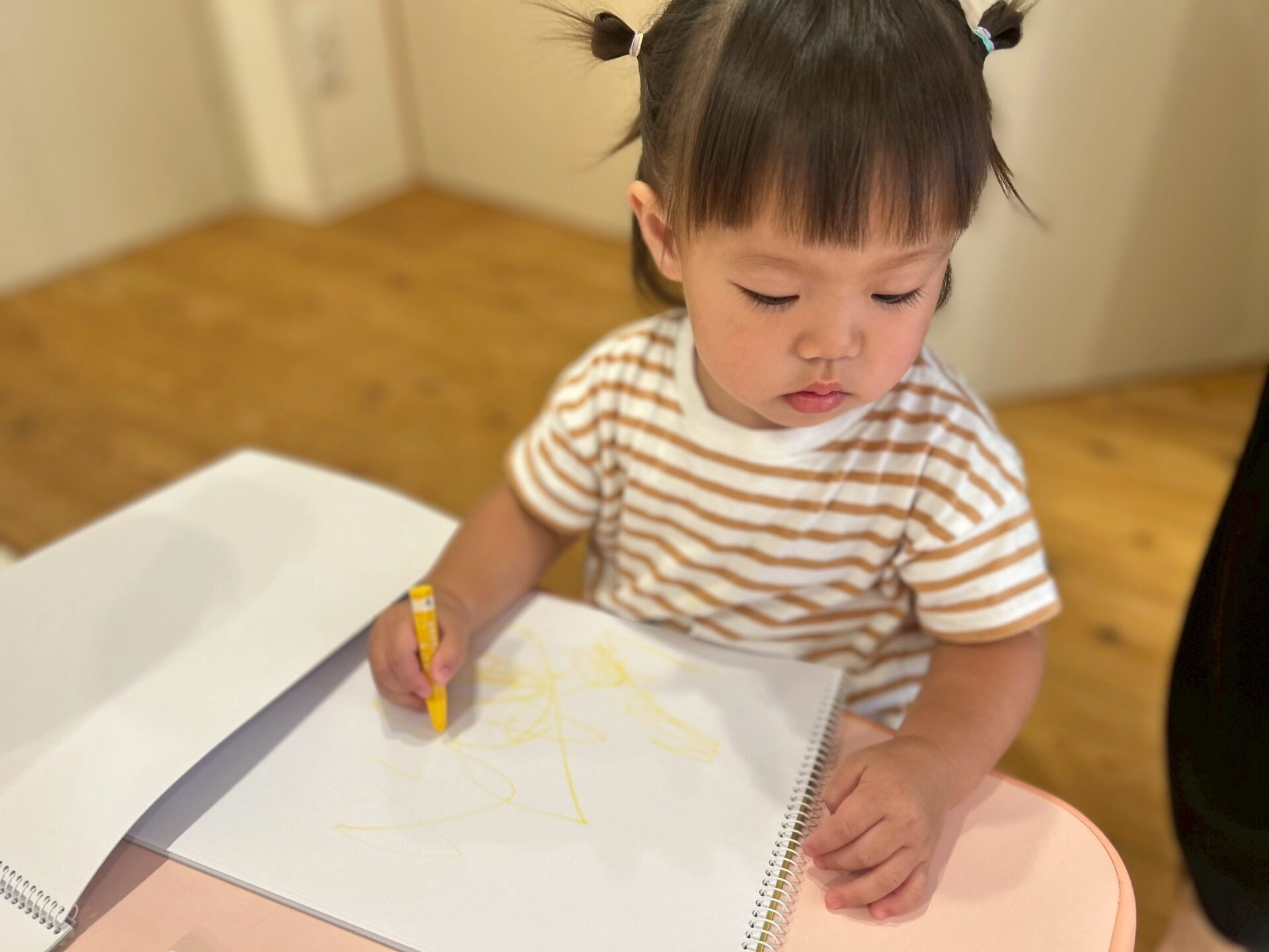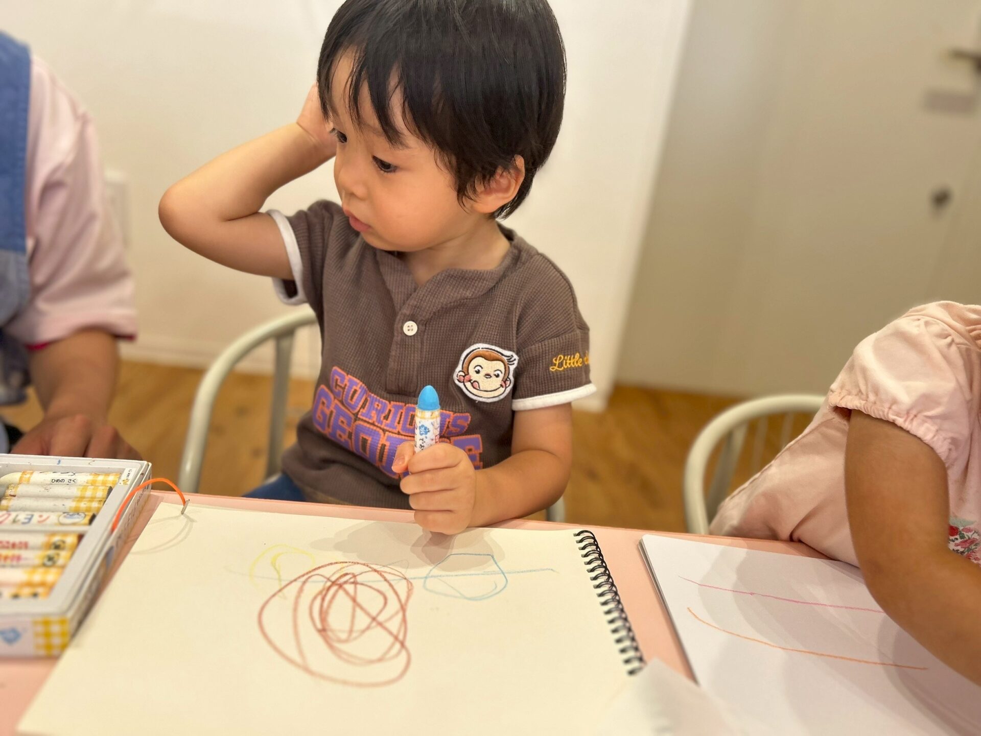 お外に出る前にクレヨンと自由帳を出してお絵描きをしました🖍 自分でクレヨンを持って殴り描きや丸を描いたりして、自由に描くことを楽しまれていましたよ🎨✍