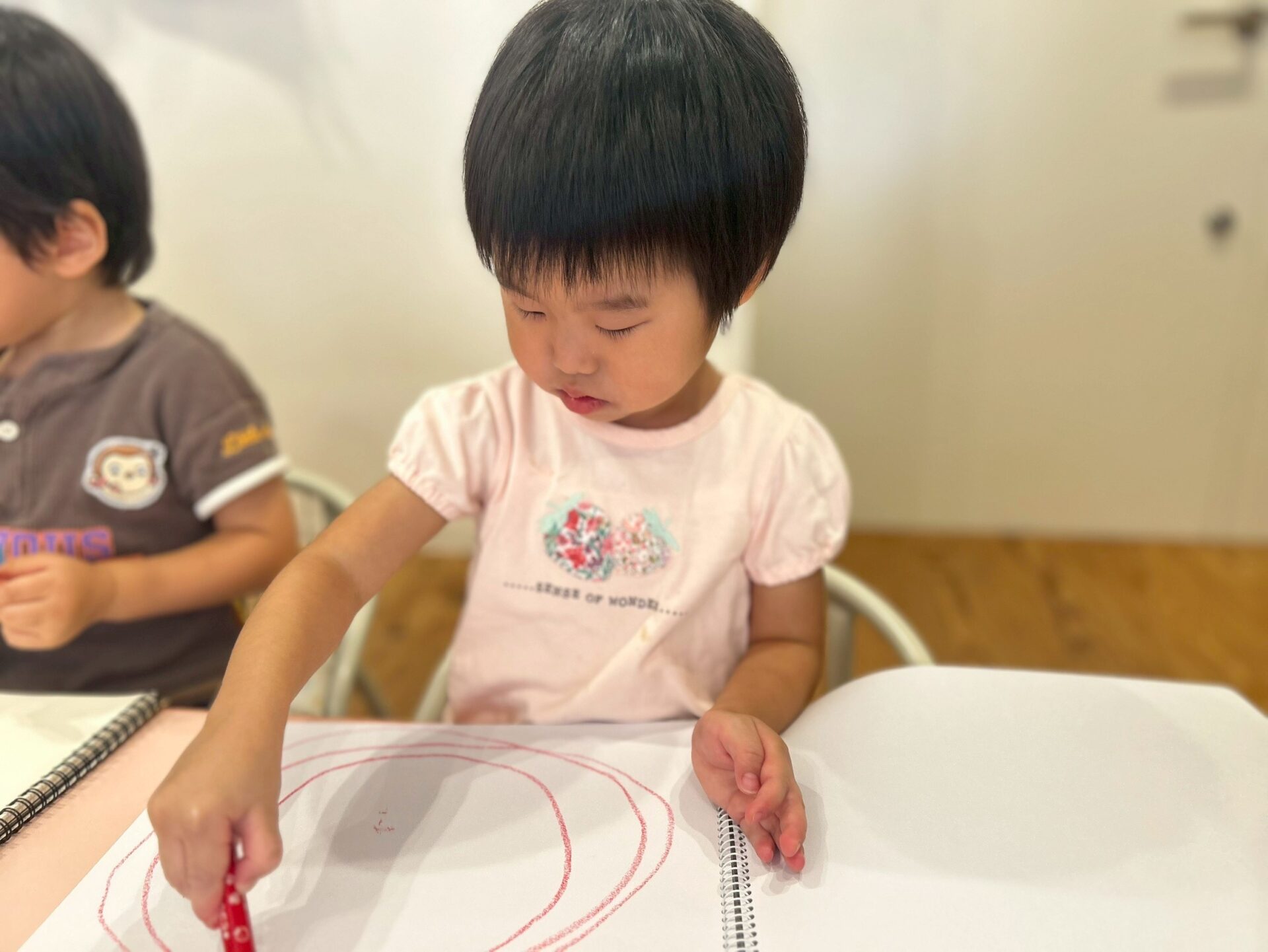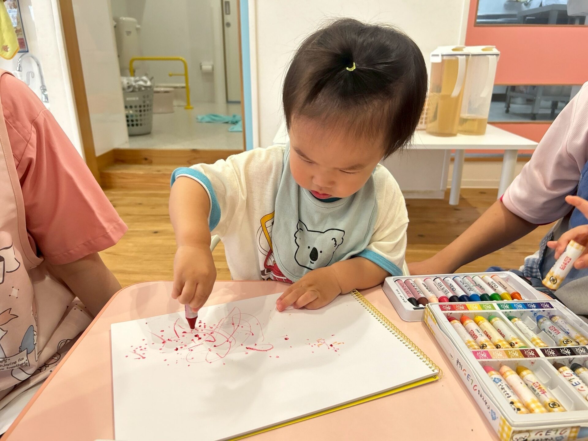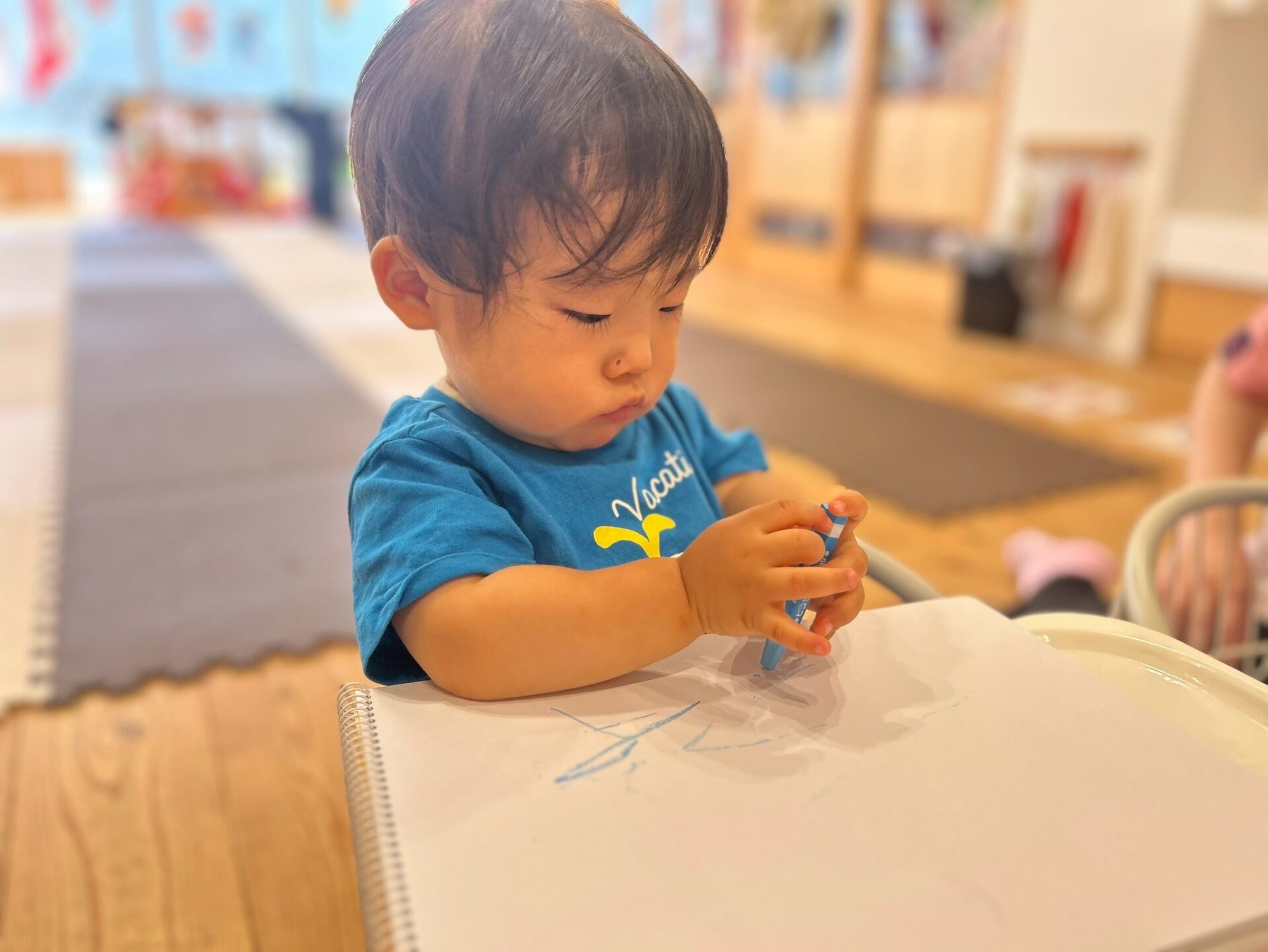 お外に出る前にクレヨンと自由帳を出してお絵描きをしました🖍 自分でクレヨンを持って殴り描きや丸を描いたりして、自由に描くことを楽しまれていましたよ🎨✍