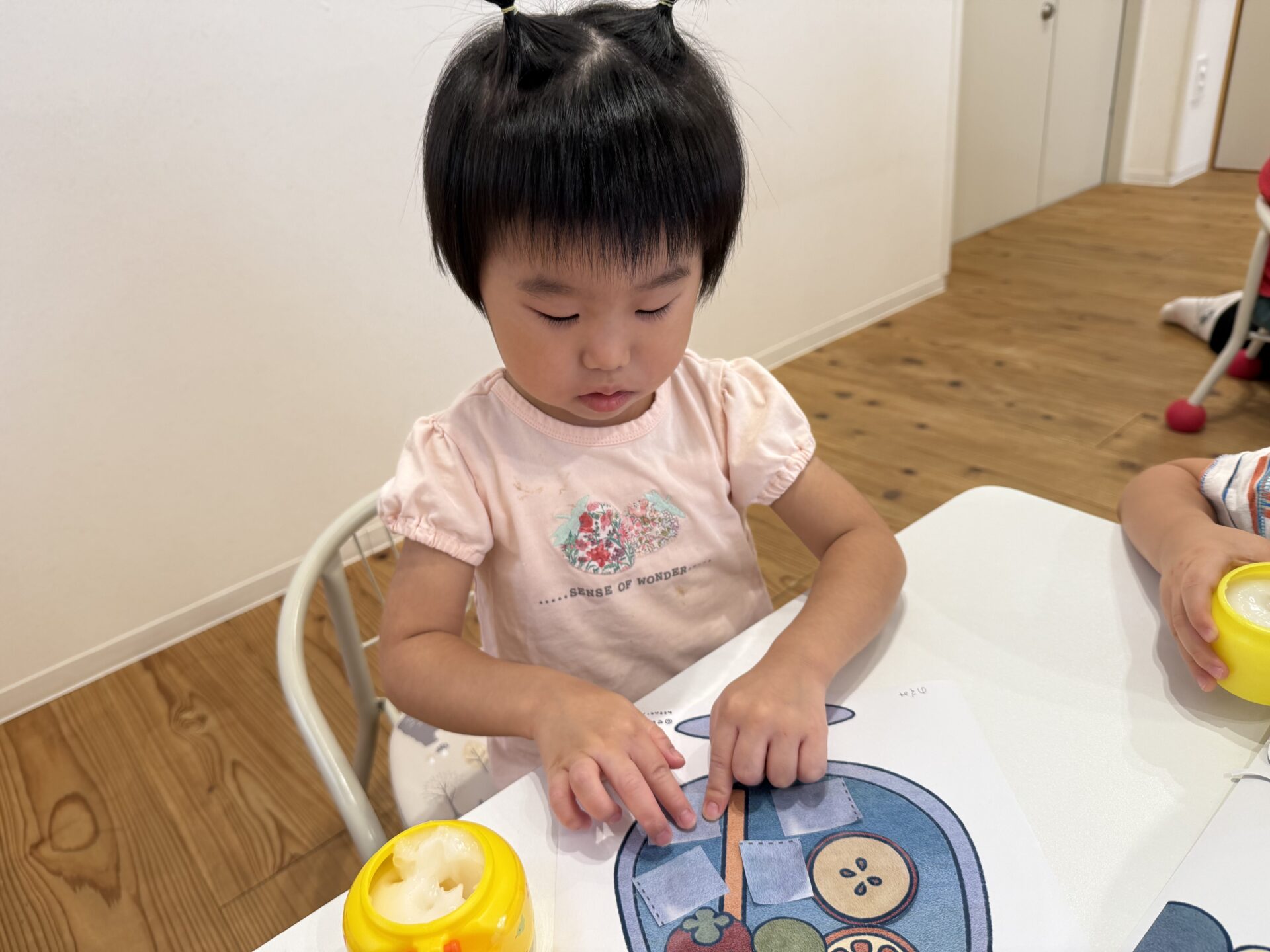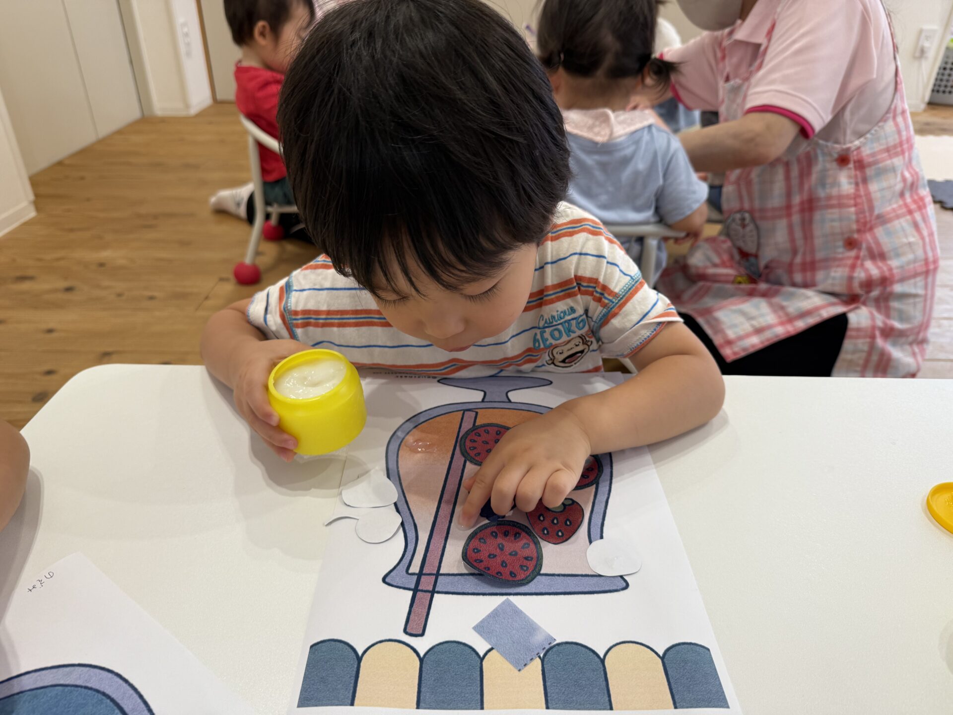 のりを使ったお友達はのりの感触を不思議に感じながら嫌がることなく、楽しんで上手にのりをつけて貼っていましたよ😁✨