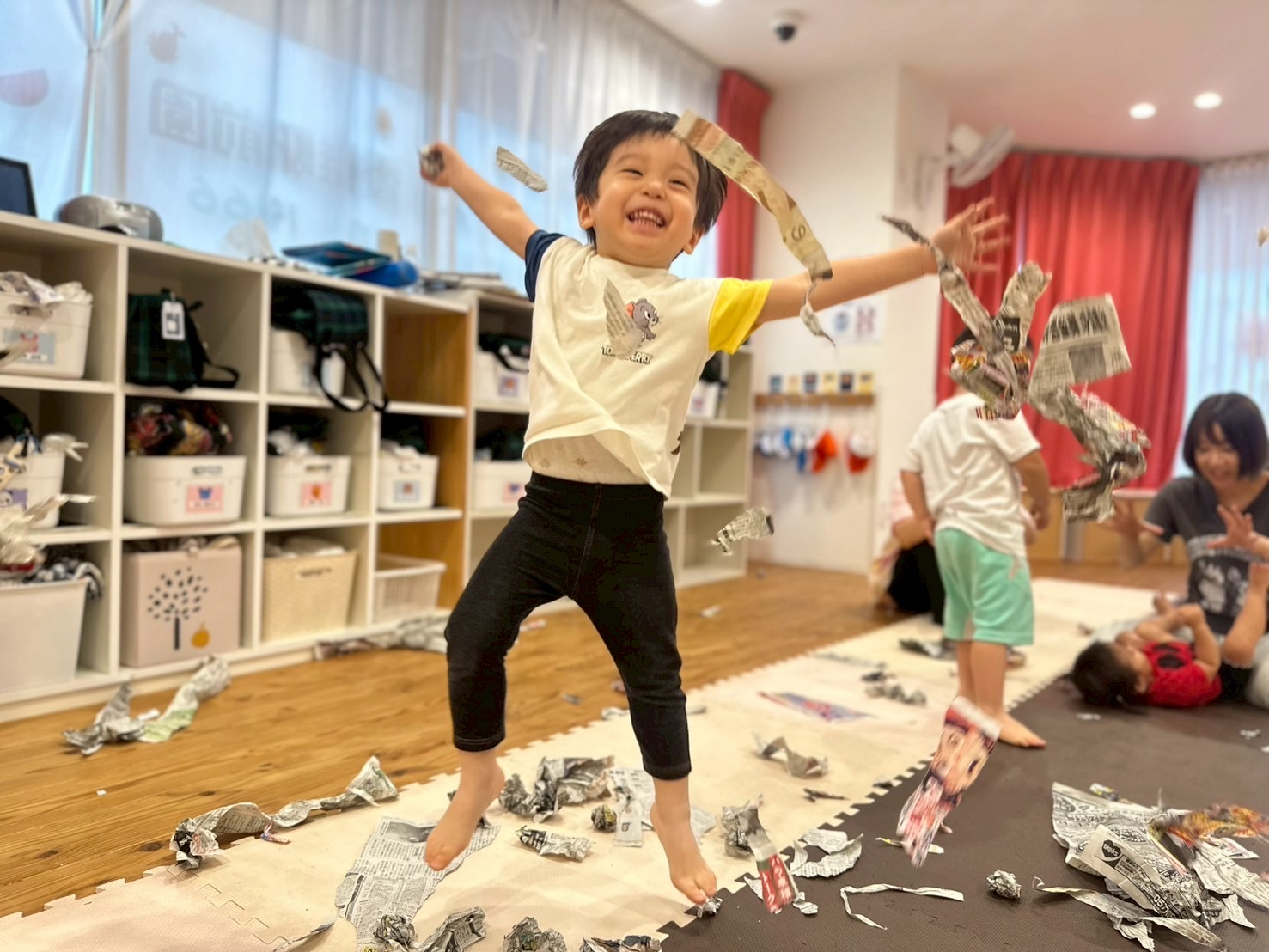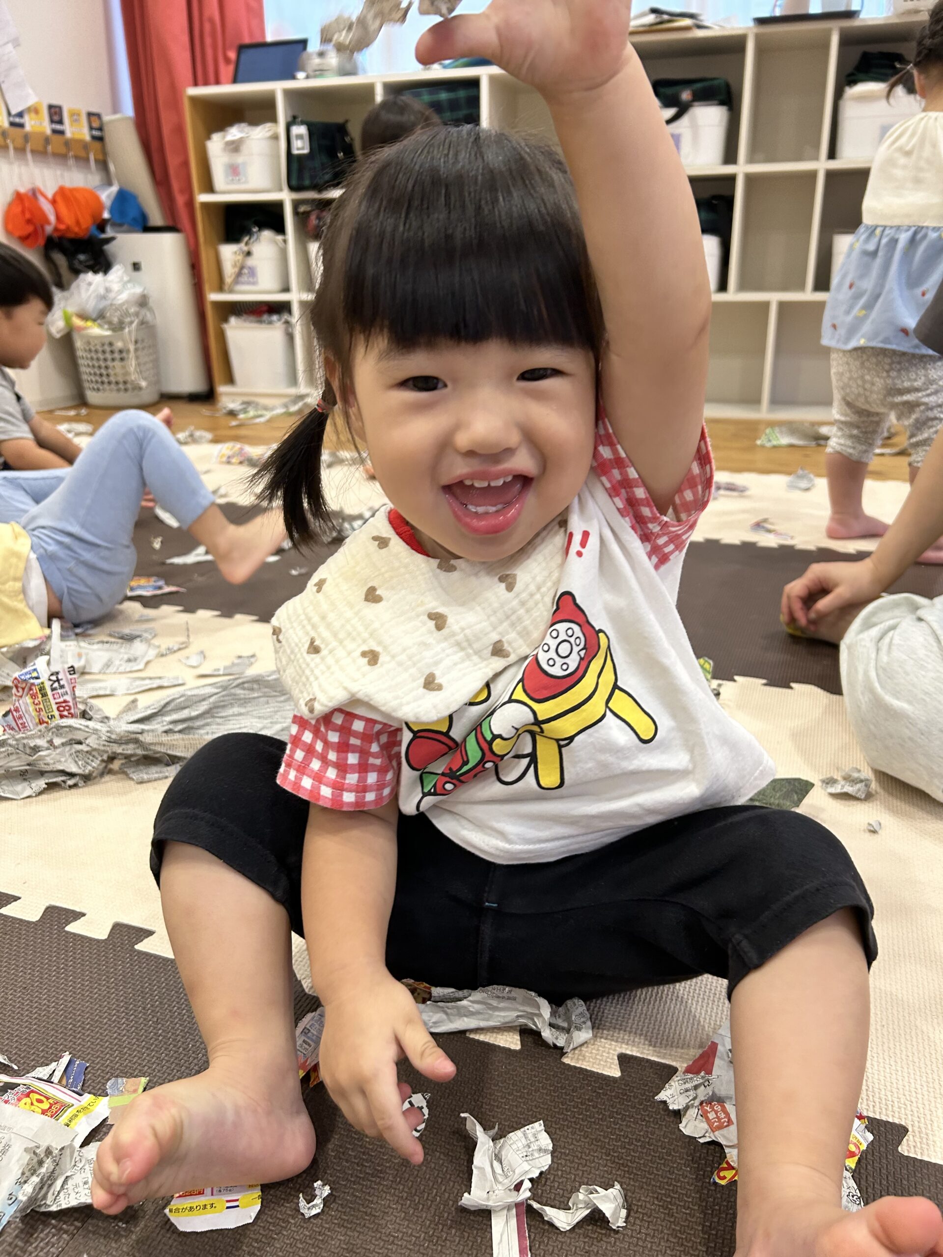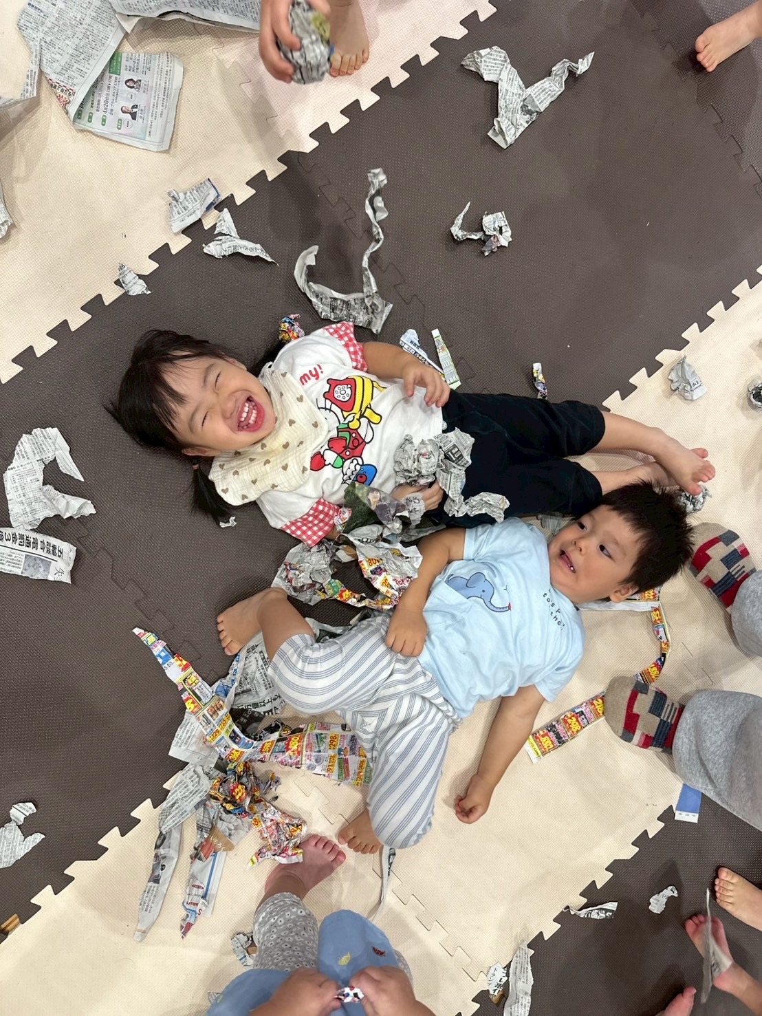 今日はお外が雨だったのでお部屋の中で新聞紙遊びをしています📰 ちぎったり、ギュッと握ってボールを作ったり、紙吹雪をして大喜びする子どもたちです☺️
