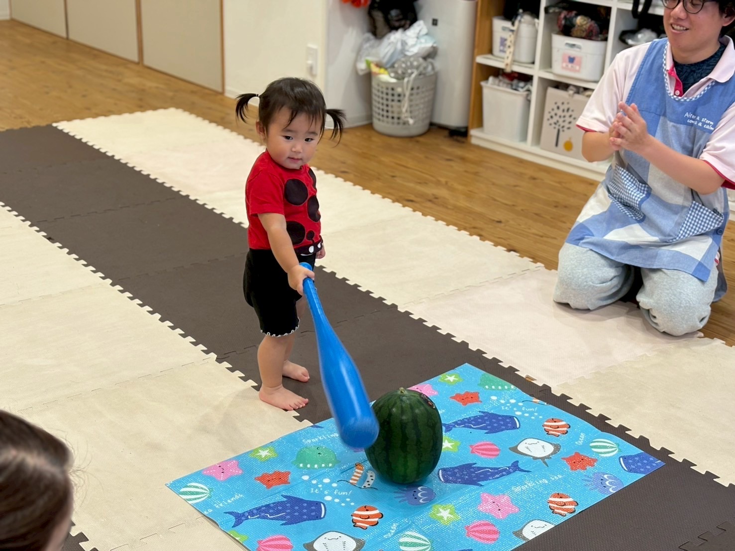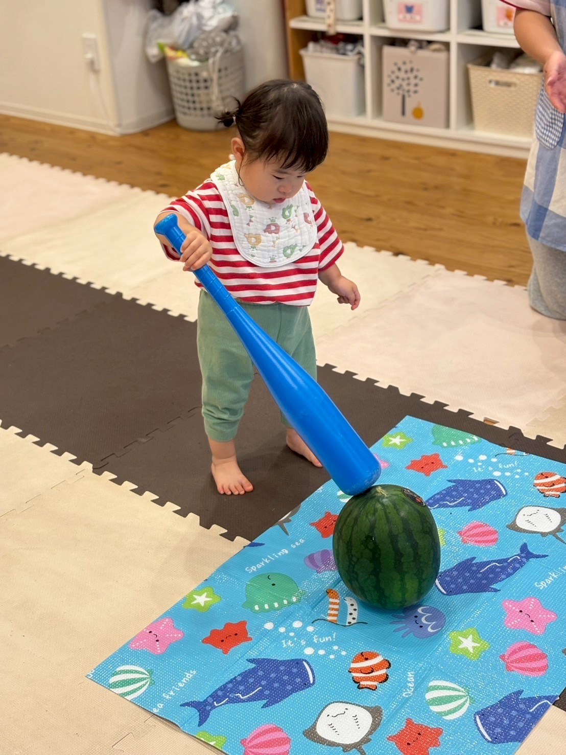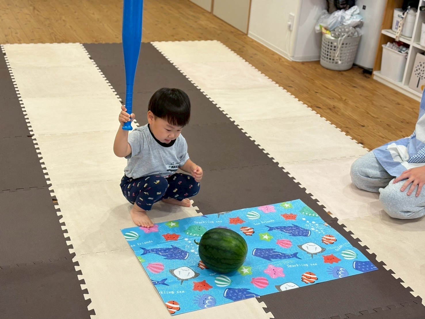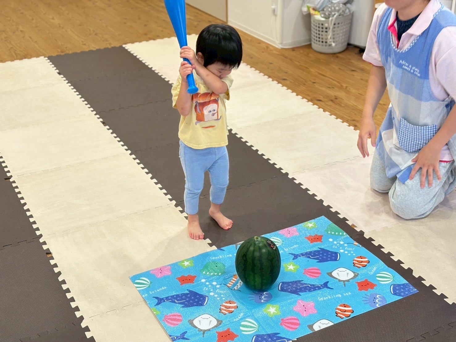 最初は作り物のスイカ割りをしました! バットを持って上手に割ることが出来ていましたよ🎶