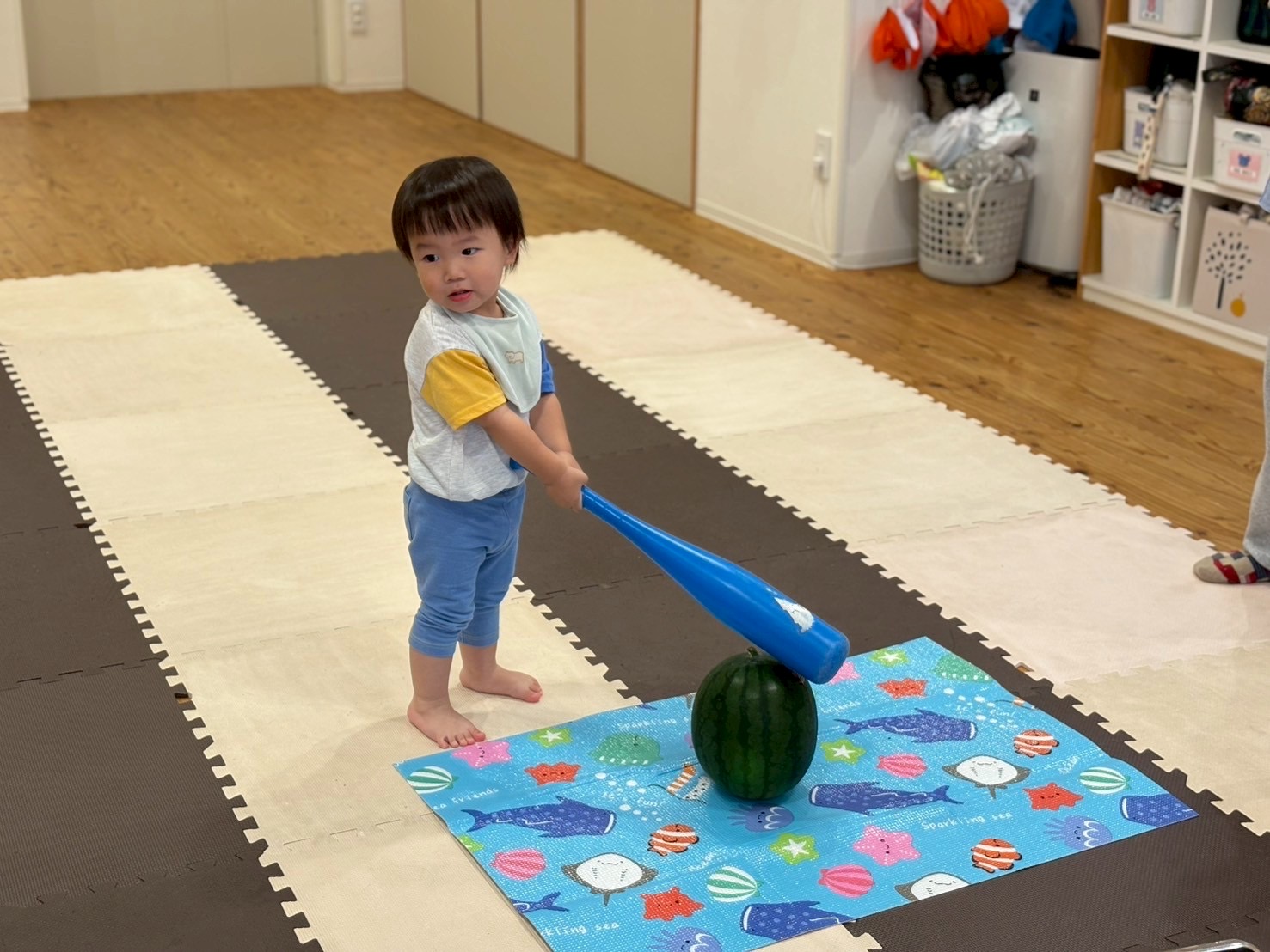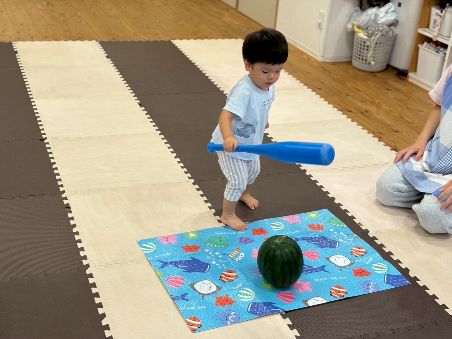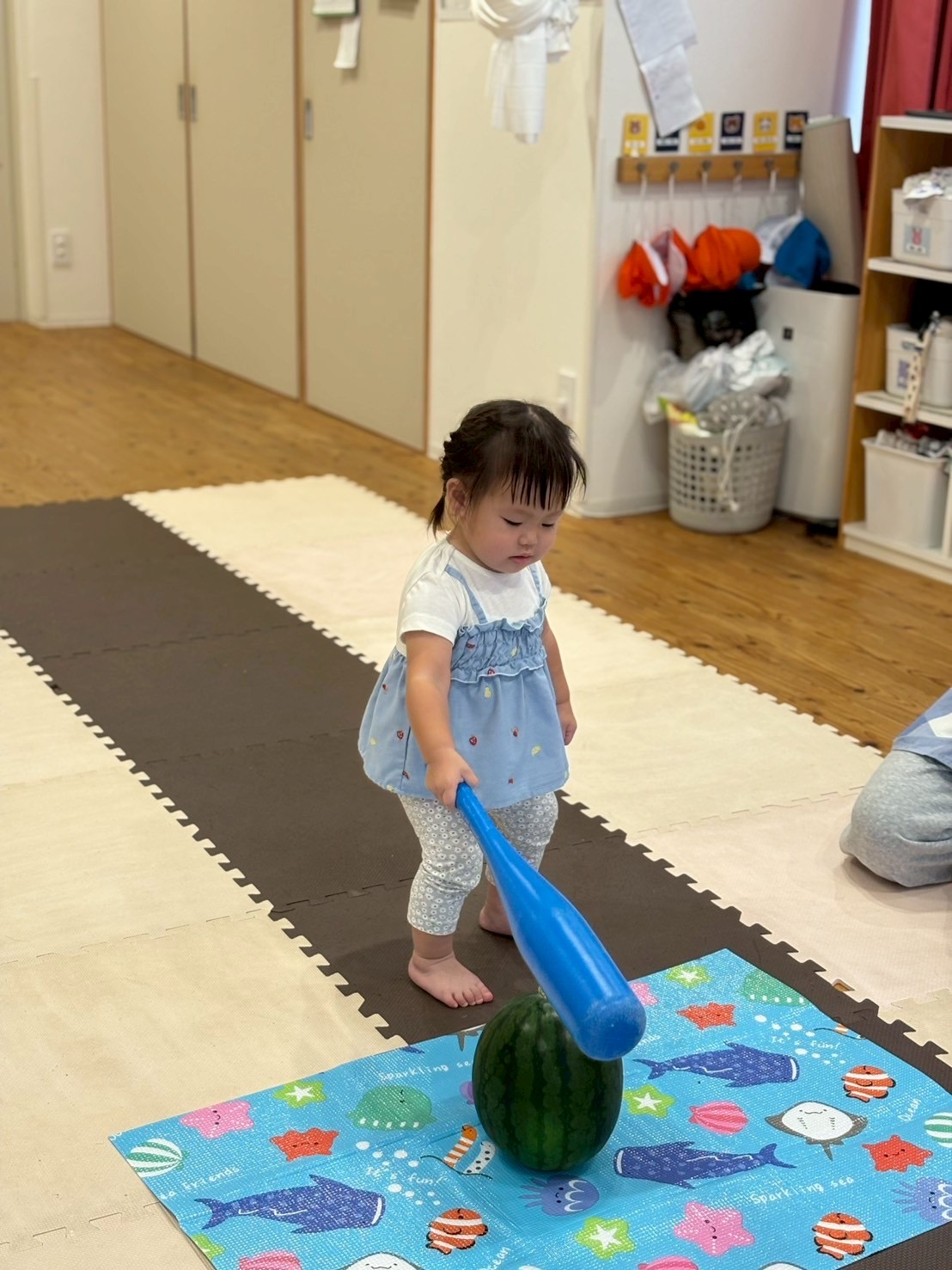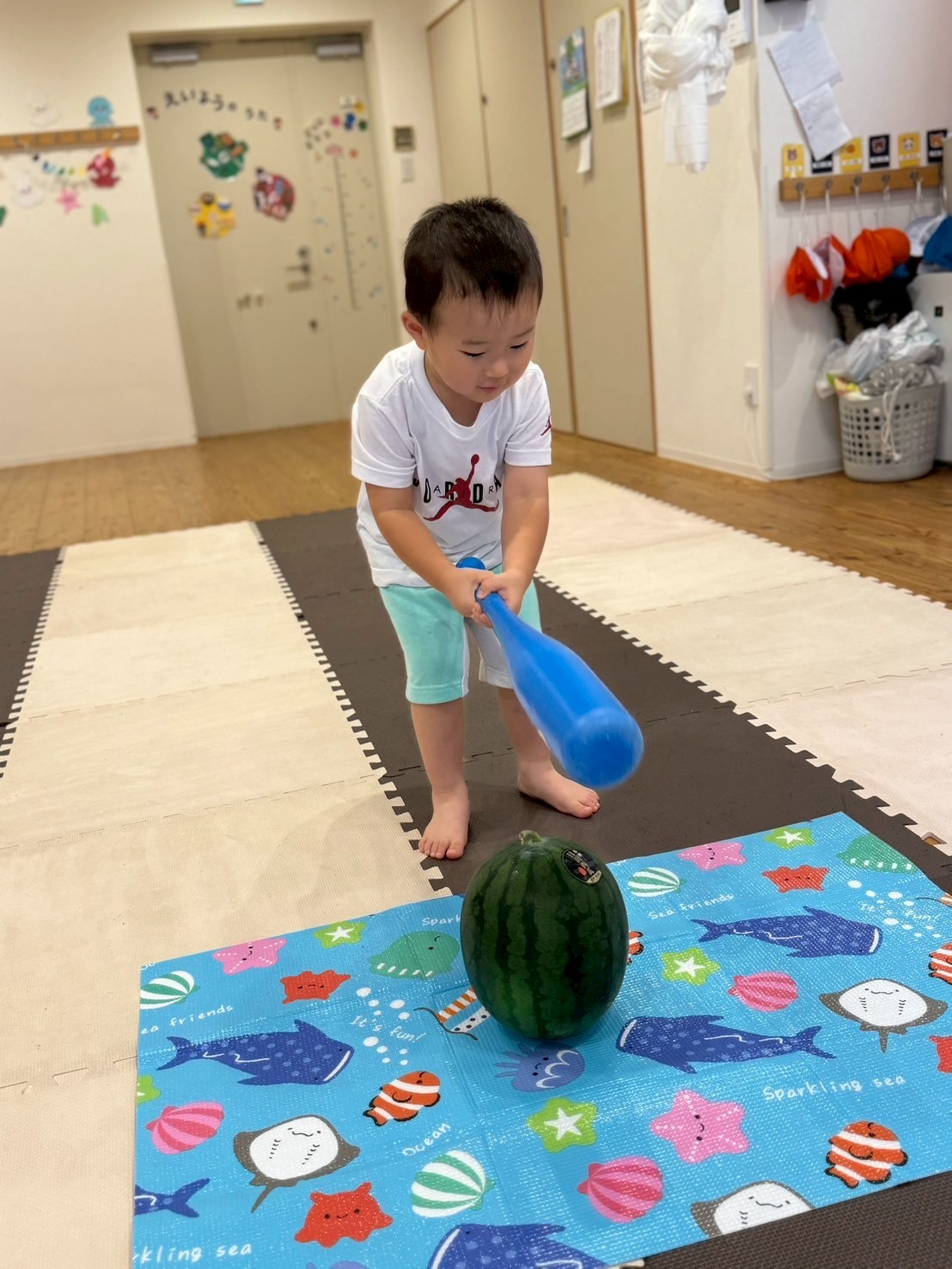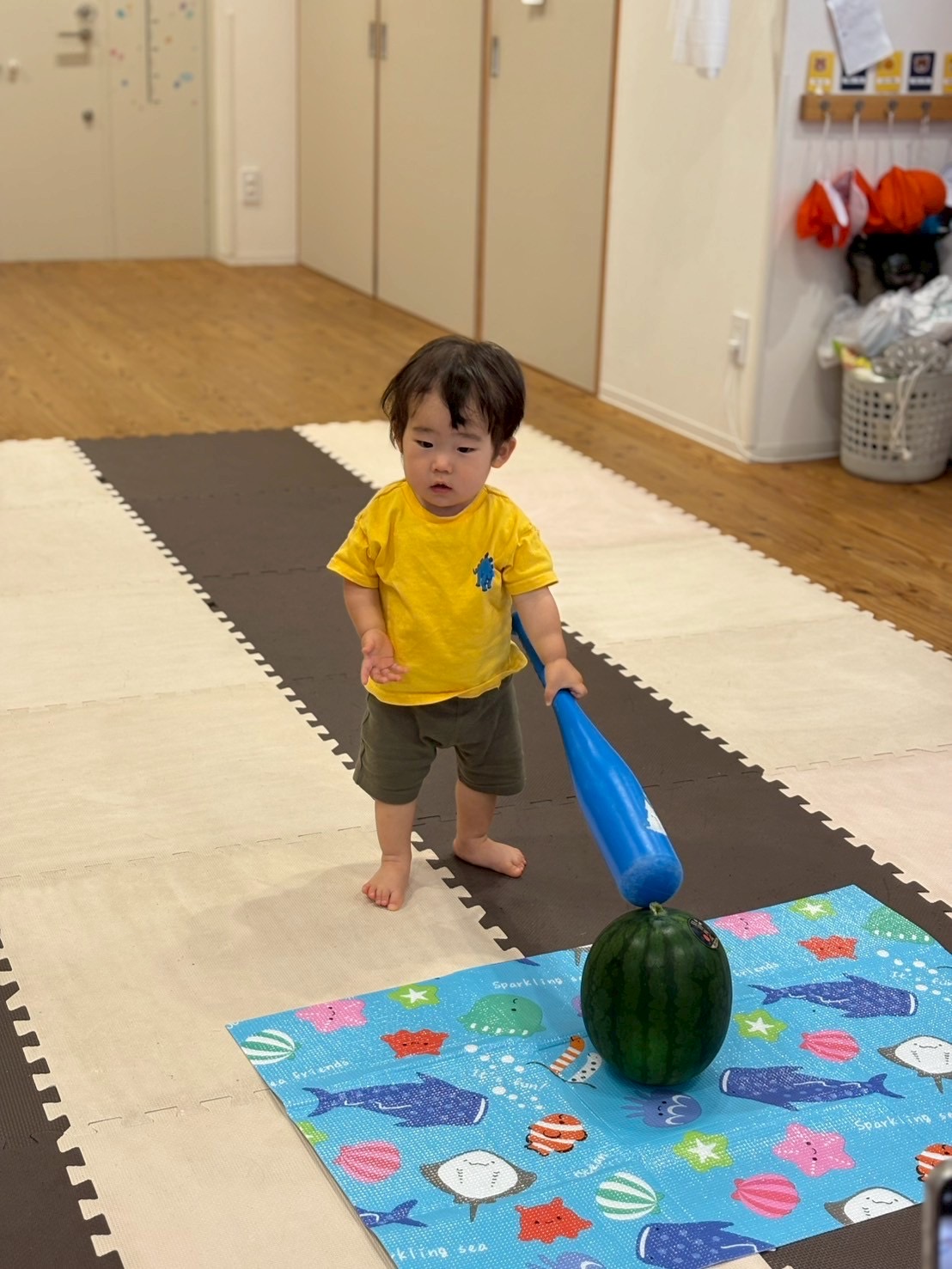 最初は作り物のスイカ割りをしました! バットを持って上手に割ることが出来ていましたよ🎶