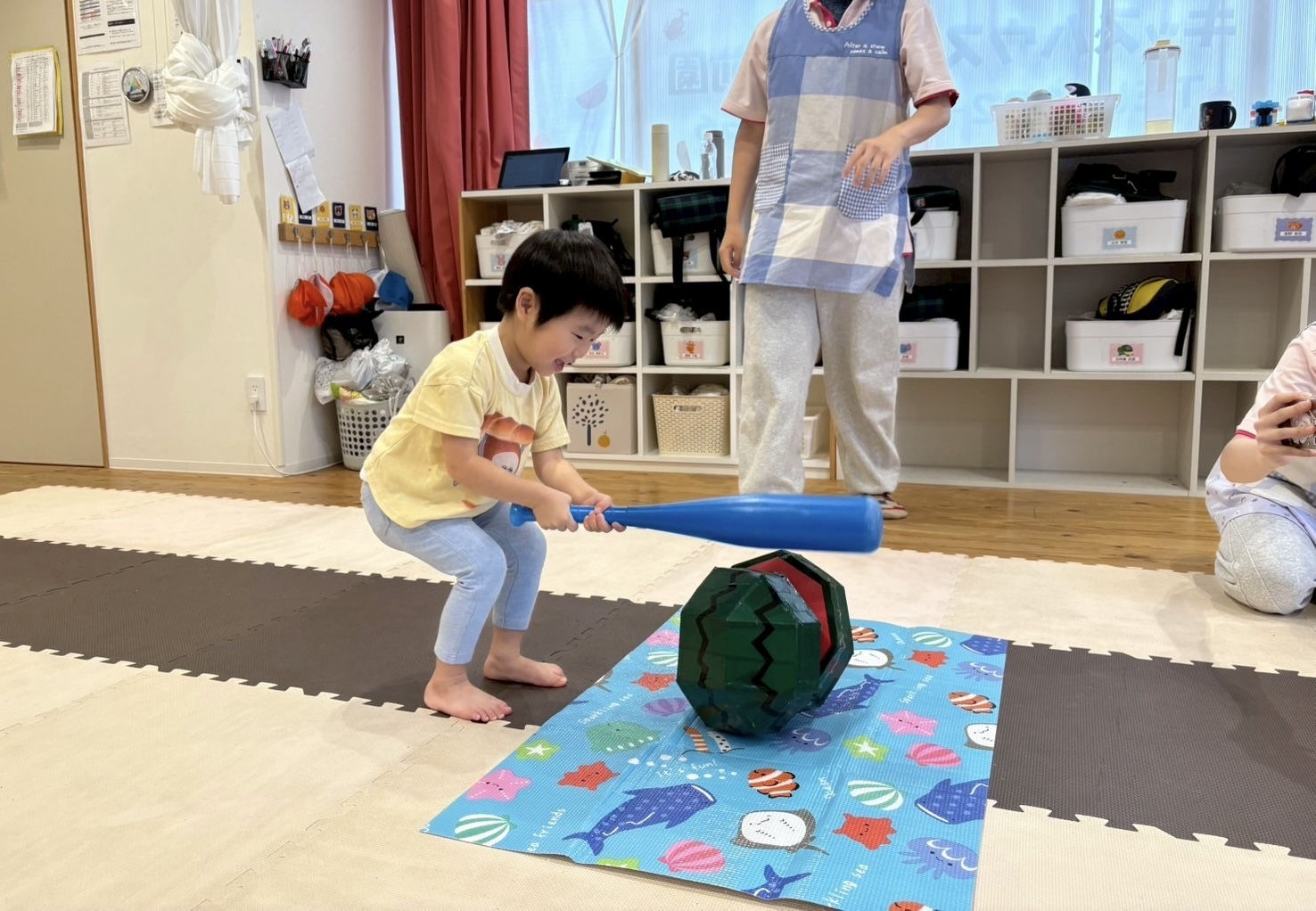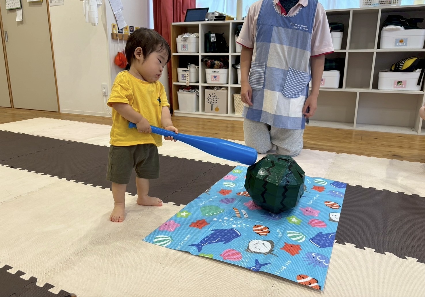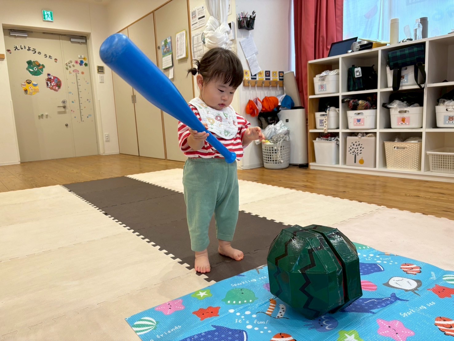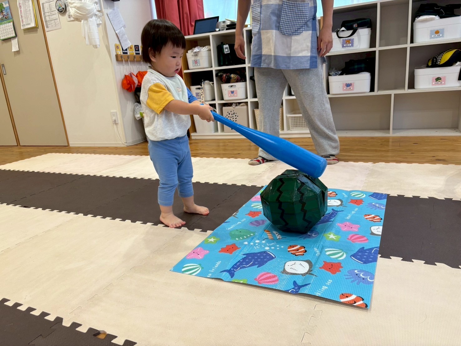 最初は作り物のスイカ割りをしました! バットを持って上手に割ることが出来ていましたよ🎶