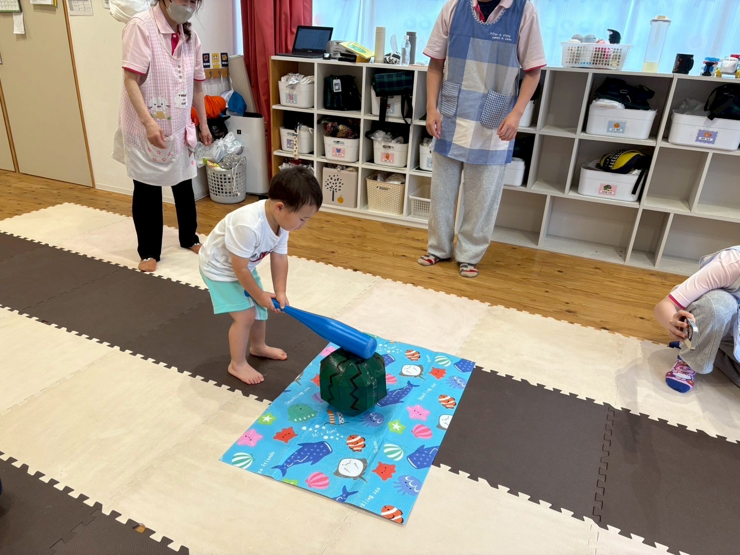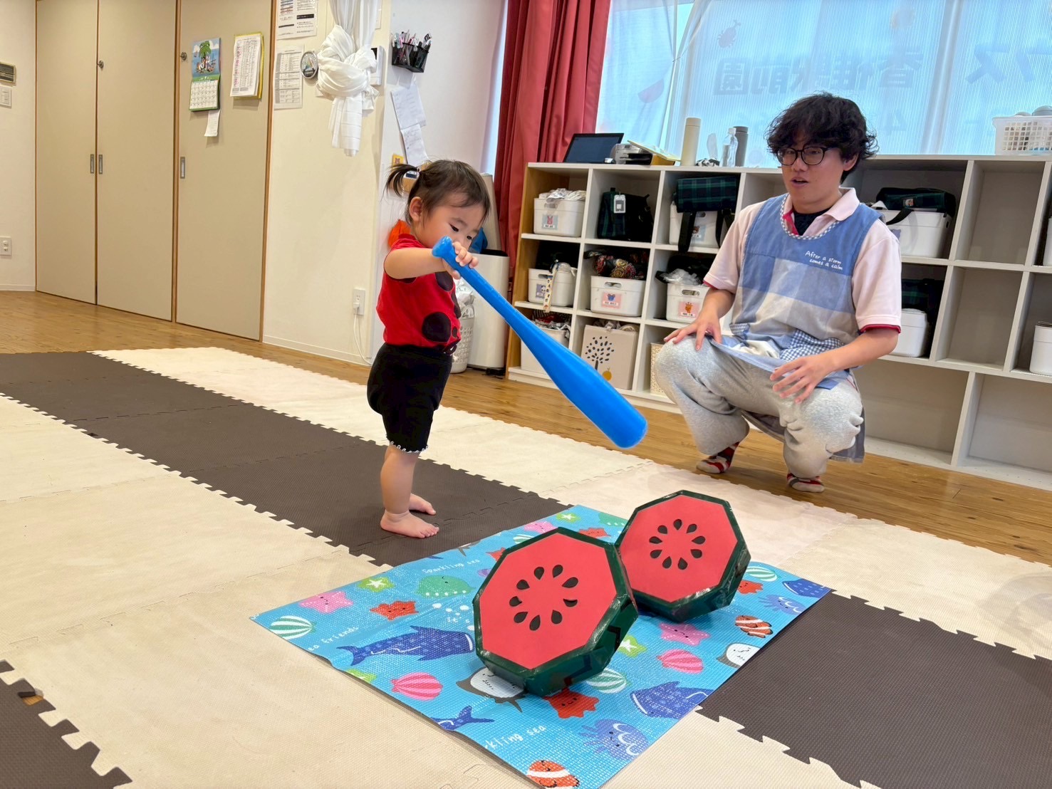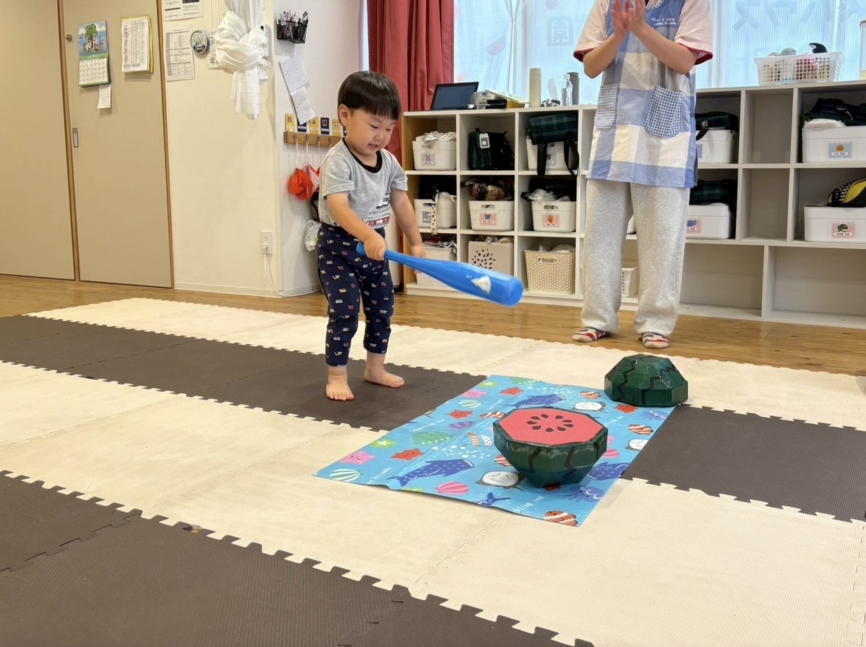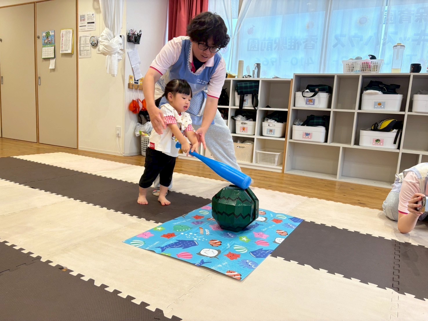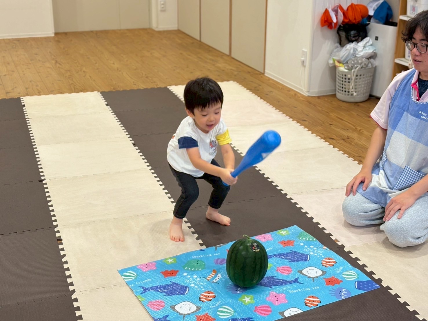 最初は作り物のスイカ割りをしました! バットを持って上手に割ることが出来ていましたよ🎶