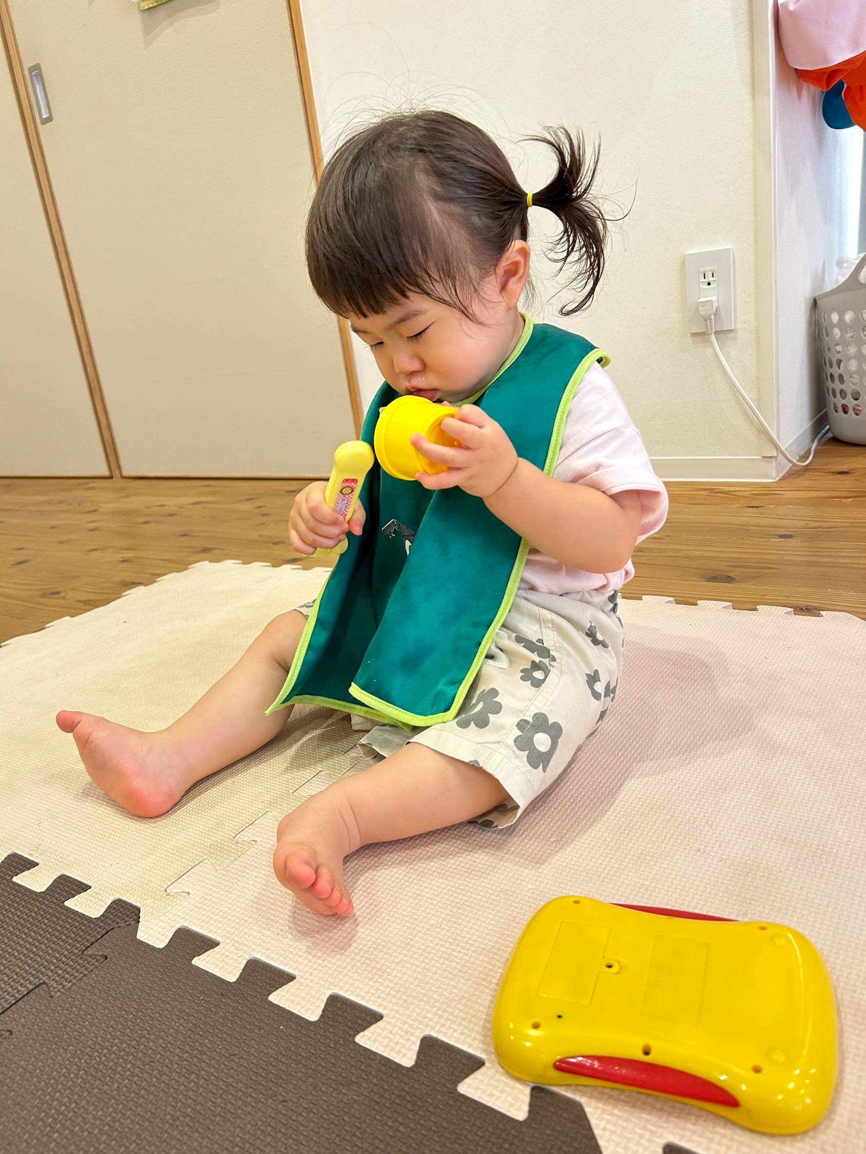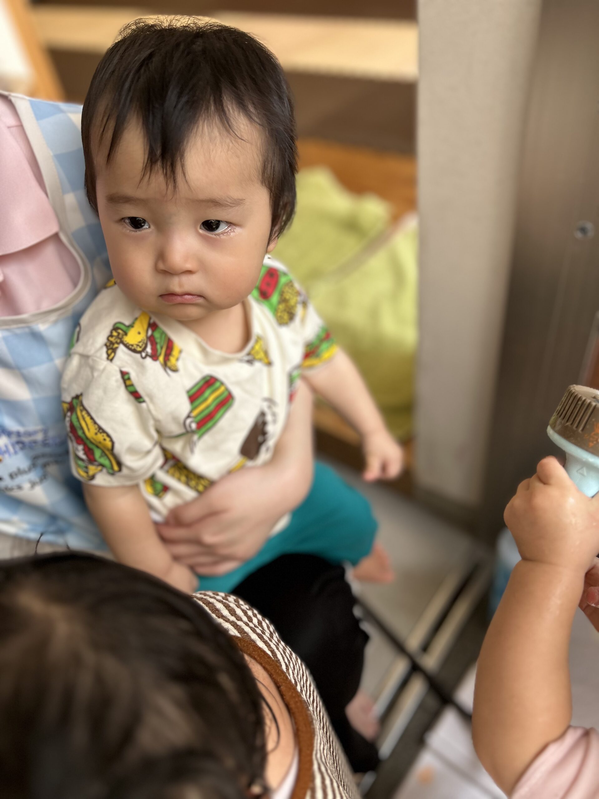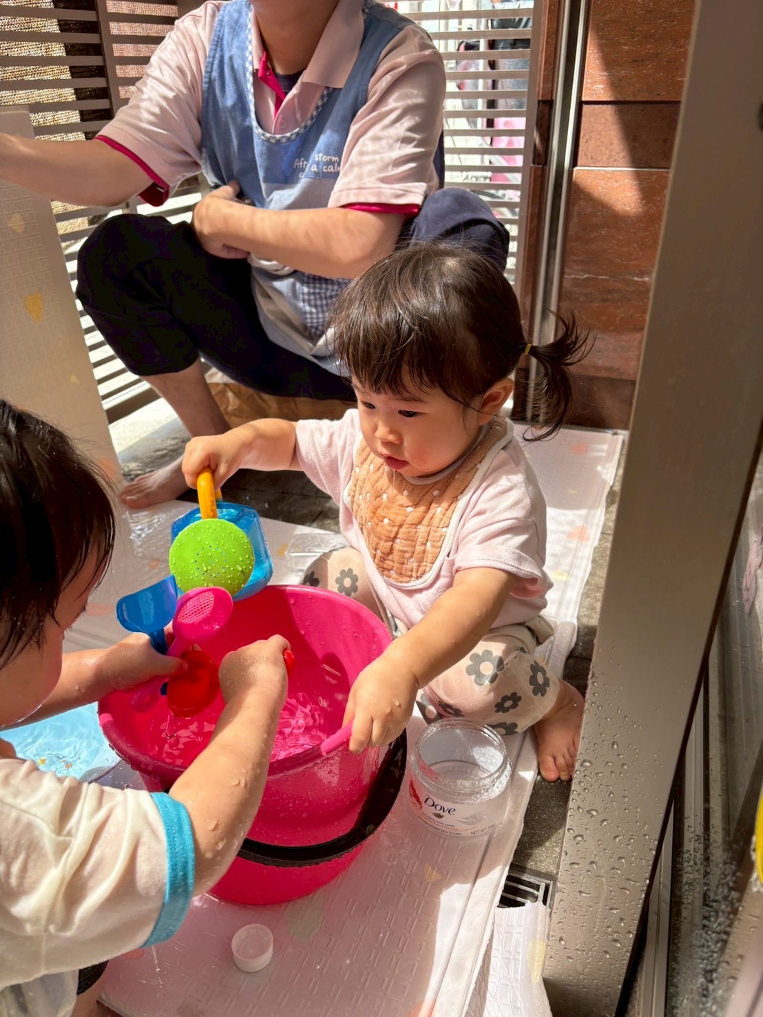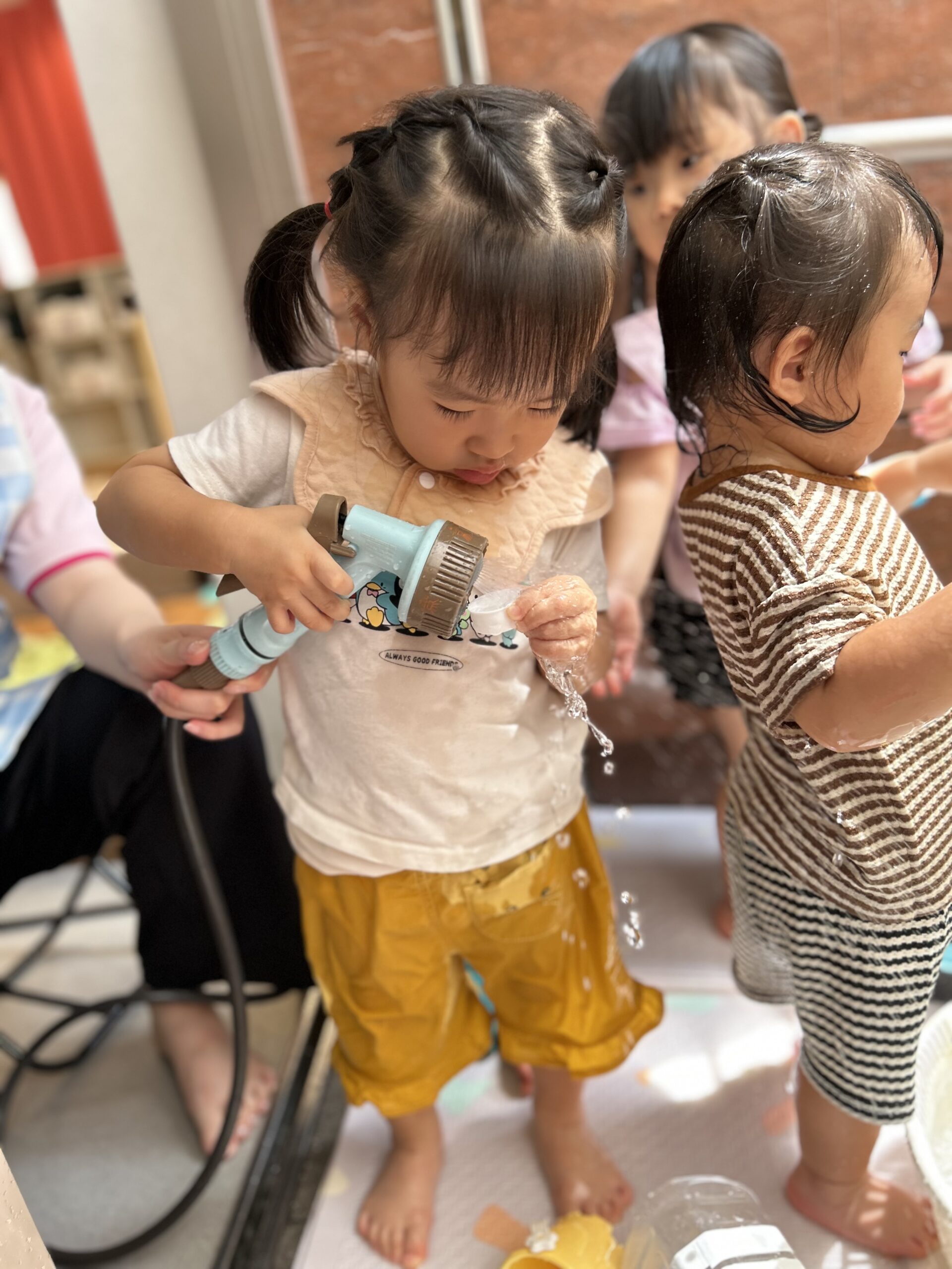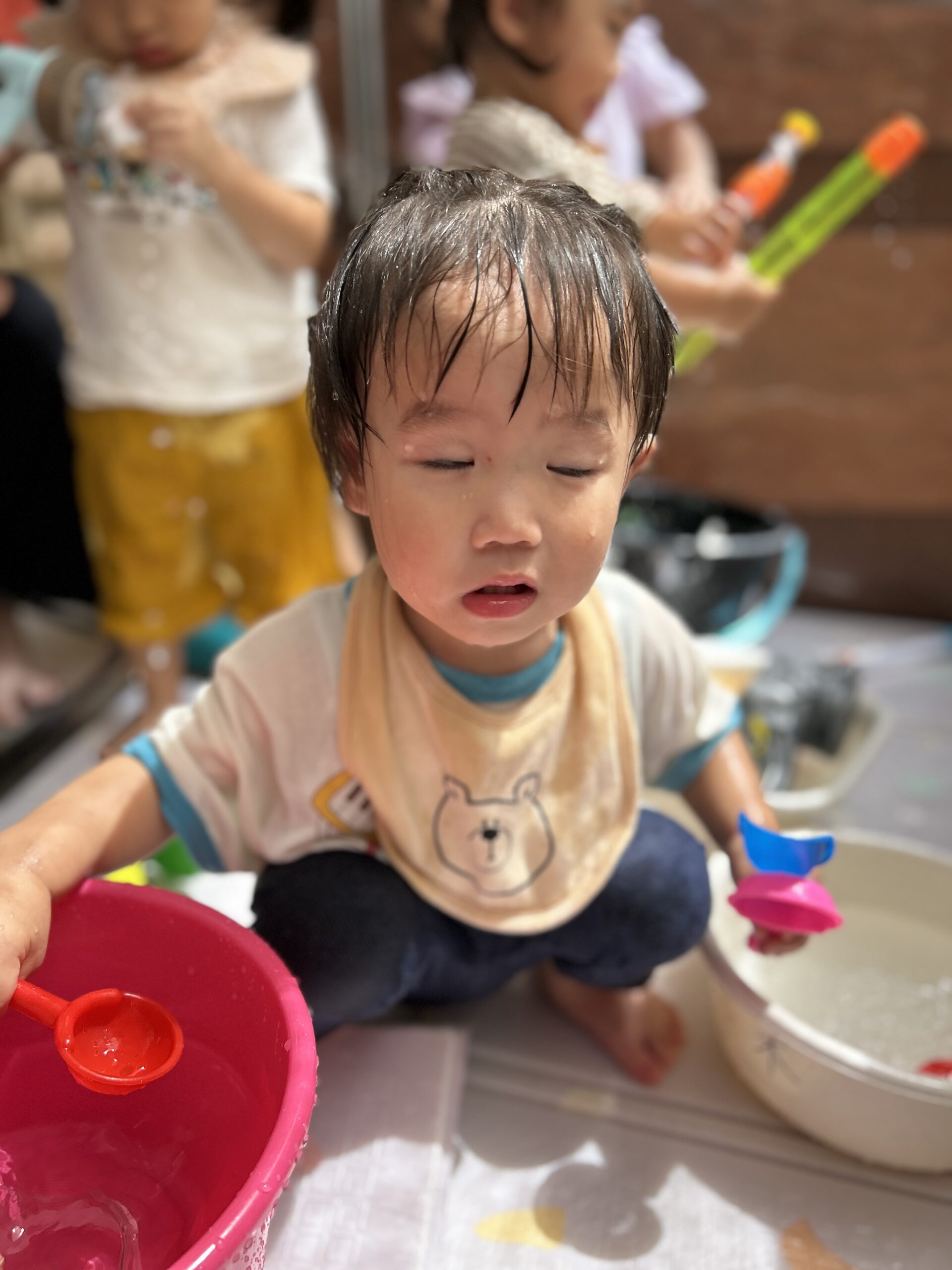 バケツに水をくんだり、水鉄砲で飛ばしたり、氷を触って冷たい感触を確かめたりして、自分の好きな遊びをして満喫されてます🥹