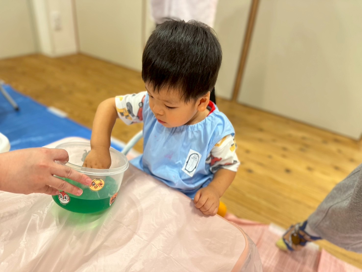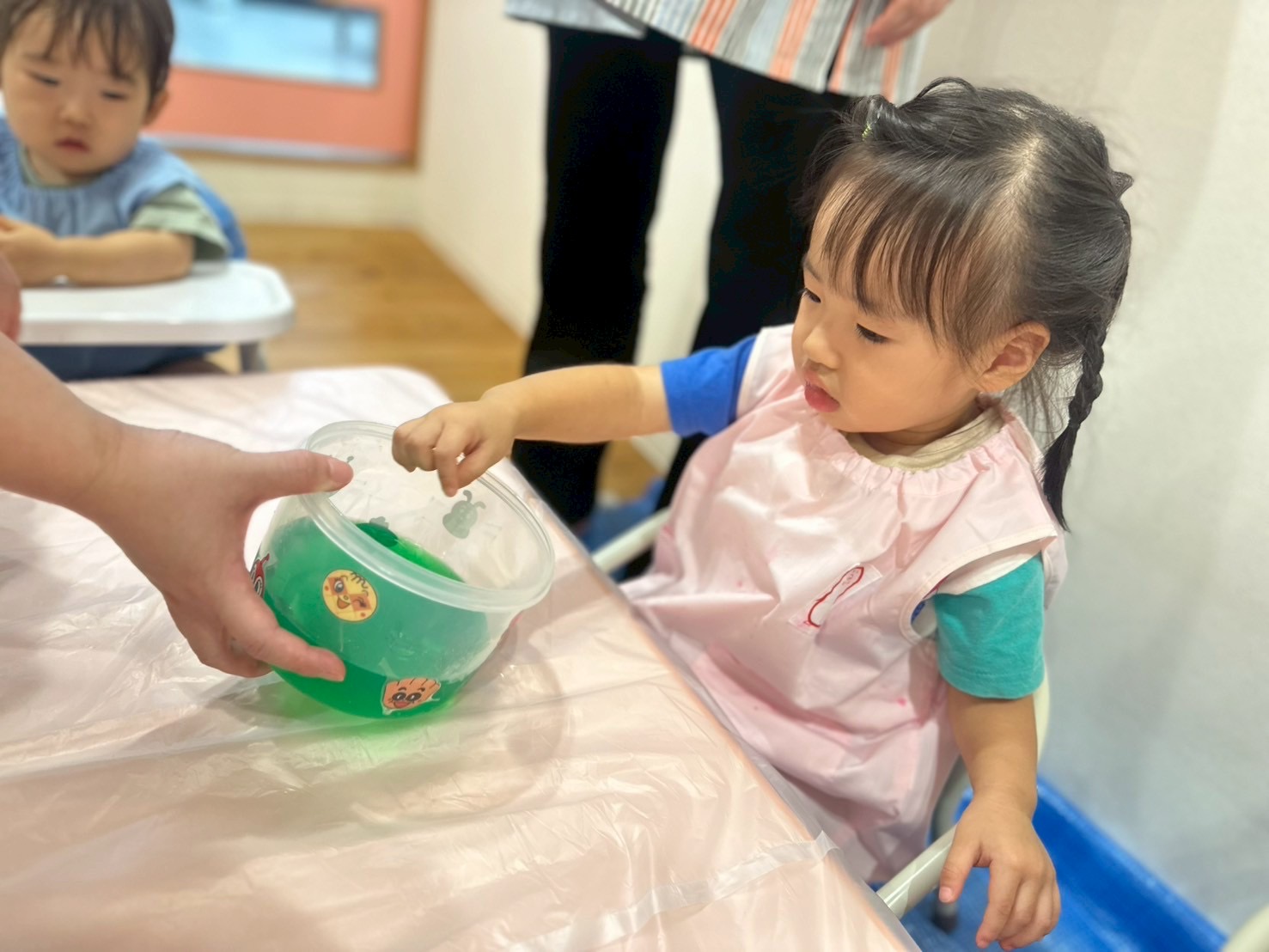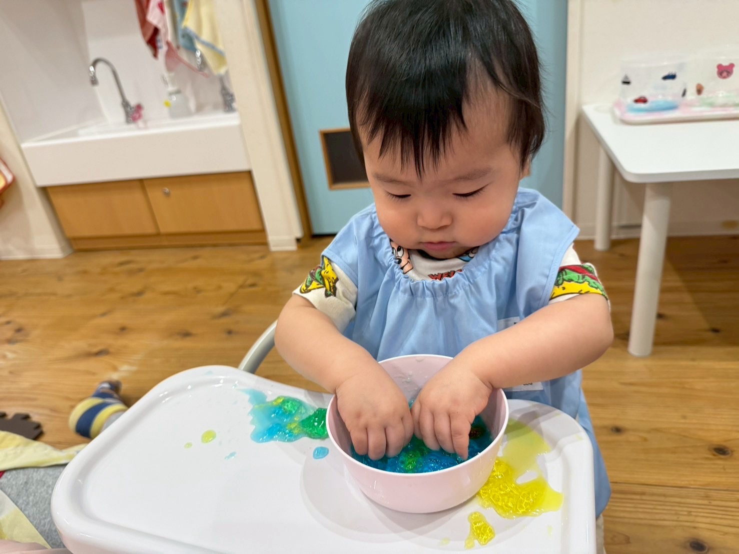 感触遊びで寒天ゼリーを触って遊びました✨️