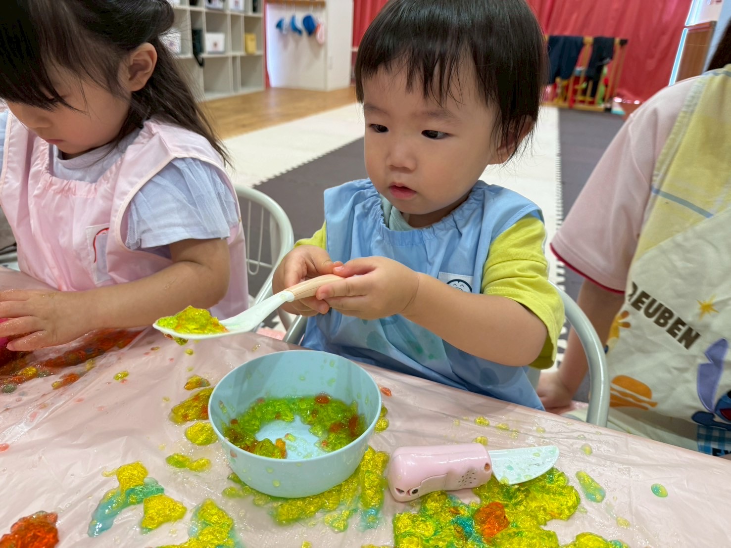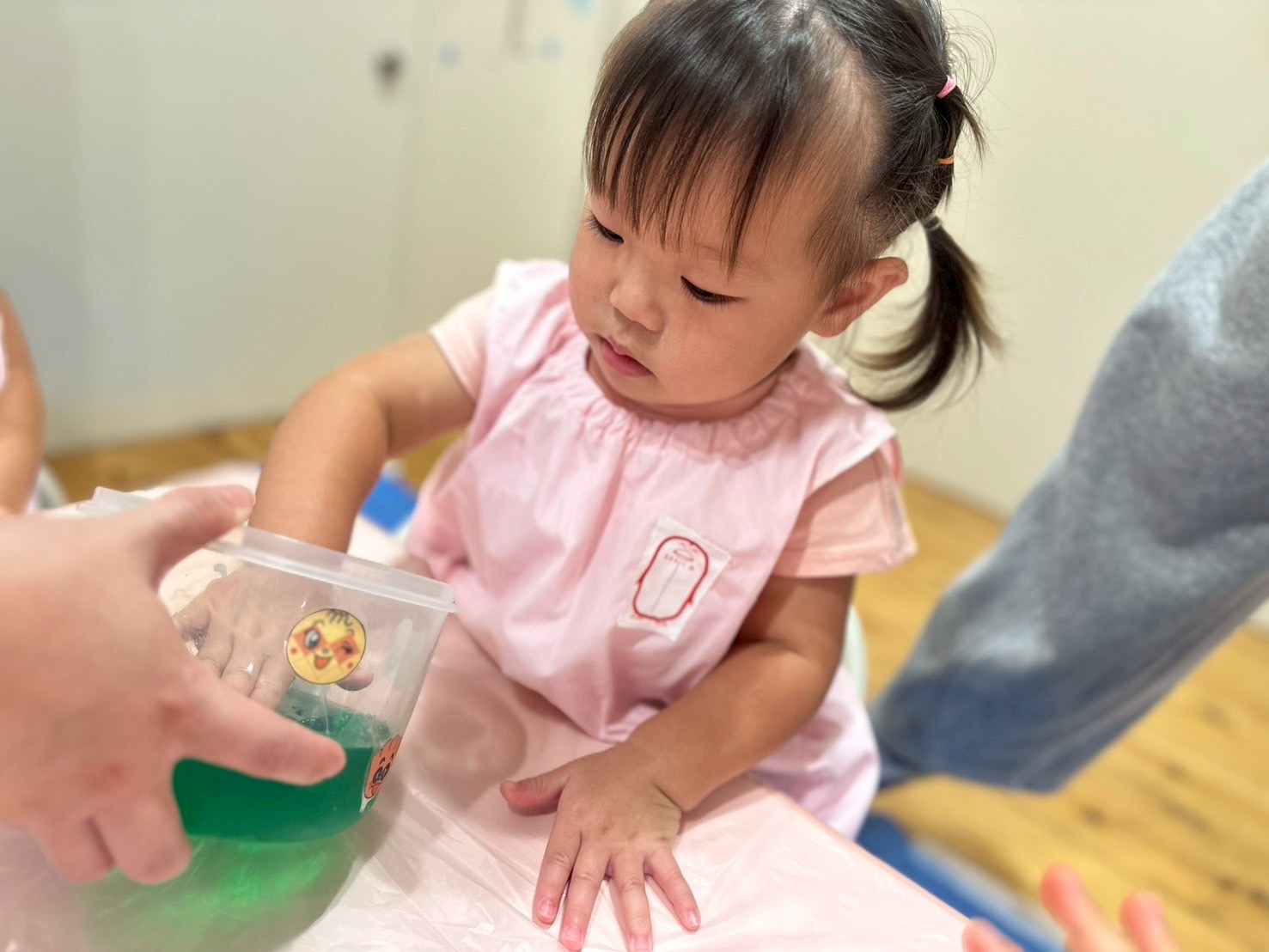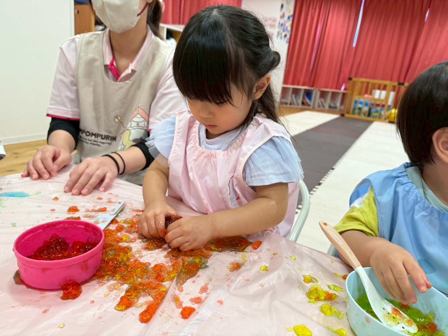 感触遊びで寒天ゼリーを触って遊びました✨️