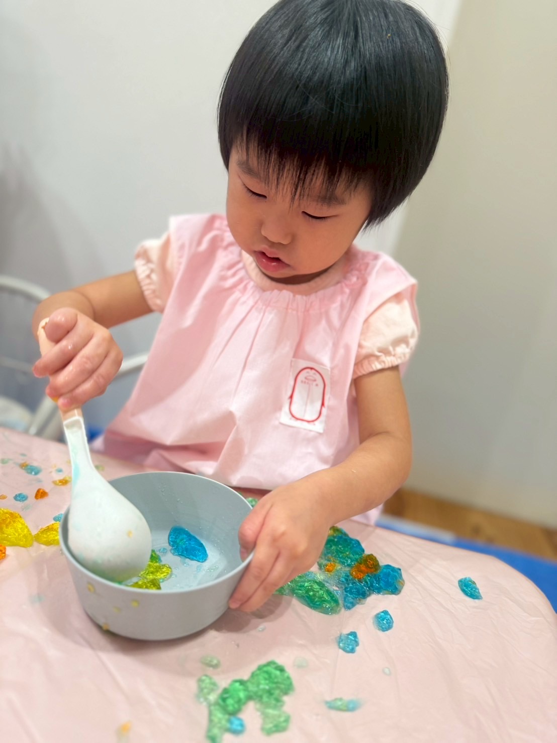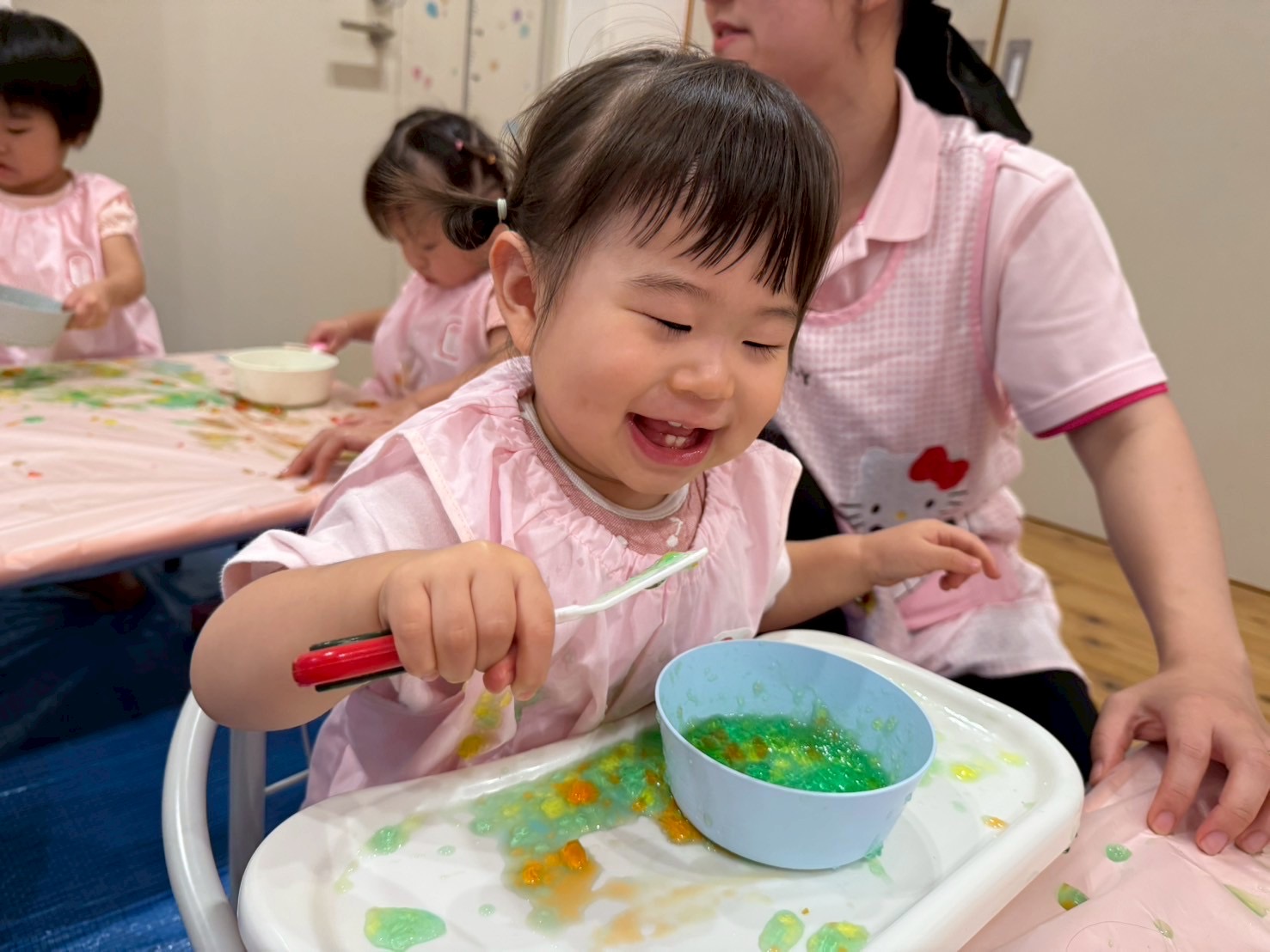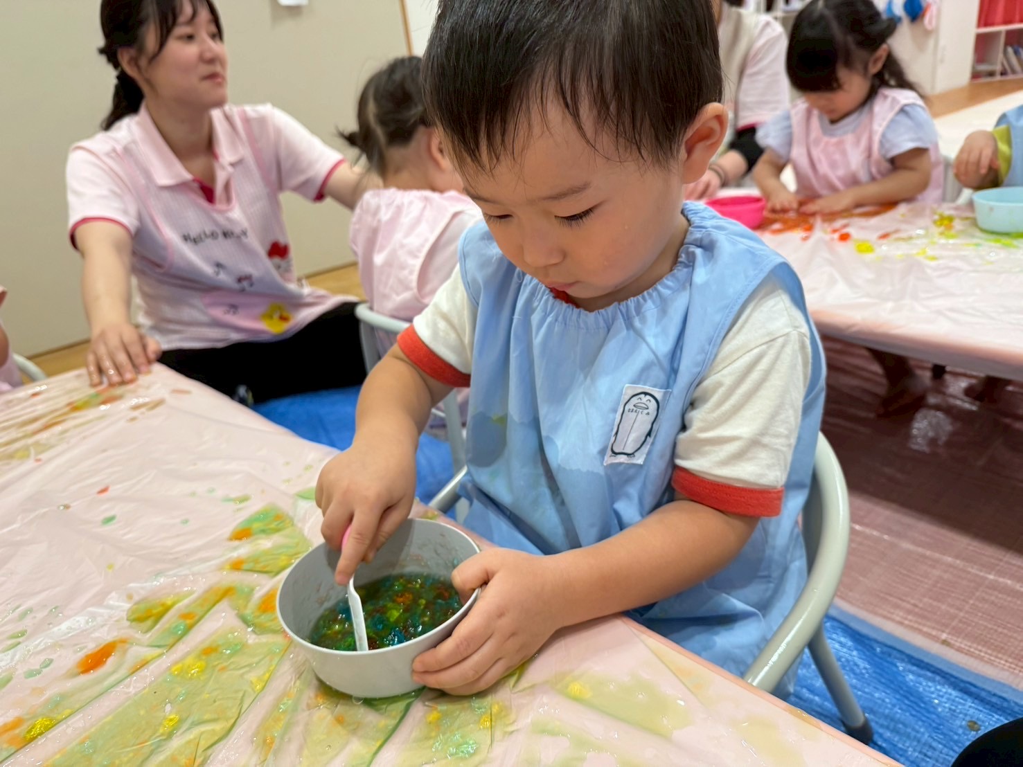 お皿に入れたりテーブルの上にゼリーを広げて手で潰したりと感触を楽しんでいました😁💫