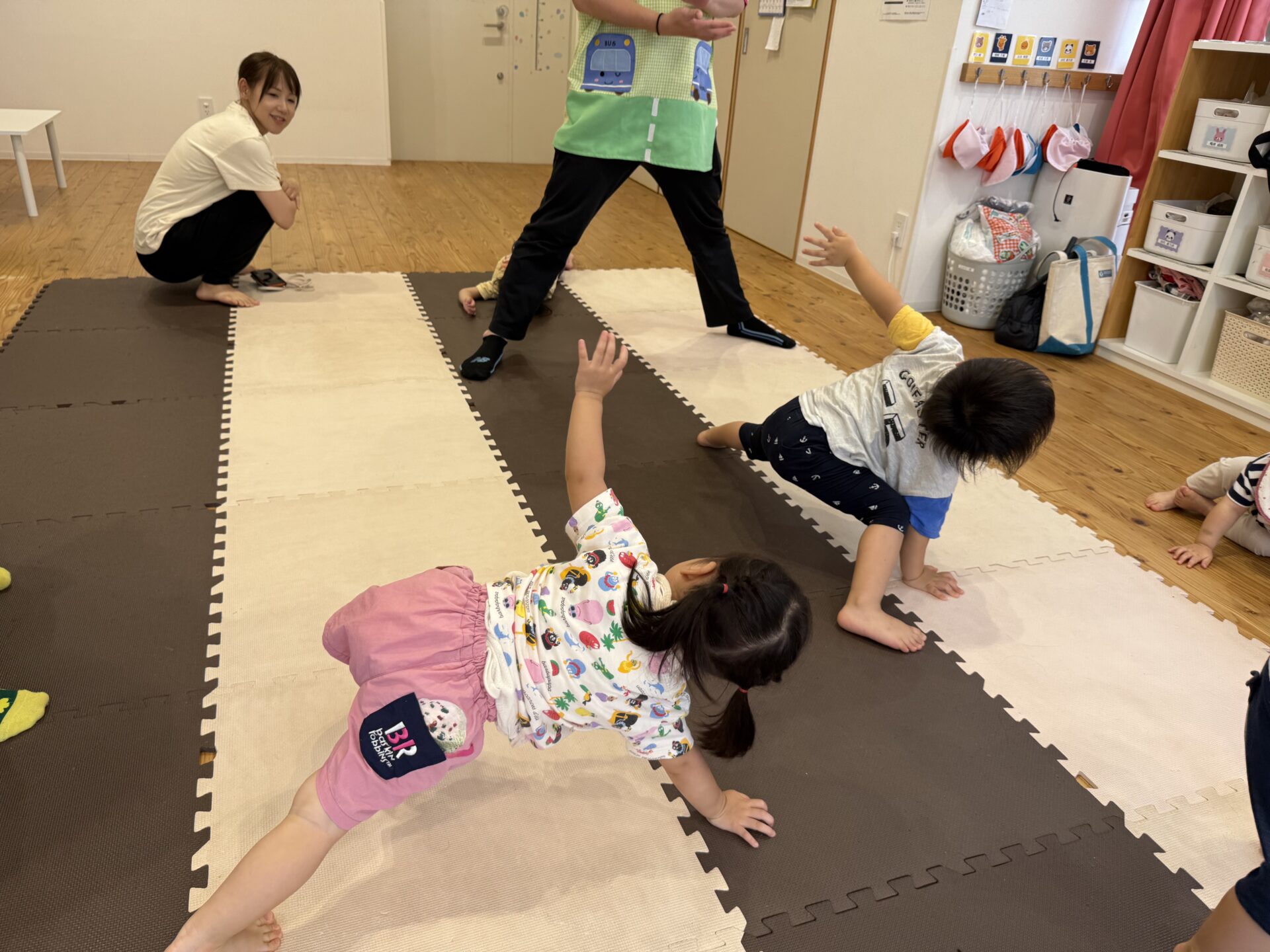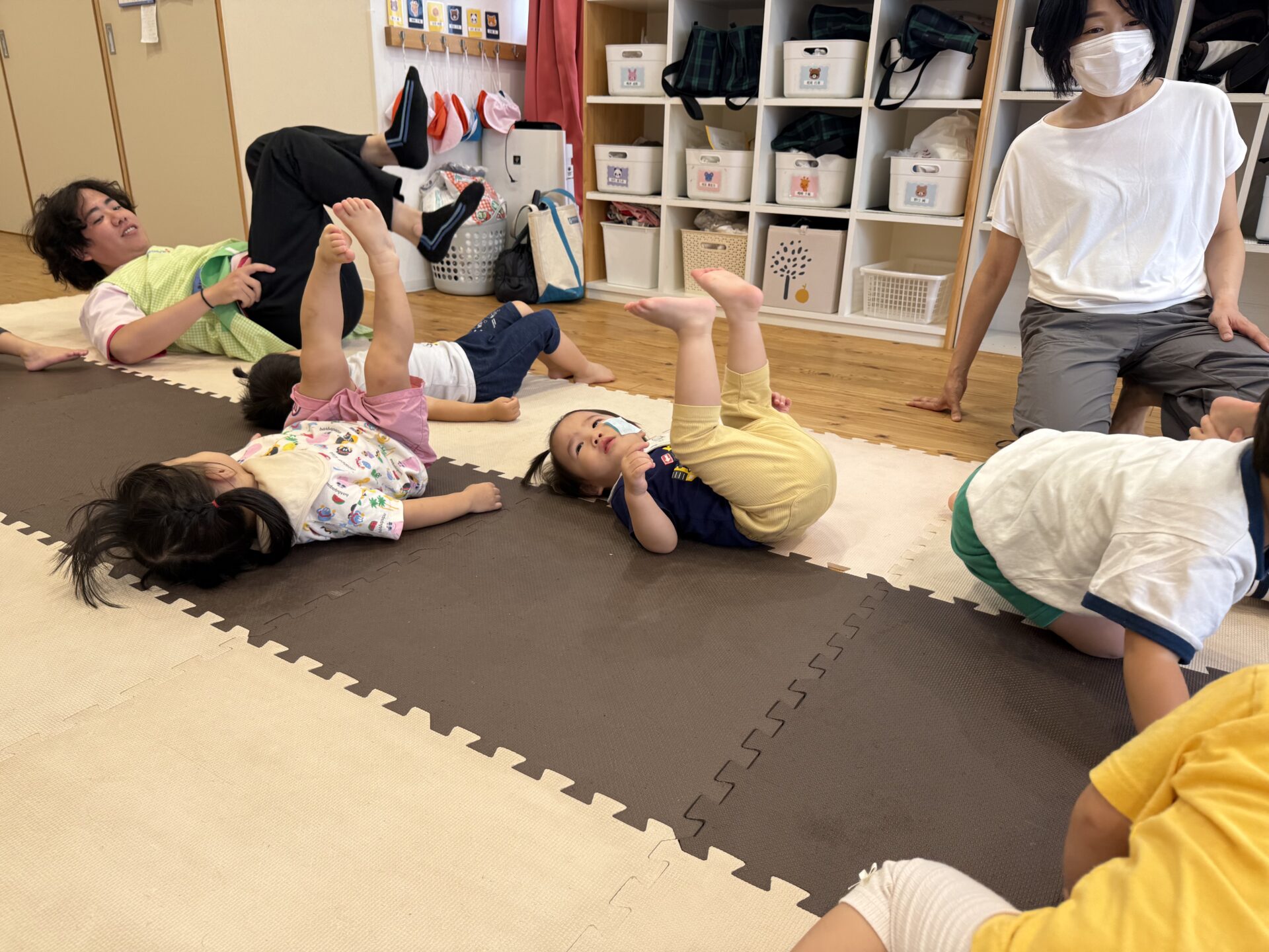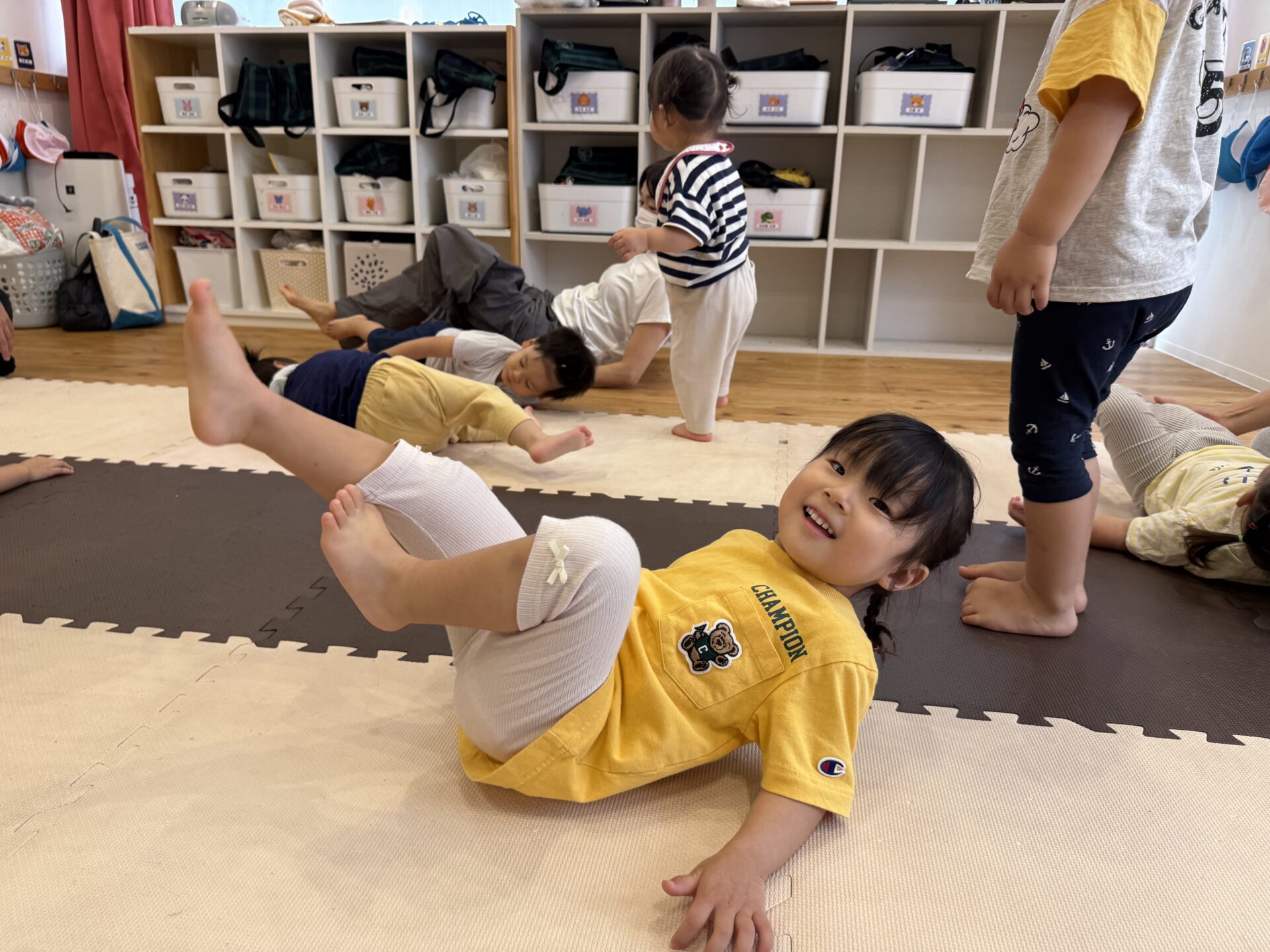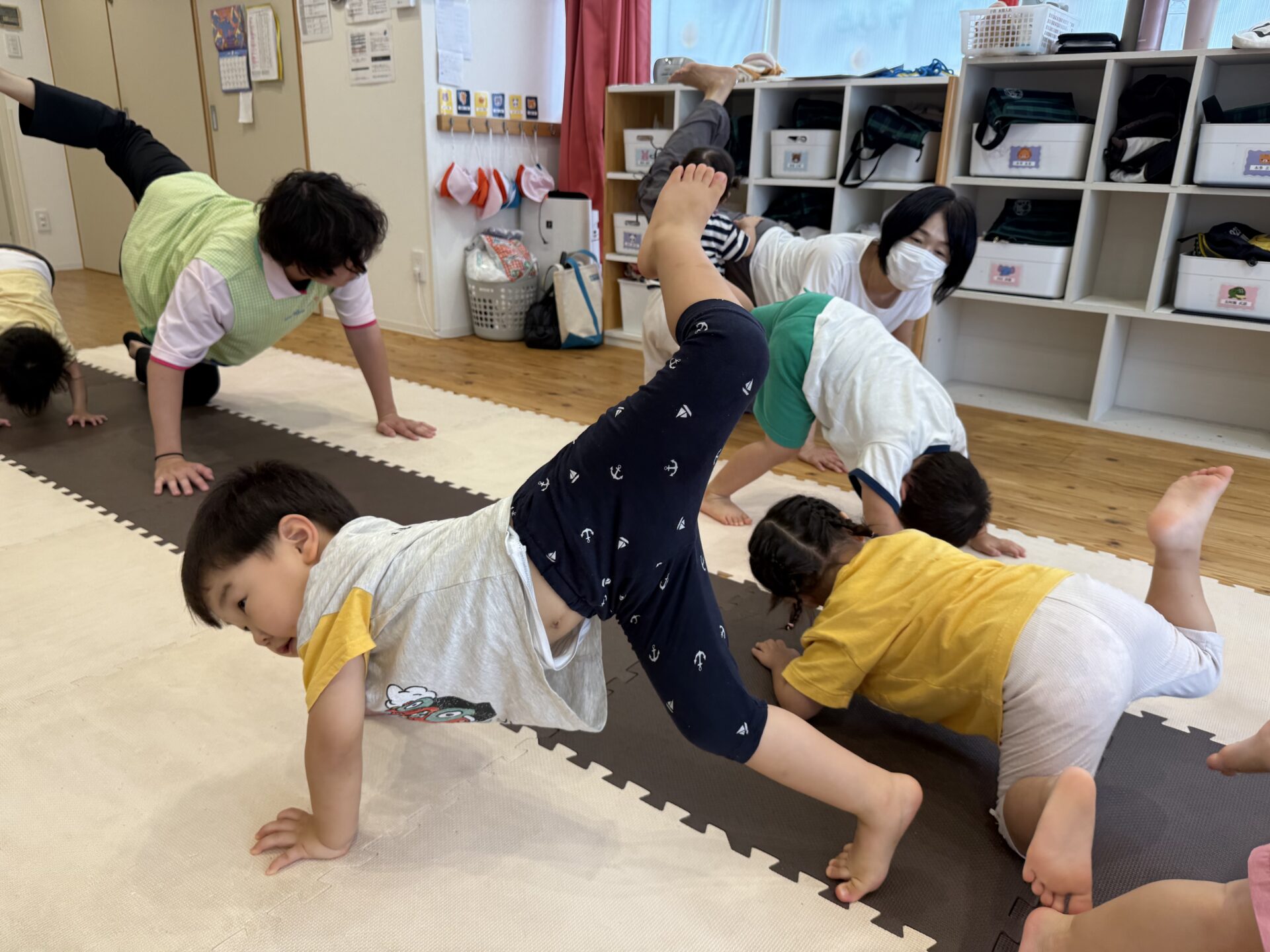 さつまいも🍠のポーズではゴロゴロ〜と転がったり、馬に変身した先生の背中に乗ったり、飛行機✈️や亀🐢、自転車🚲、虎🐅など色々なポーズを一緒に楽しんで、とても上手にできていた子ども達でしたよ〜👏✨