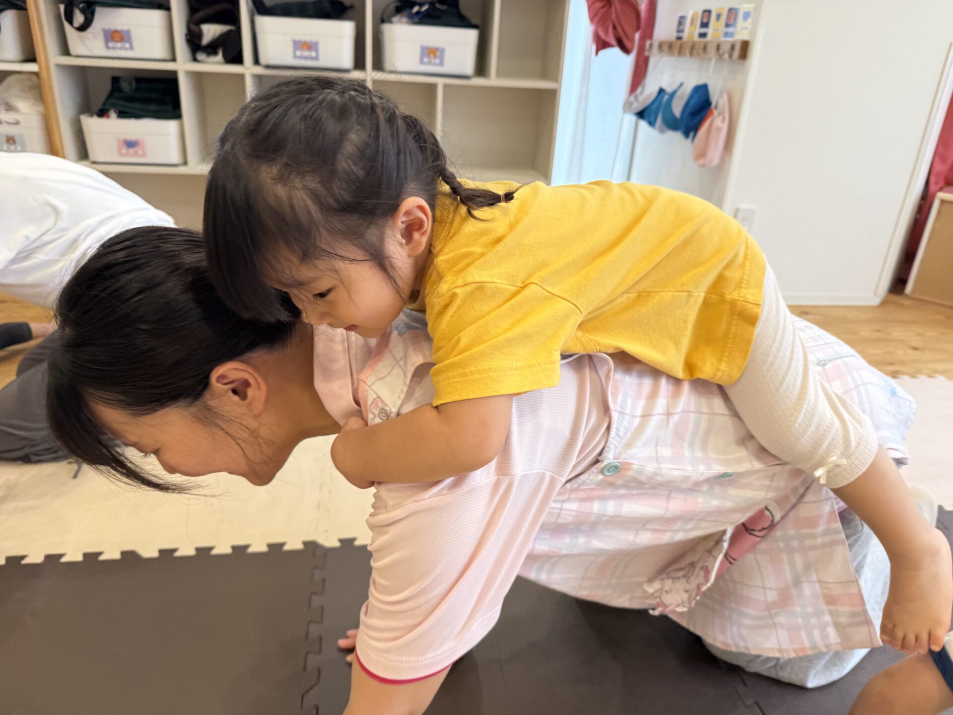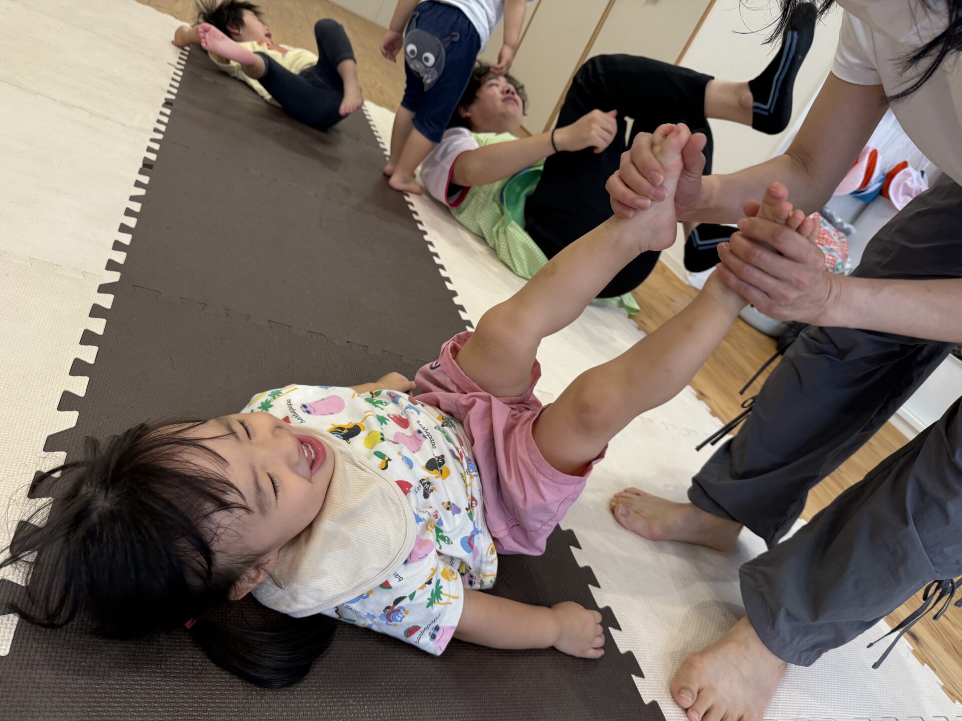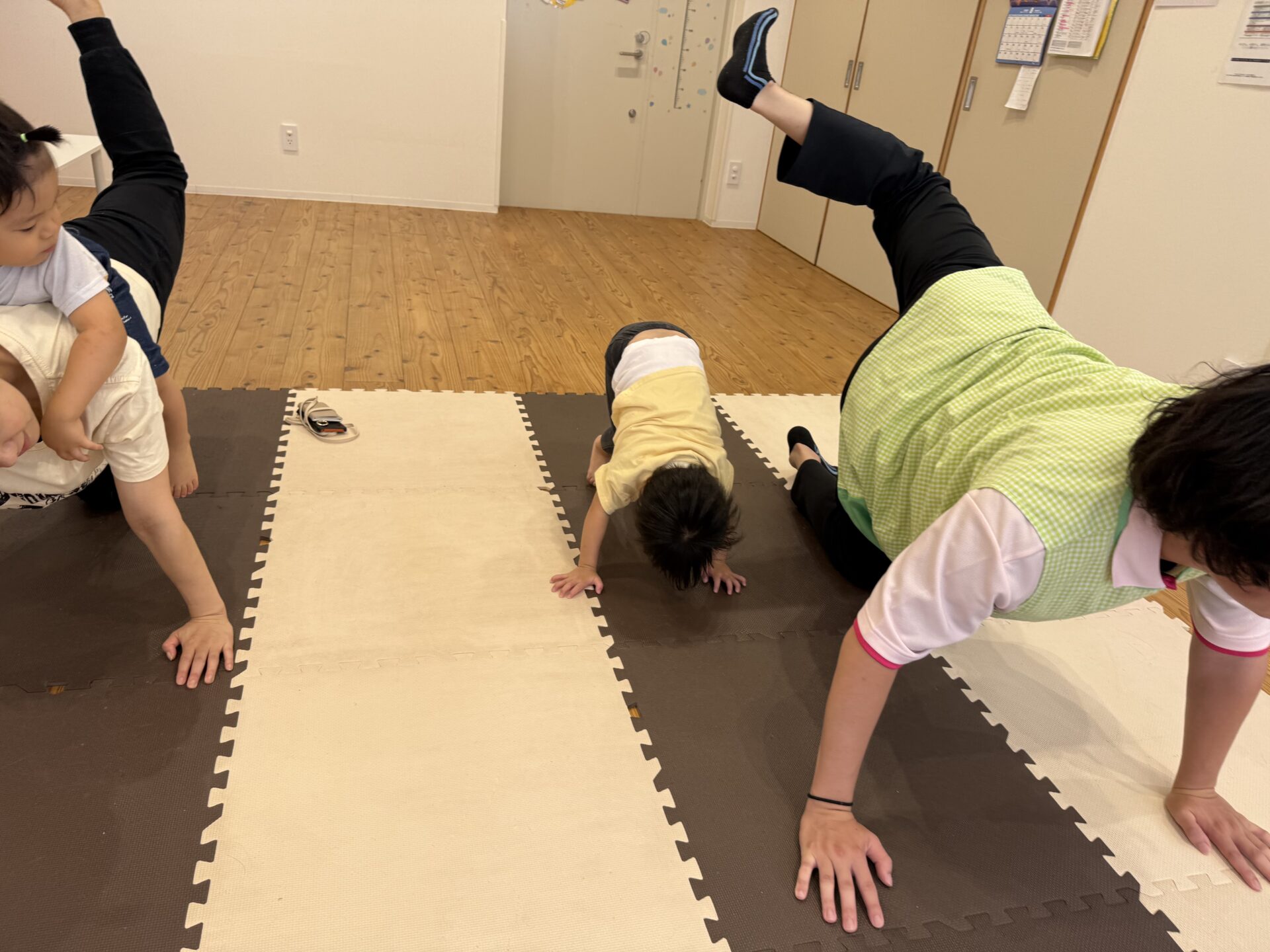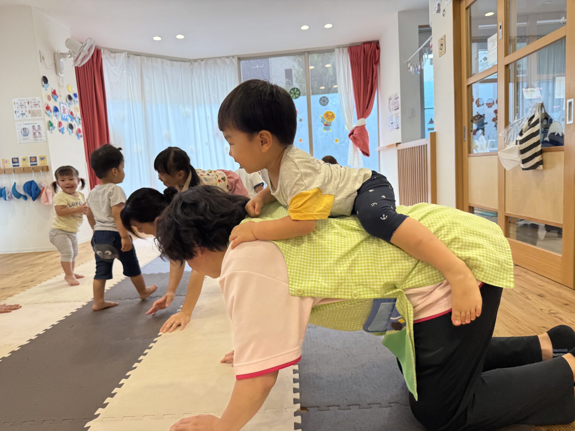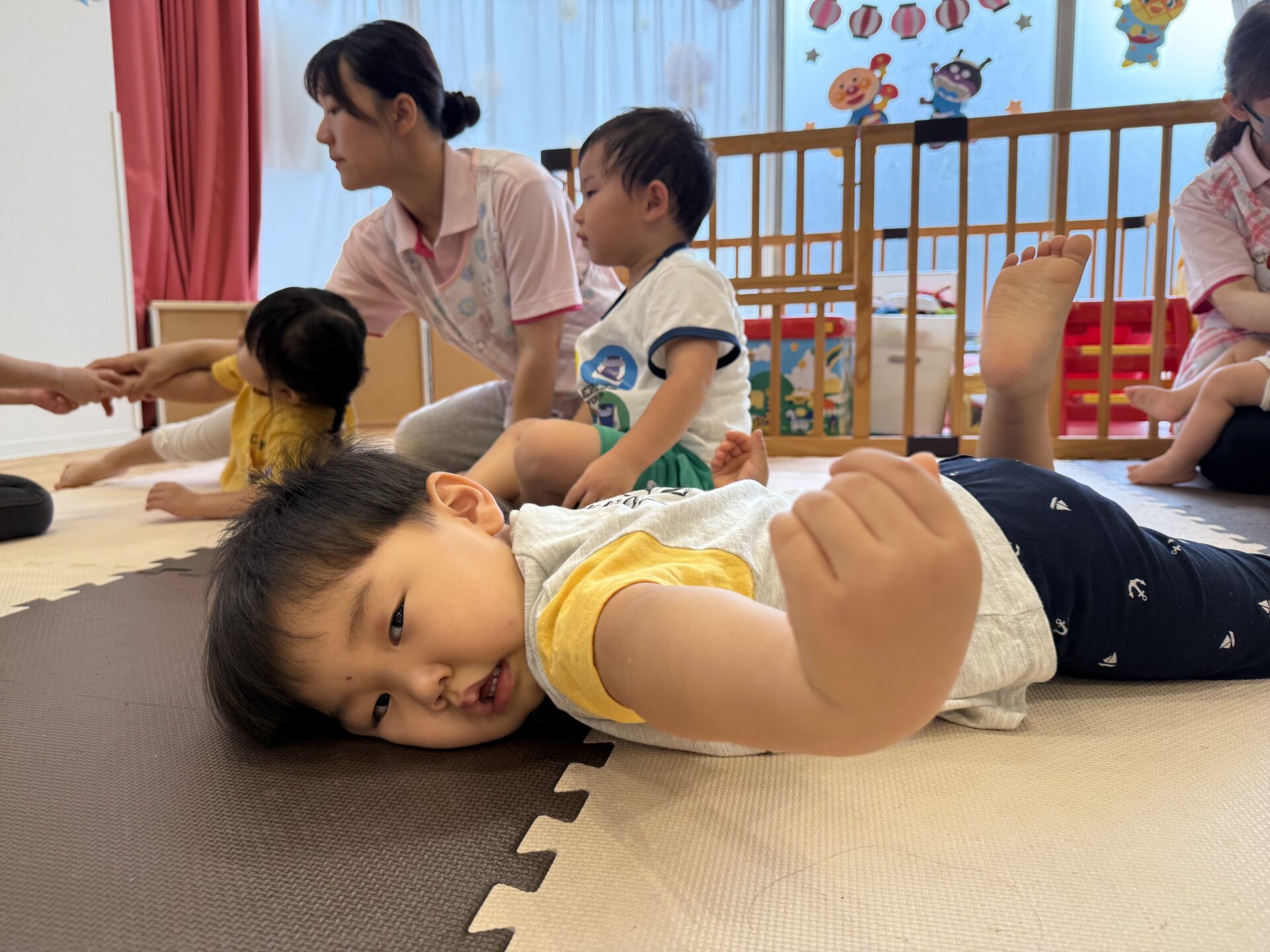 さつまいも🍠のポーズではゴロゴロ〜と転がったり、馬に変身した先生の背中に乗ったり、飛行機✈️や亀🐢、自転車🚲、虎🐅など色々なポーズを一緒に楽しんで、とても上手にできていた子ども達でしたよ〜👏✨