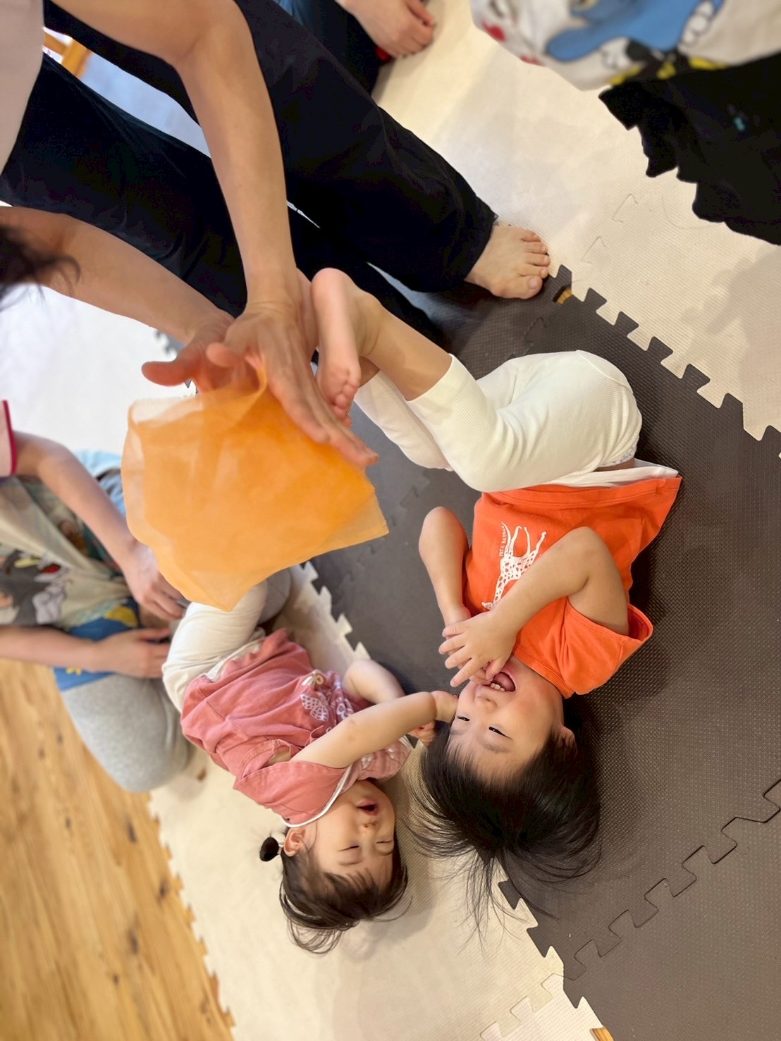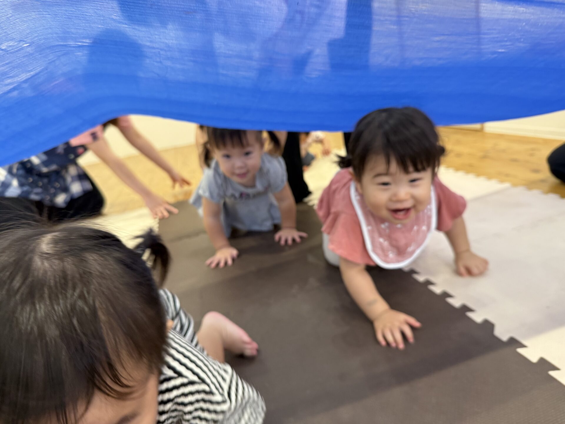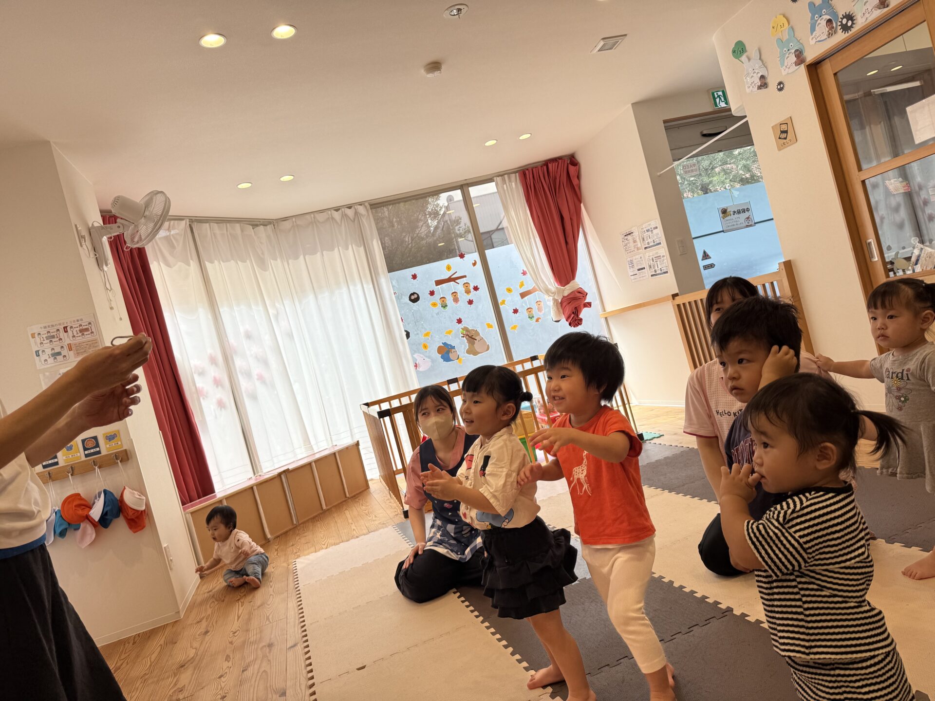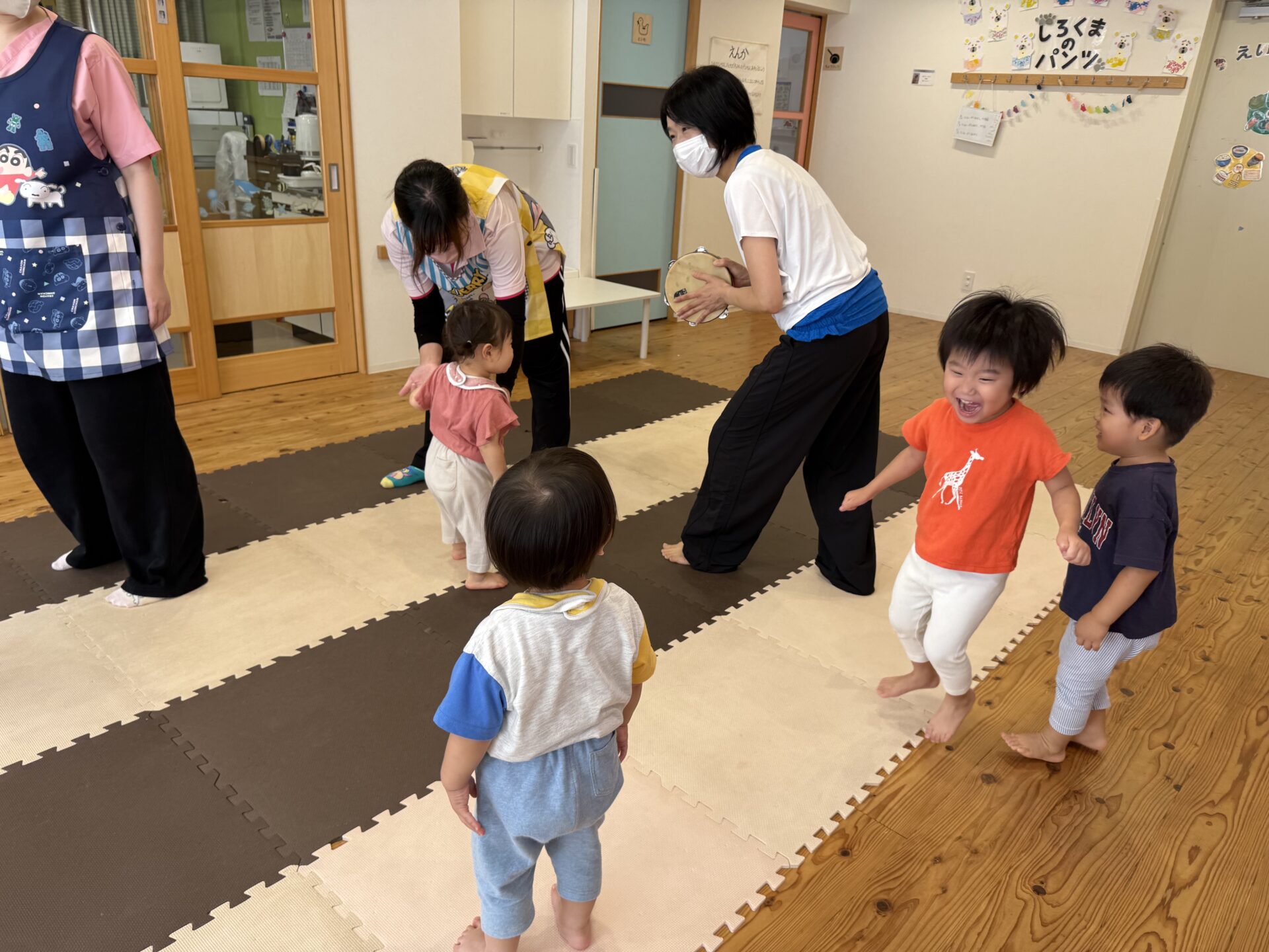 次はタンバリンを使って動物に変身しながら歩いて走ったり、止まったりして遊んだり、布を使って遊んだり声を出して楽しんでいた子ども達です😊