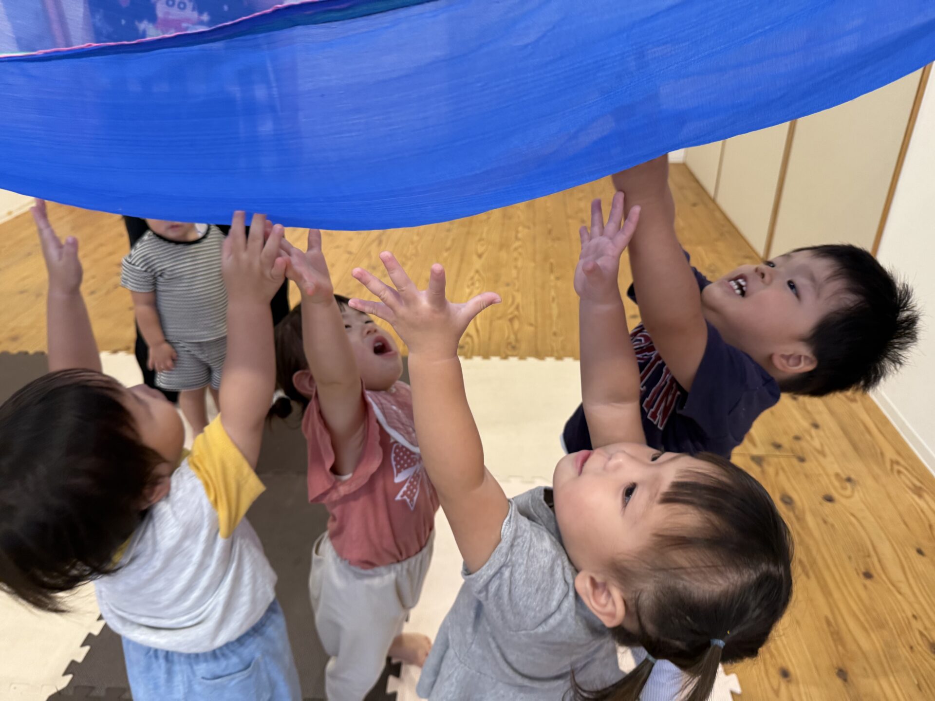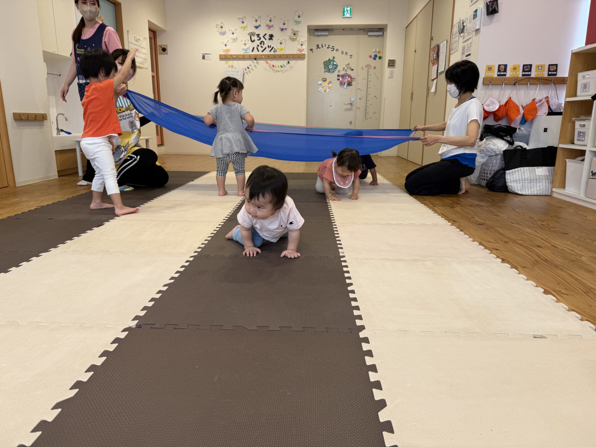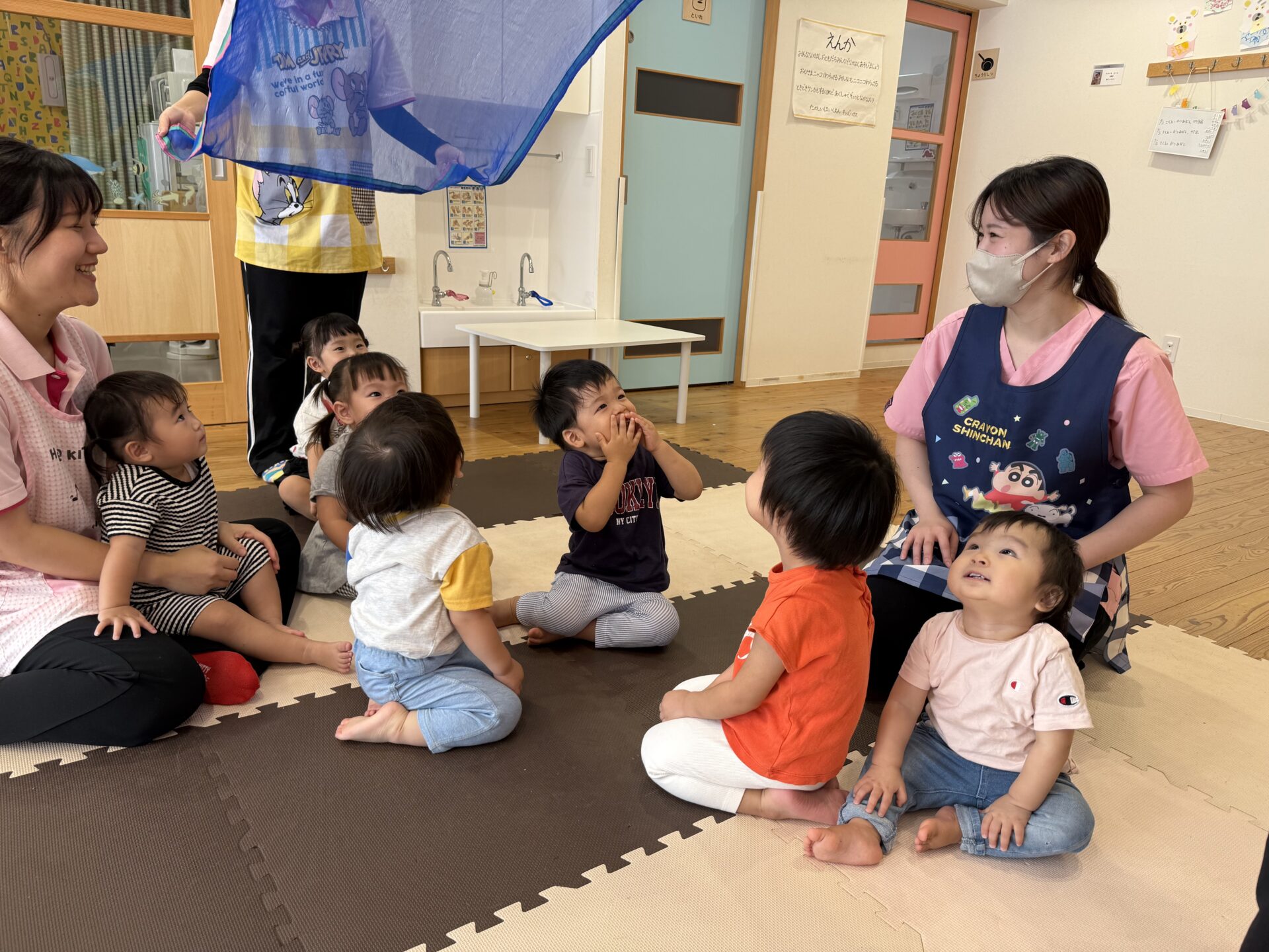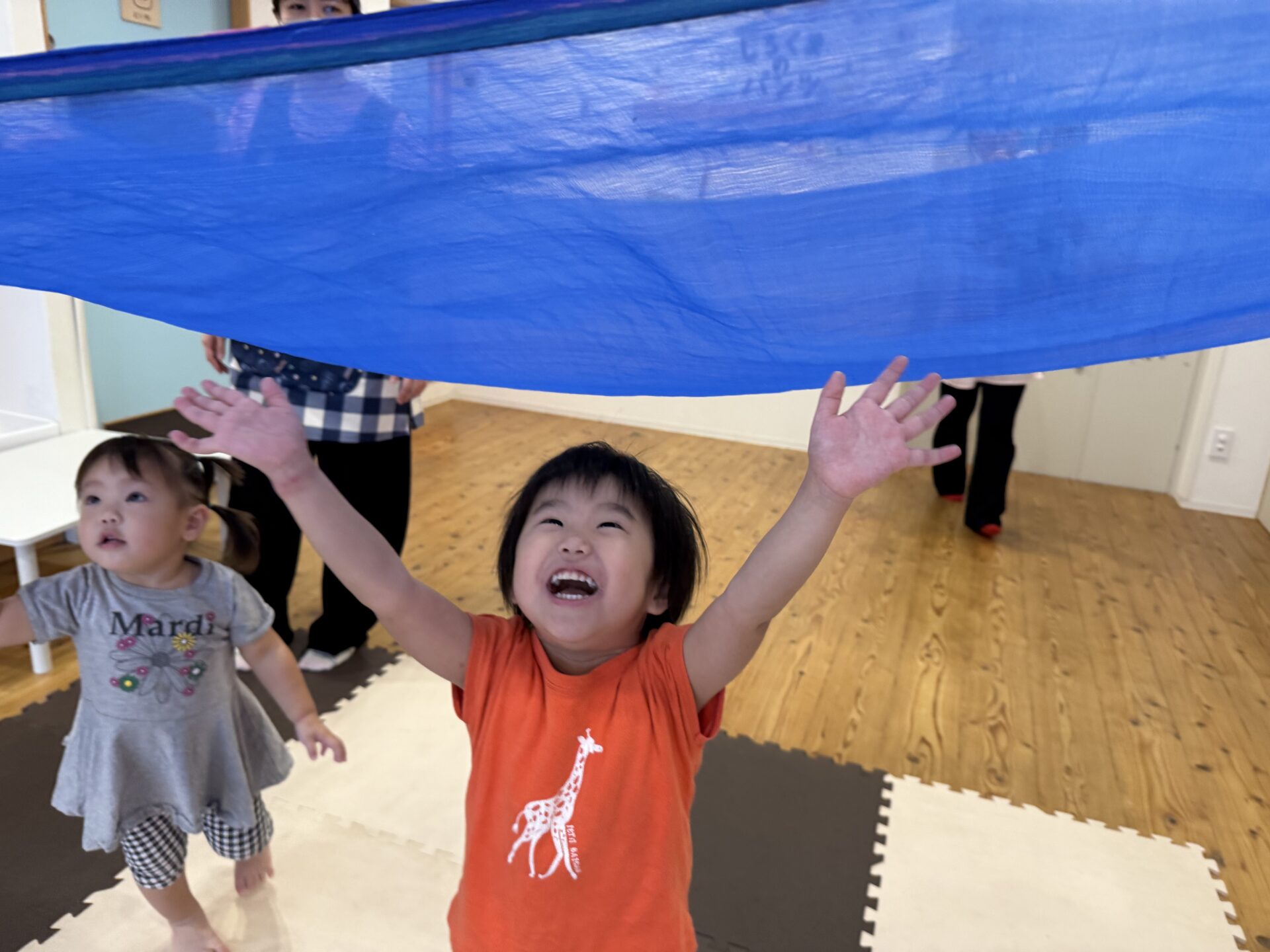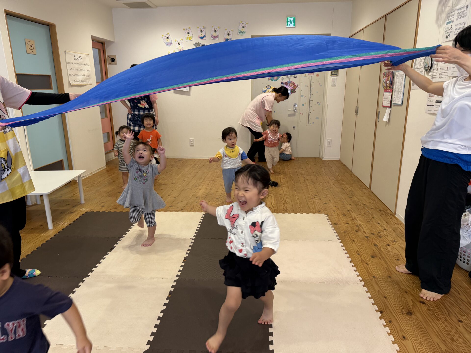 次はタンバリンを使って動物に変身しながら歩いて走ったり、止まったりして遊んだり、布を使って遊んだり声を出して楽しんでいた子ども達です😊