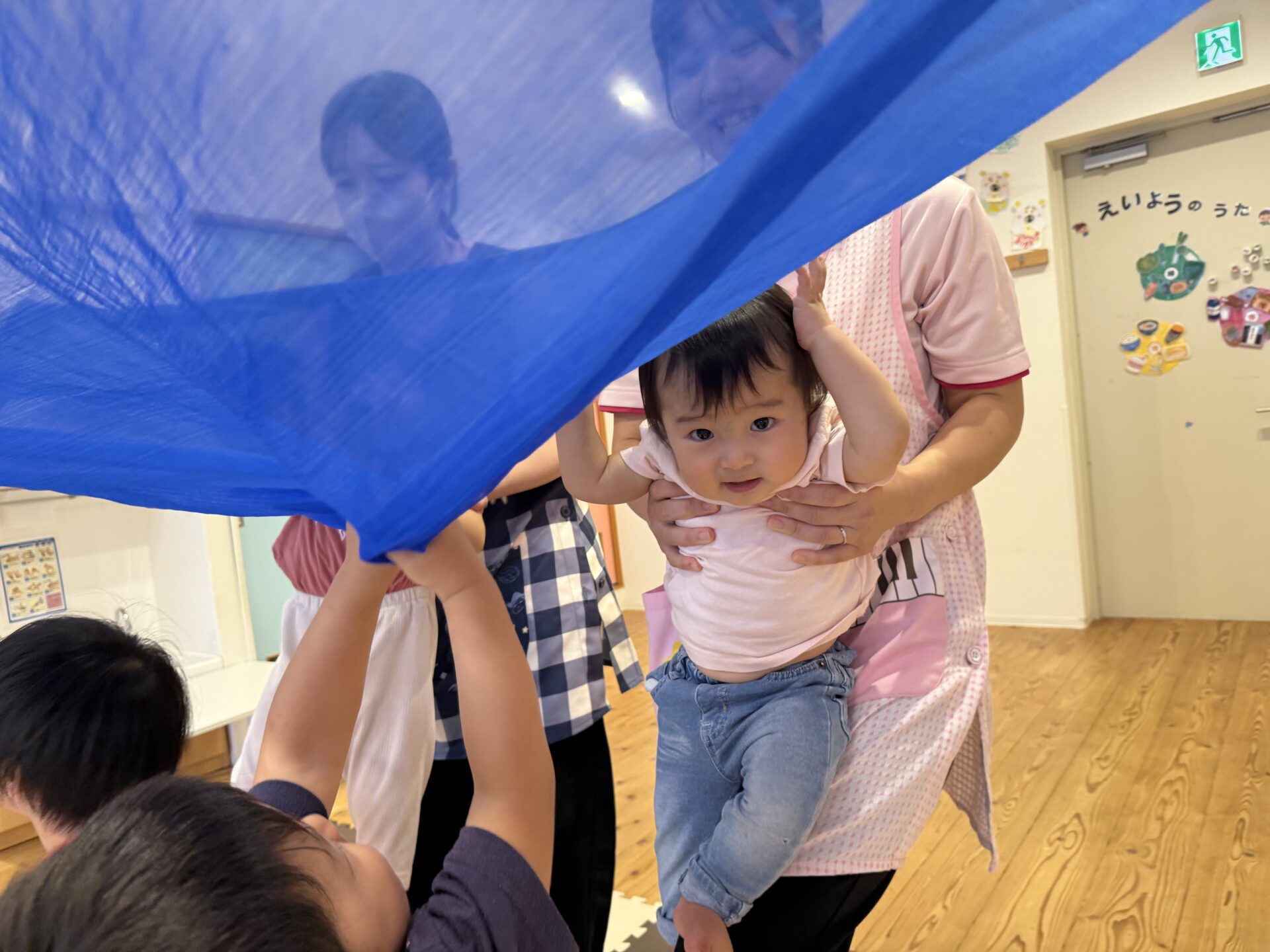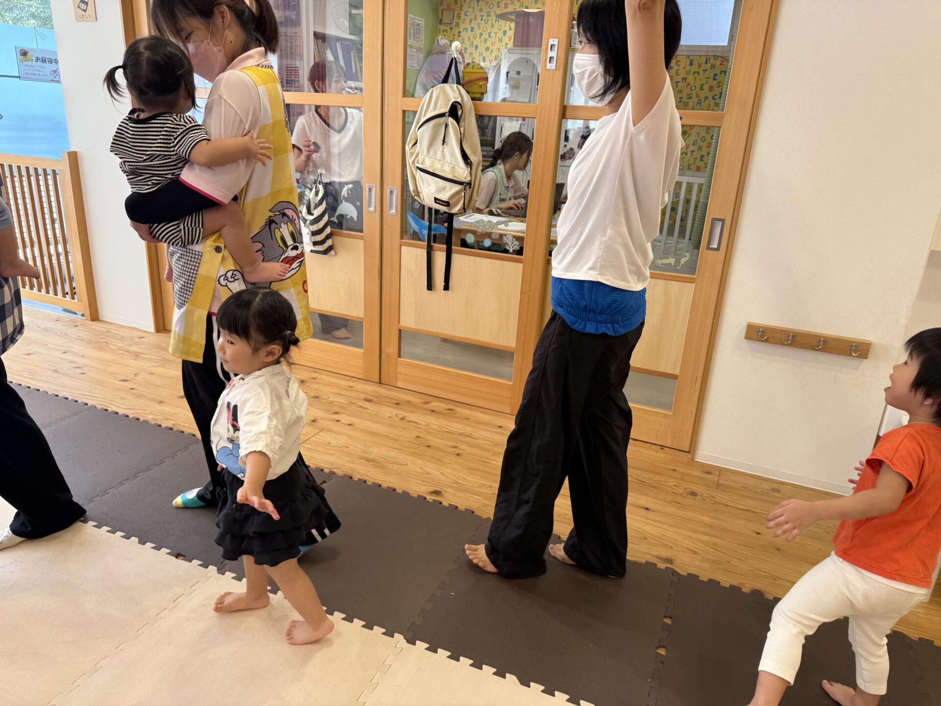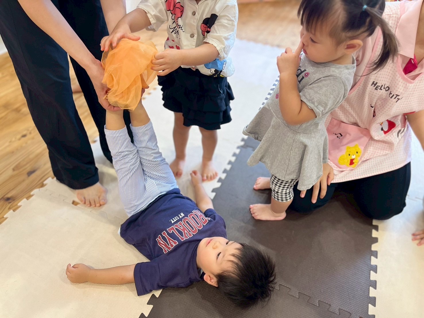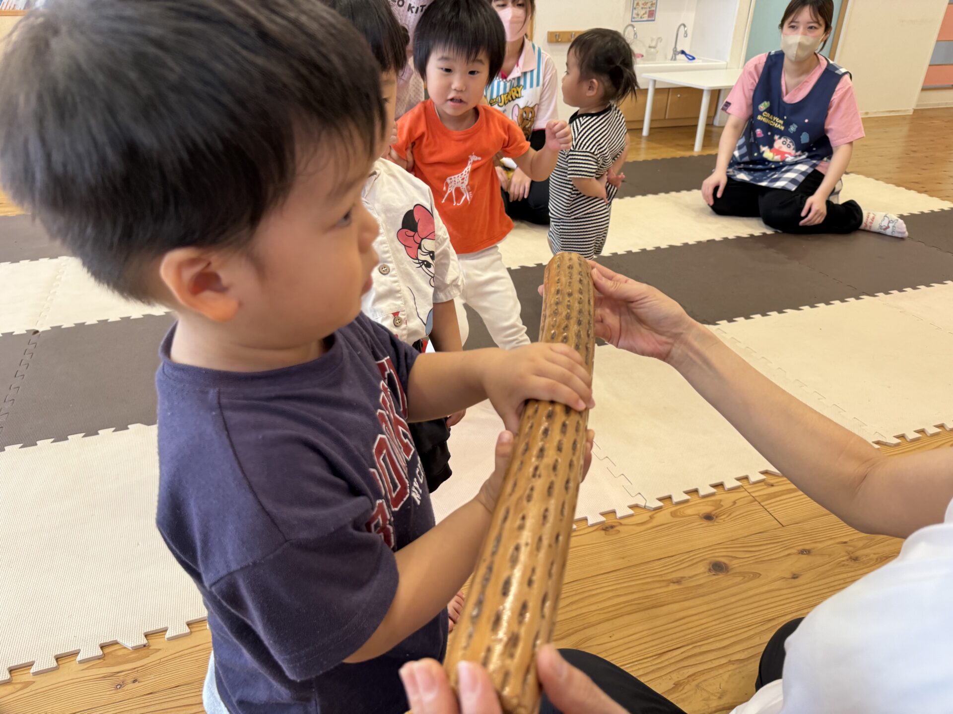 次はタンバリンを使って動物に変身しながら歩いて走ったり、止まったりして遊んだり、布を使って遊んだり声を出して楽しんでいた子ども達です😊