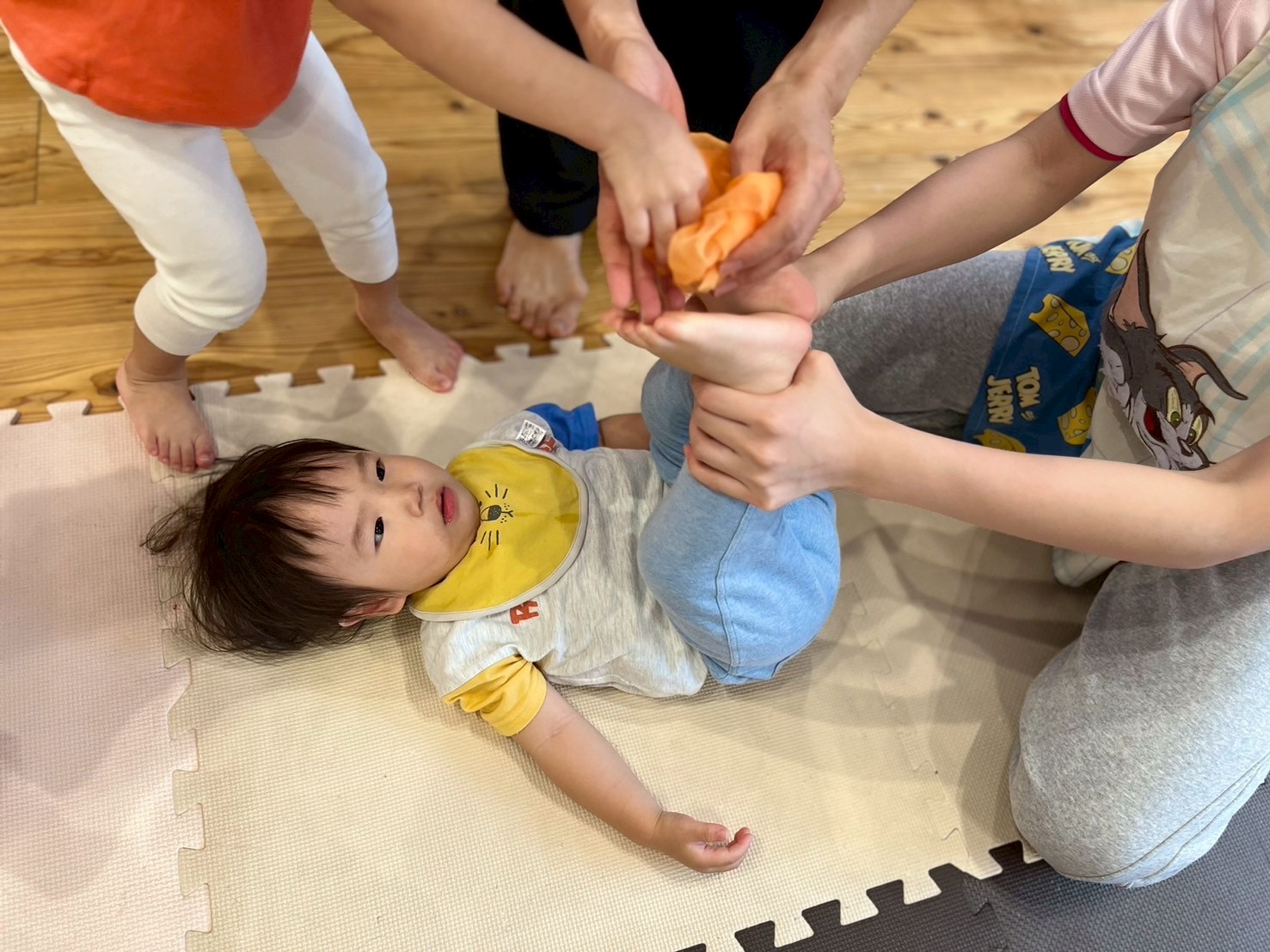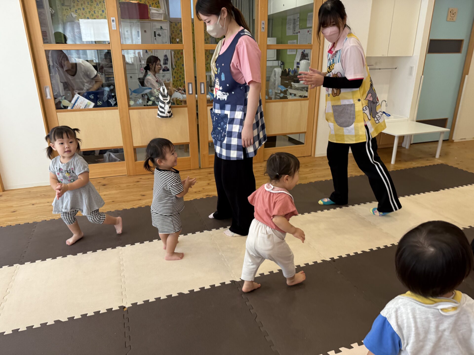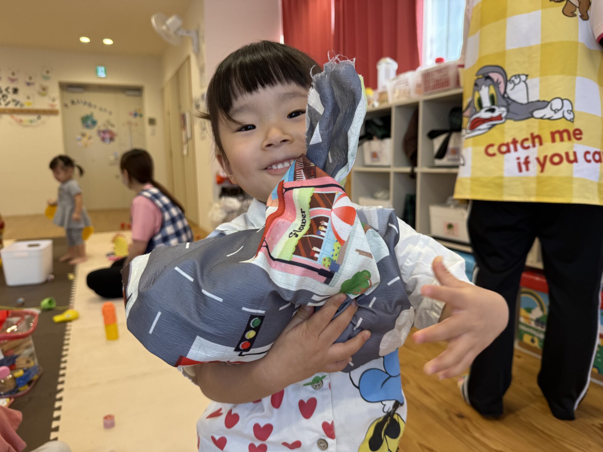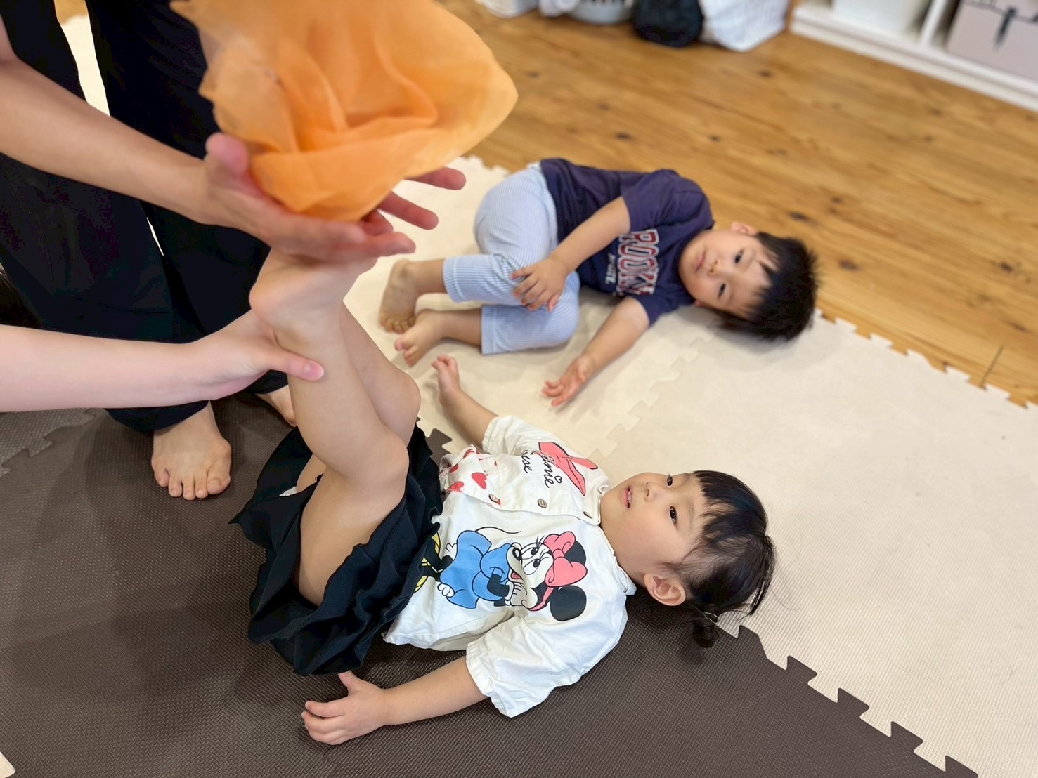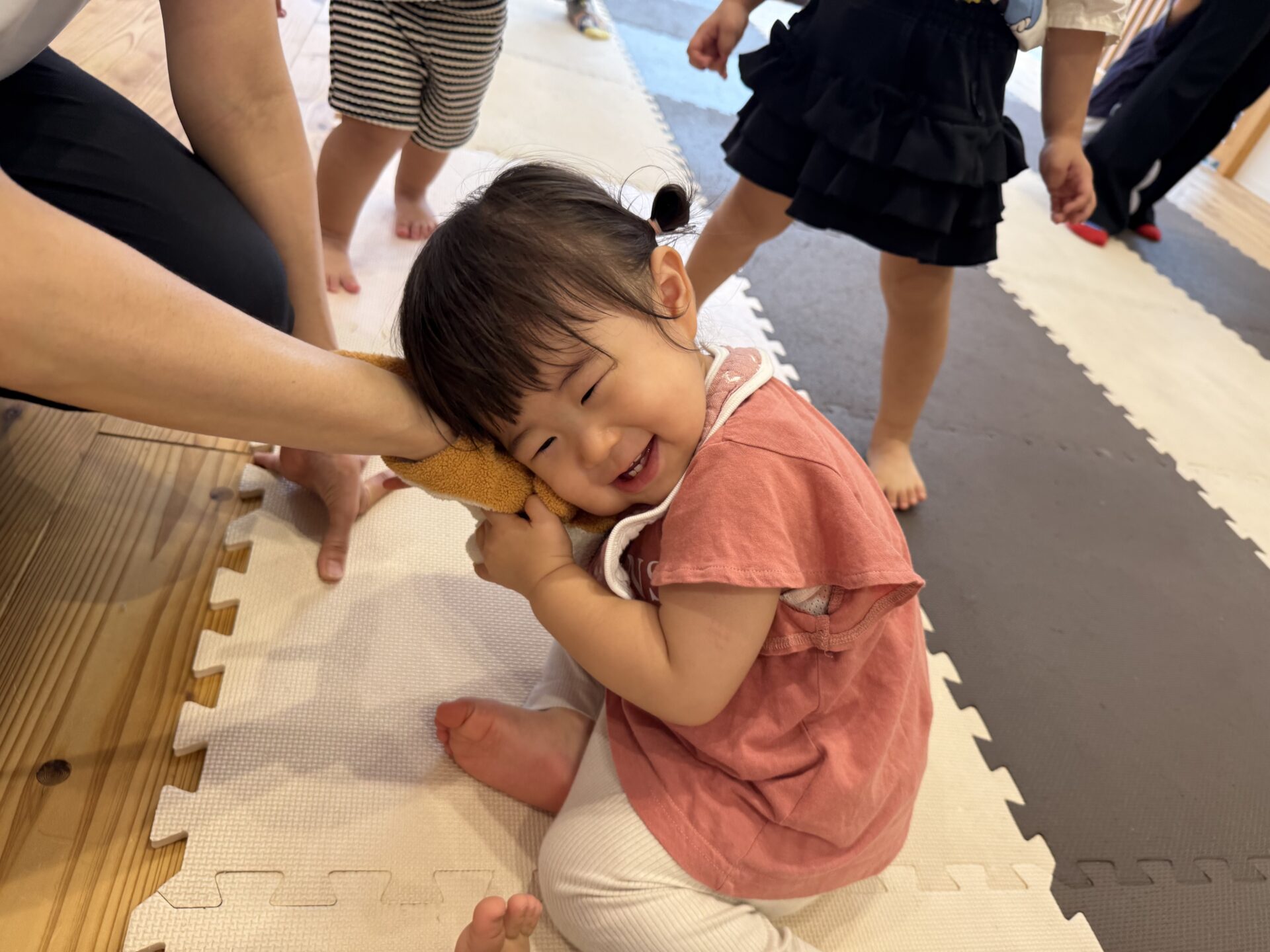次はタンバリンを使って動物に変身しながら歩いて走ったり、止まったりして遊んだり、布を使って遊んだり声を出して楽しんでいた子ども達です😊