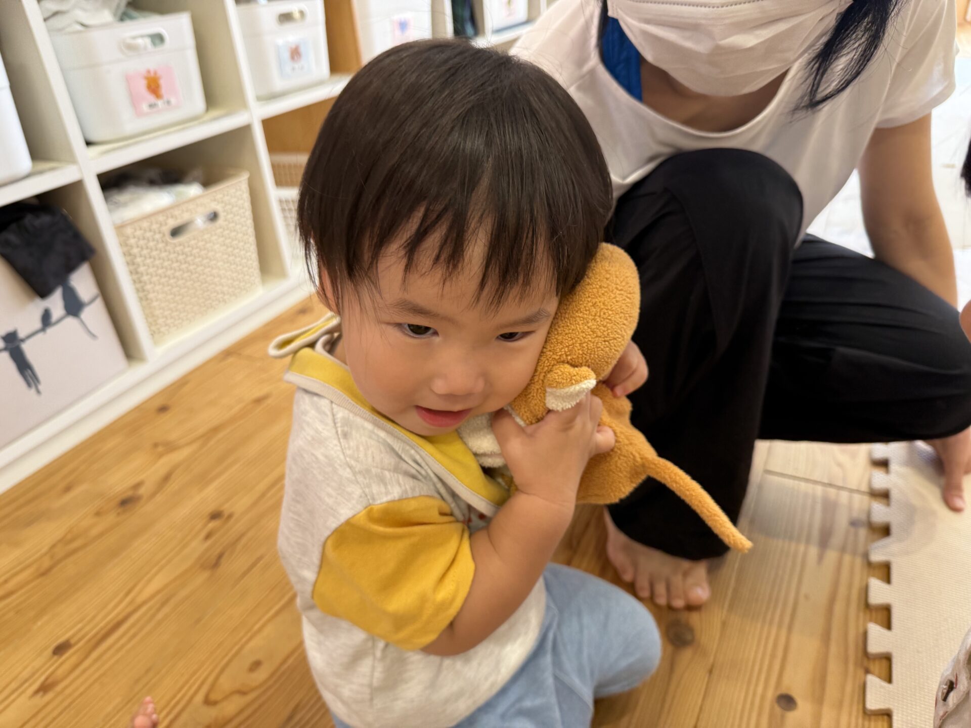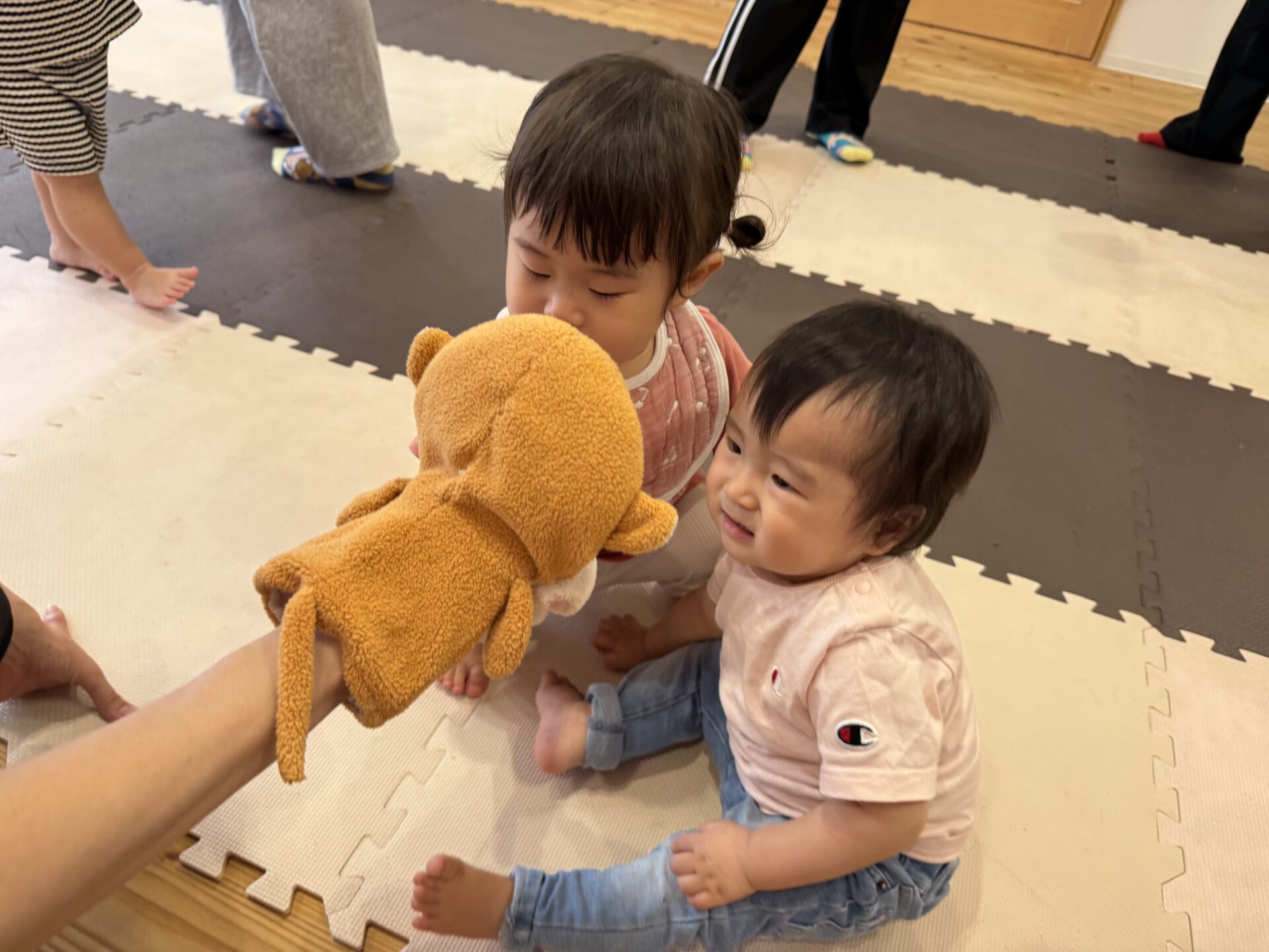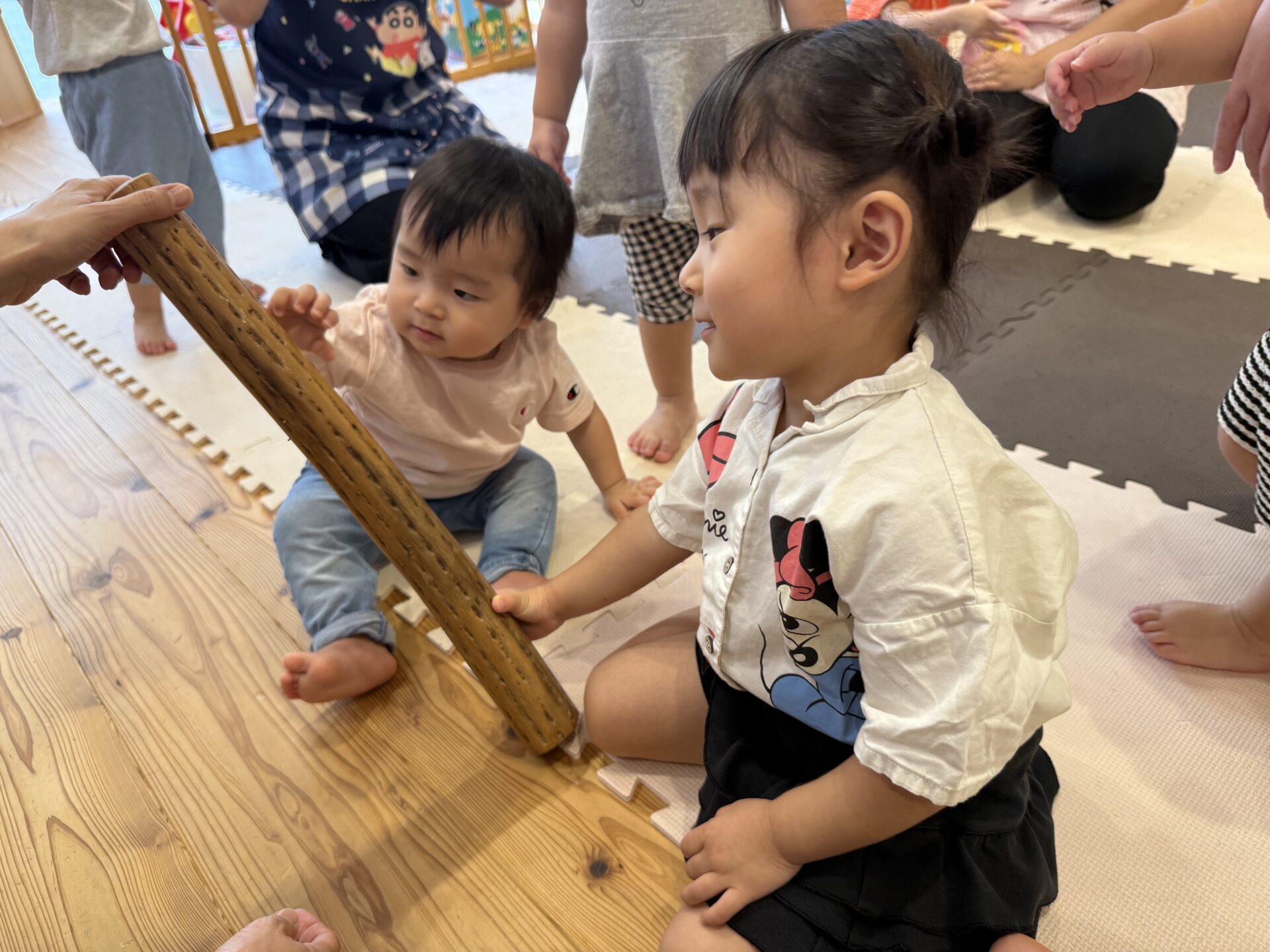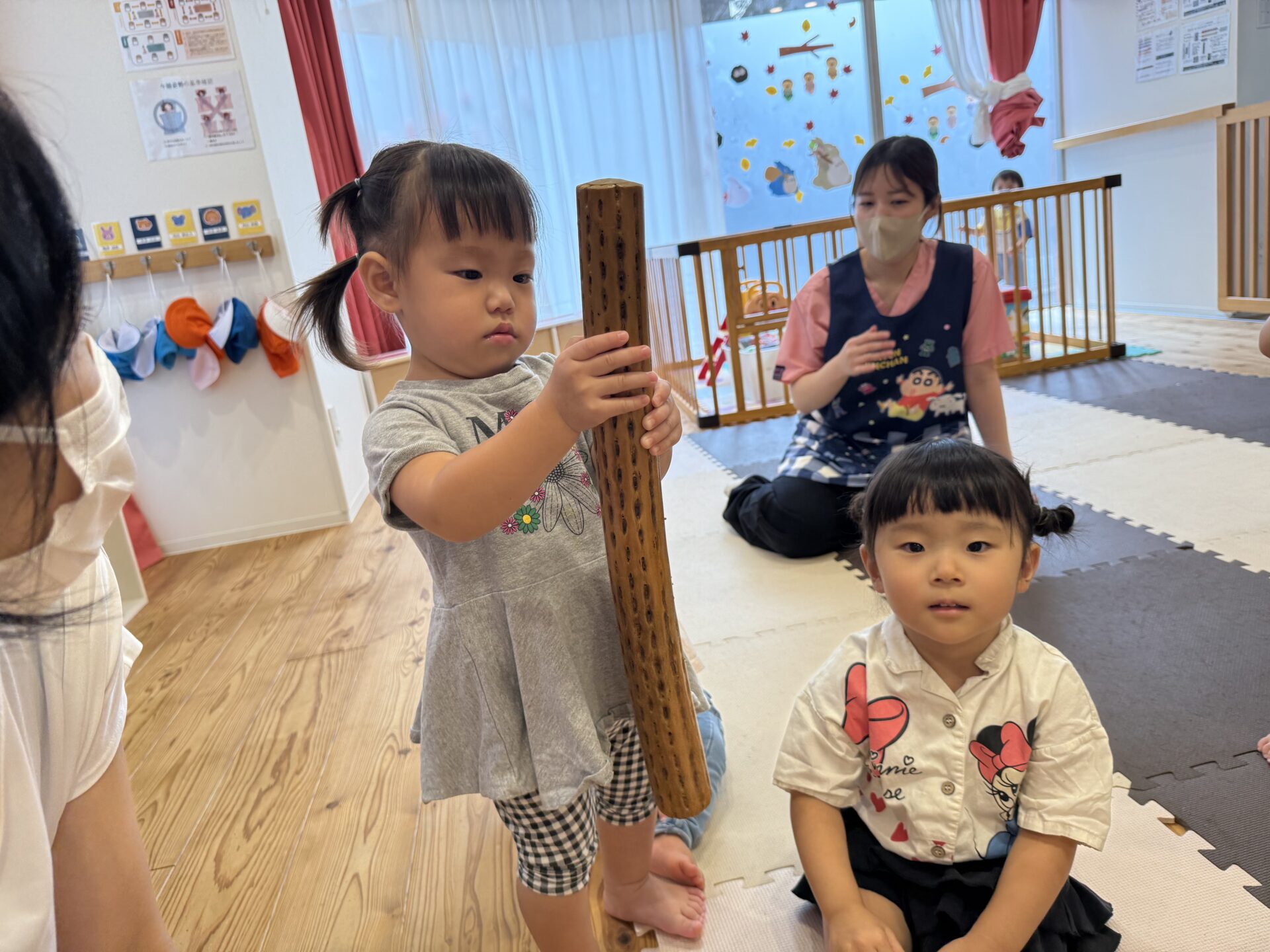 次はタンバリンを使って動物に変身しながら歩いて走ったり、止まったりして遊んだり、布を使って遊んだり声を出して楽しんでいた子ども達です😊