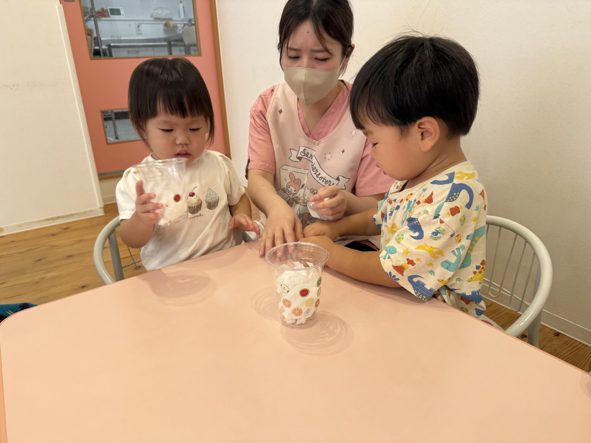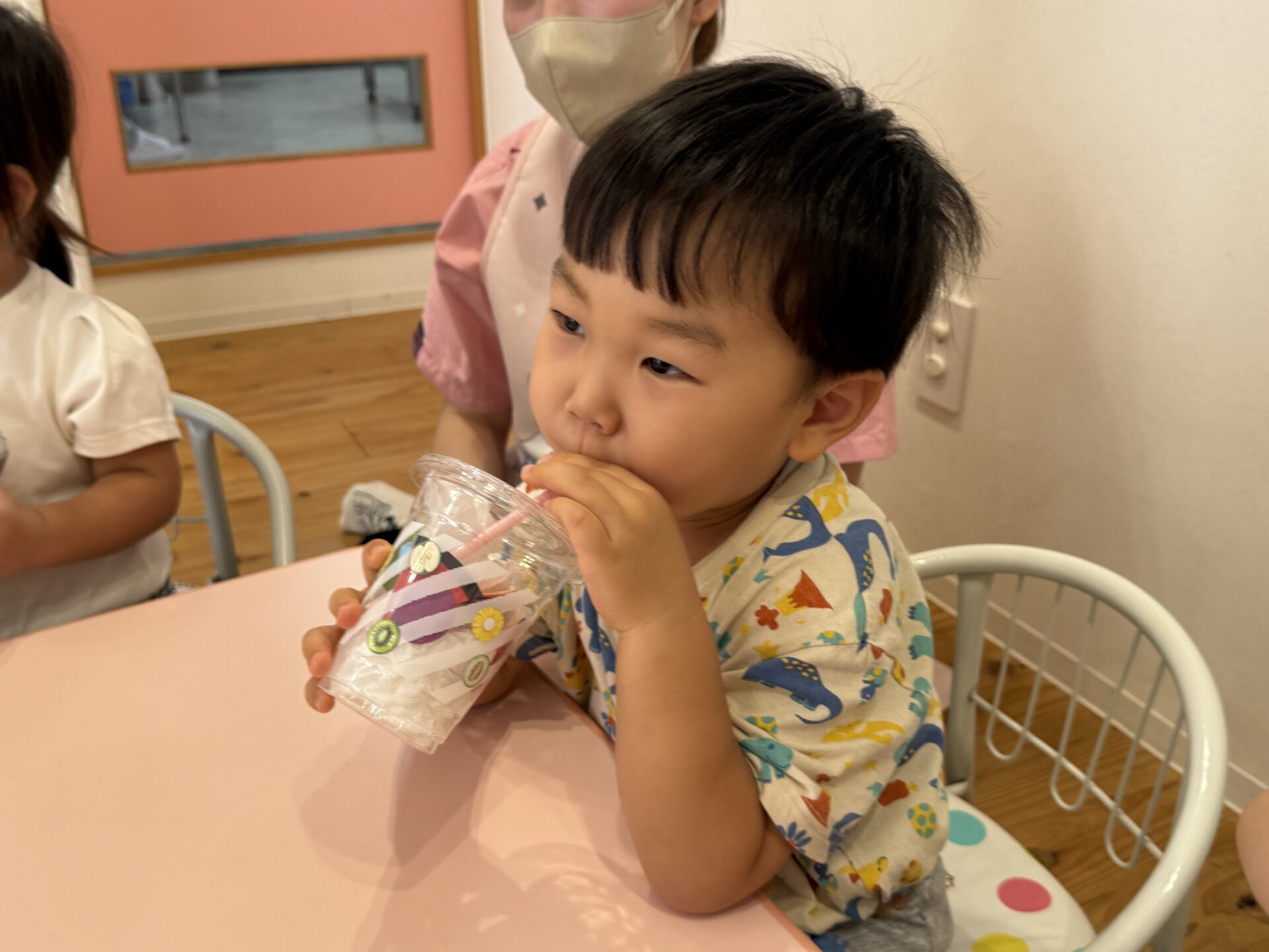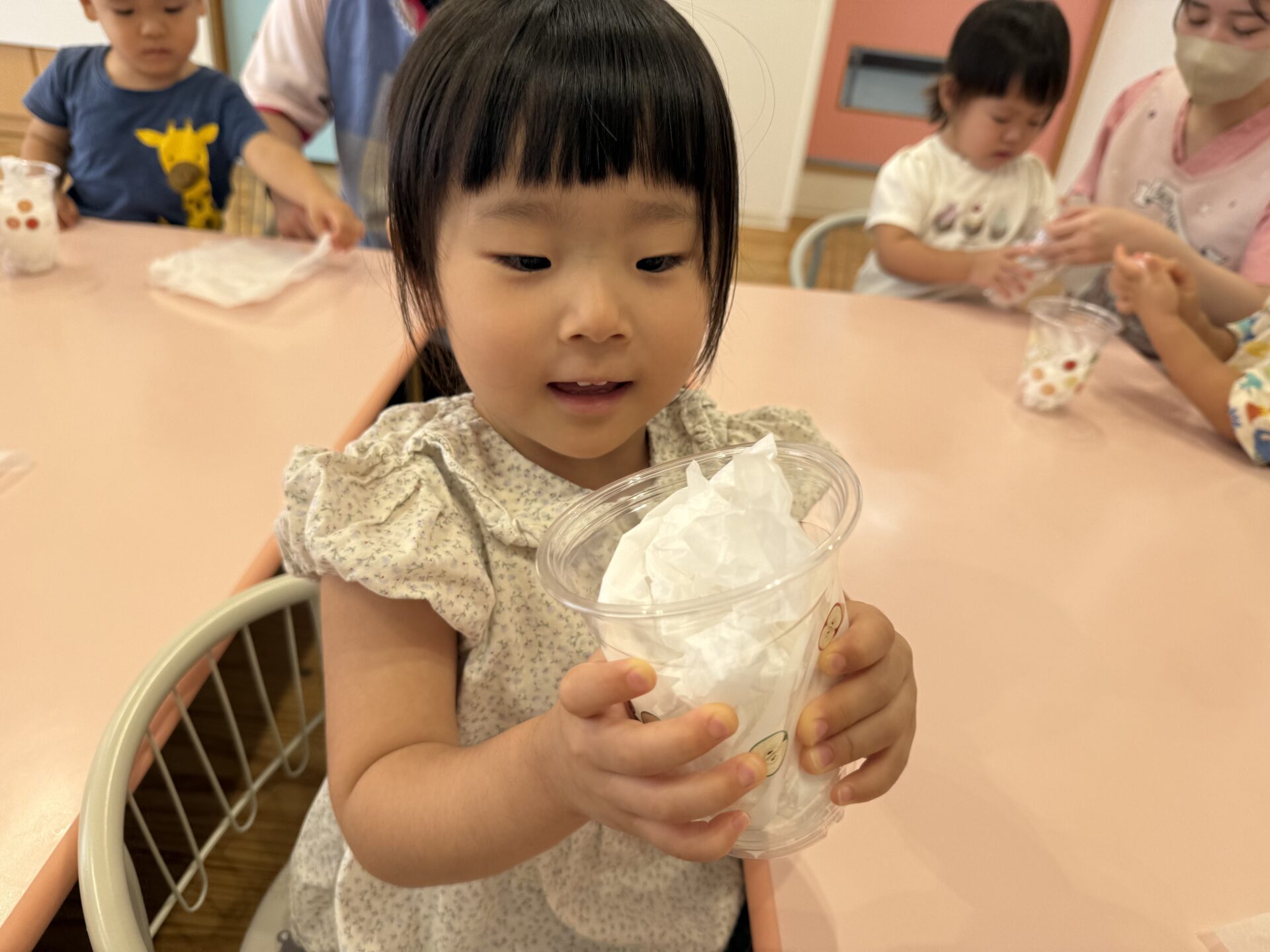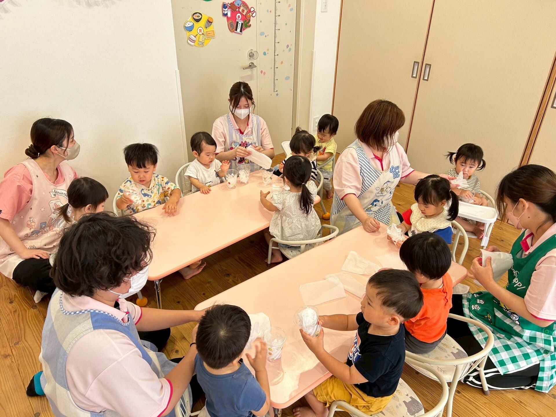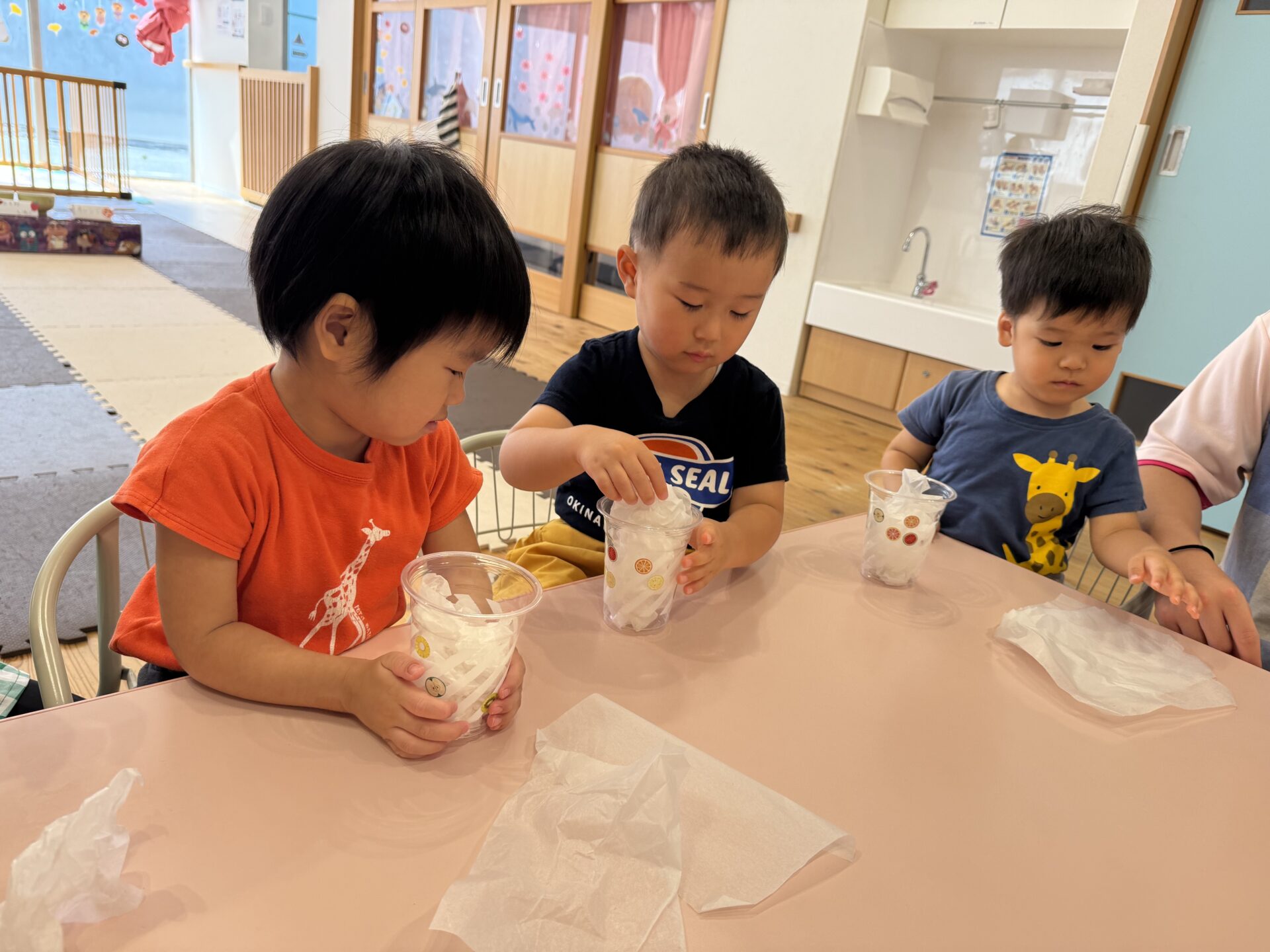 最初はカップにシールを貼って飾り付けをしていき、白い花紙でカルピスを作っていきました😁🎶