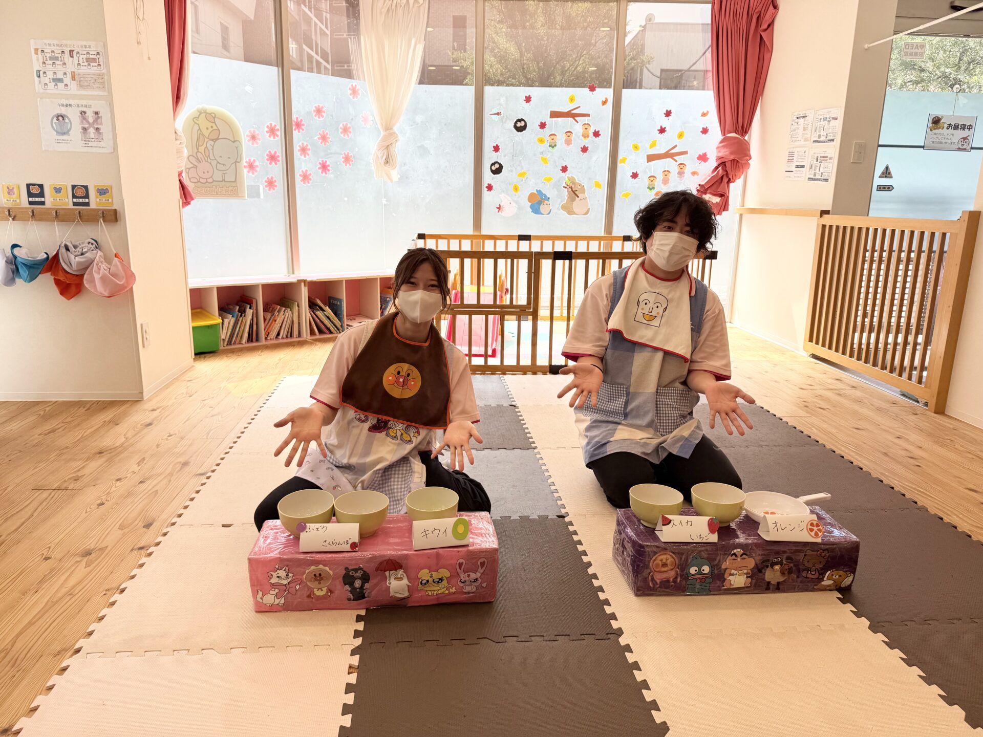 次にアンパンマンとと食パンマンがいる果物屋さんにジュースに入れる果物を買いにいきました🍇🍊🥝🍒🍎