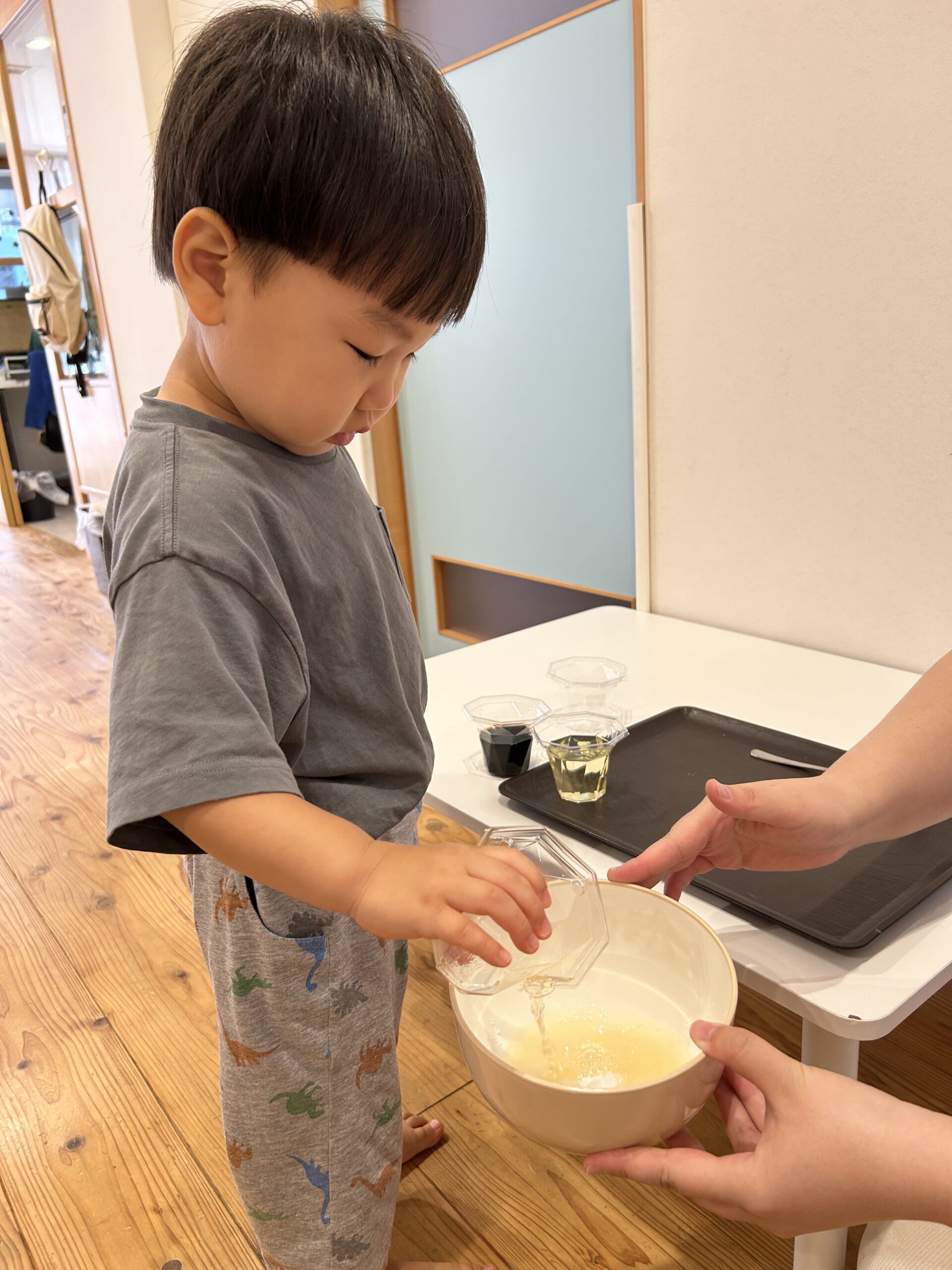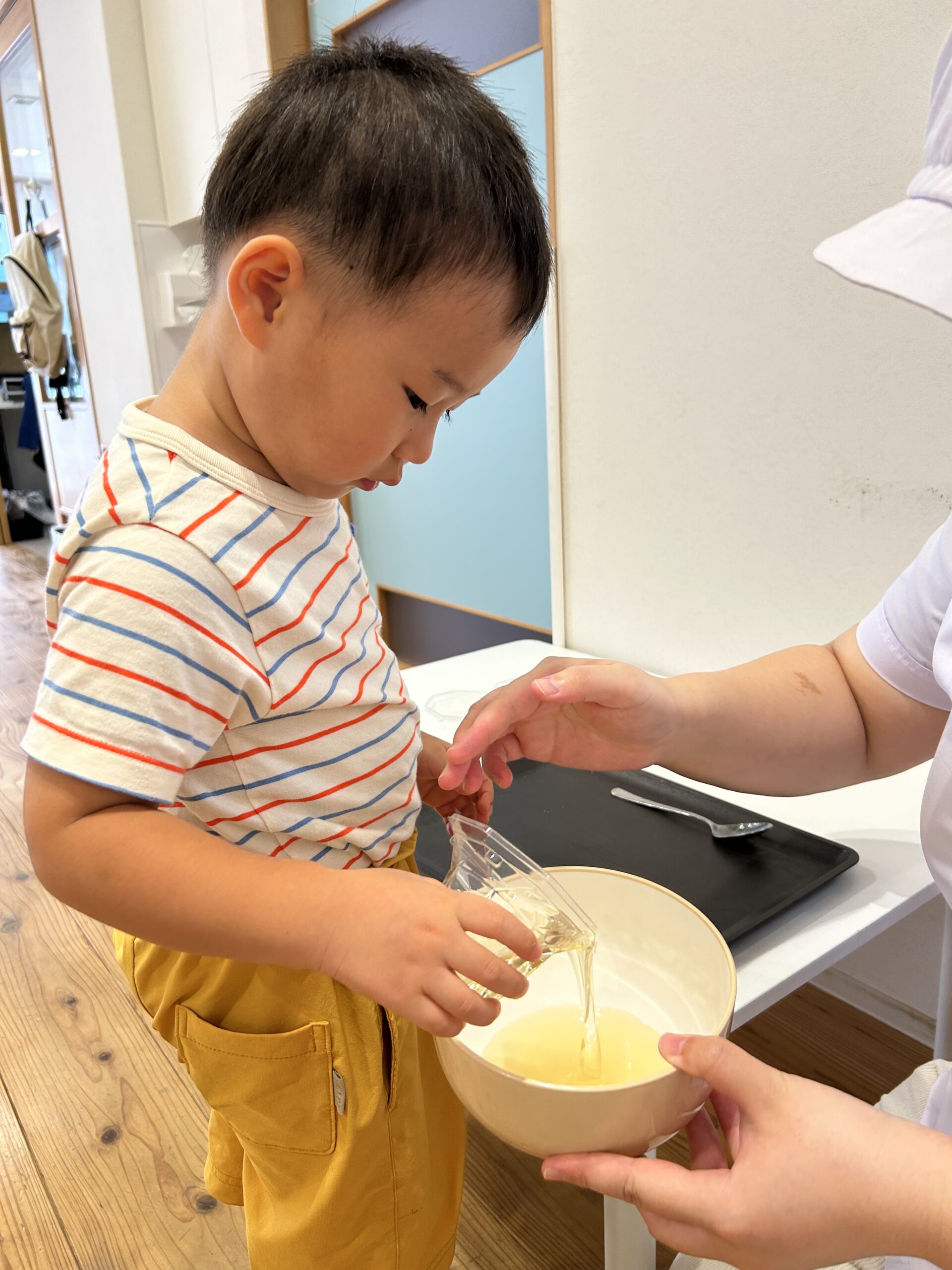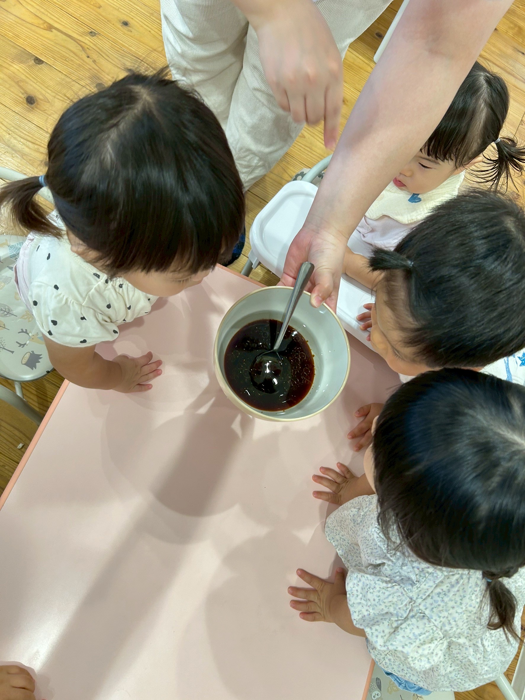 完成したドレッシングを見る子どもたち、夢中になって見ています😳