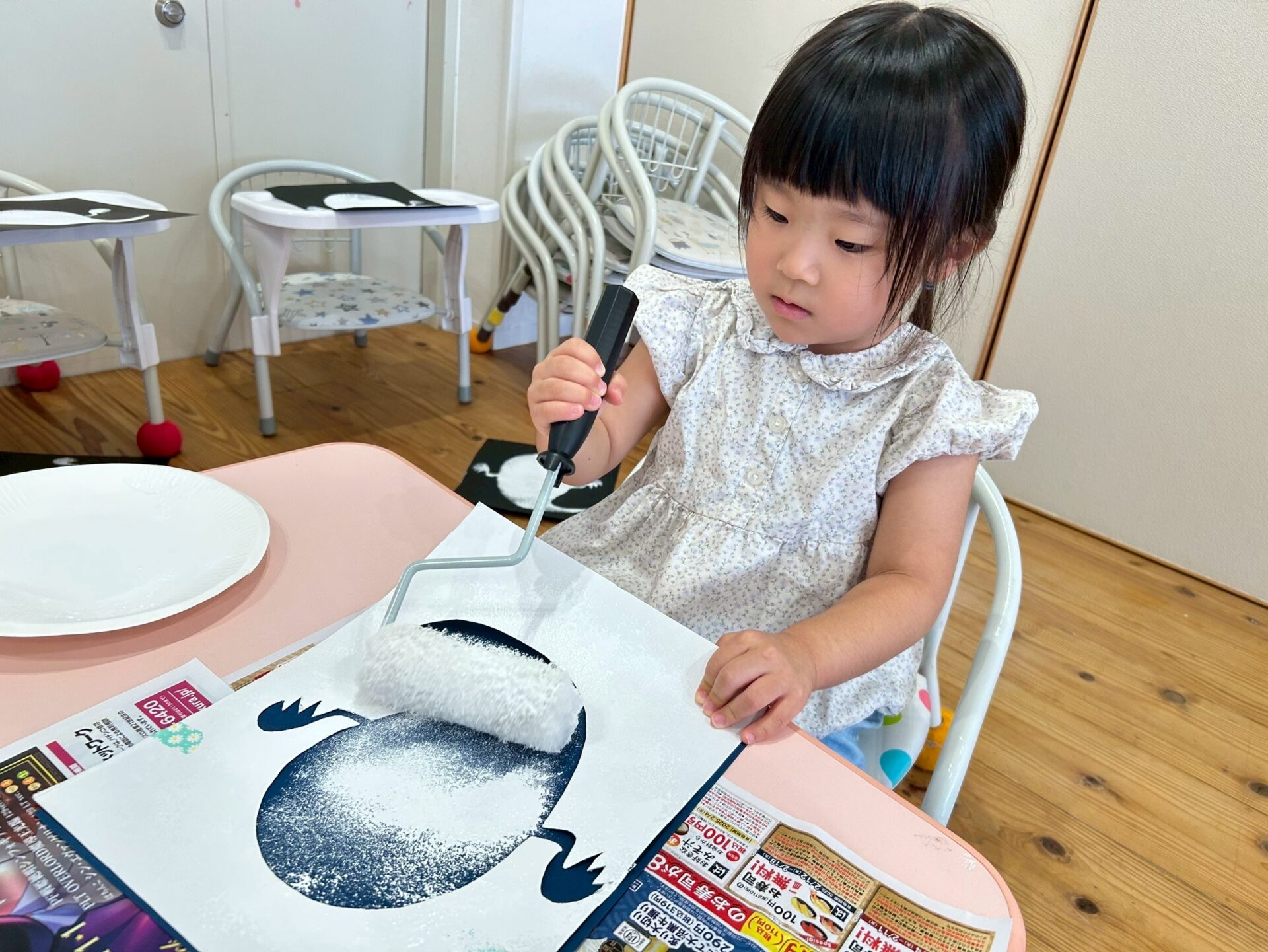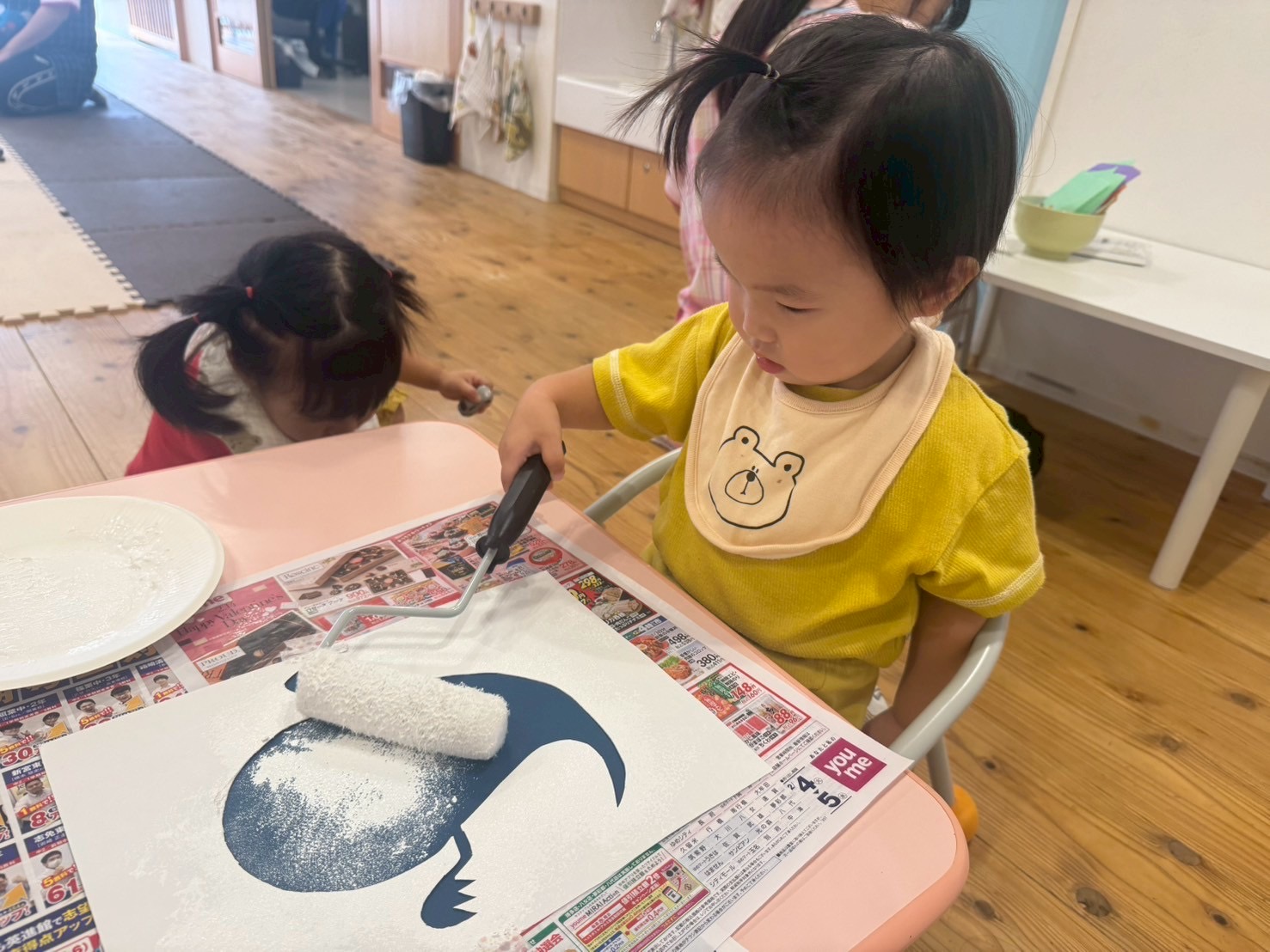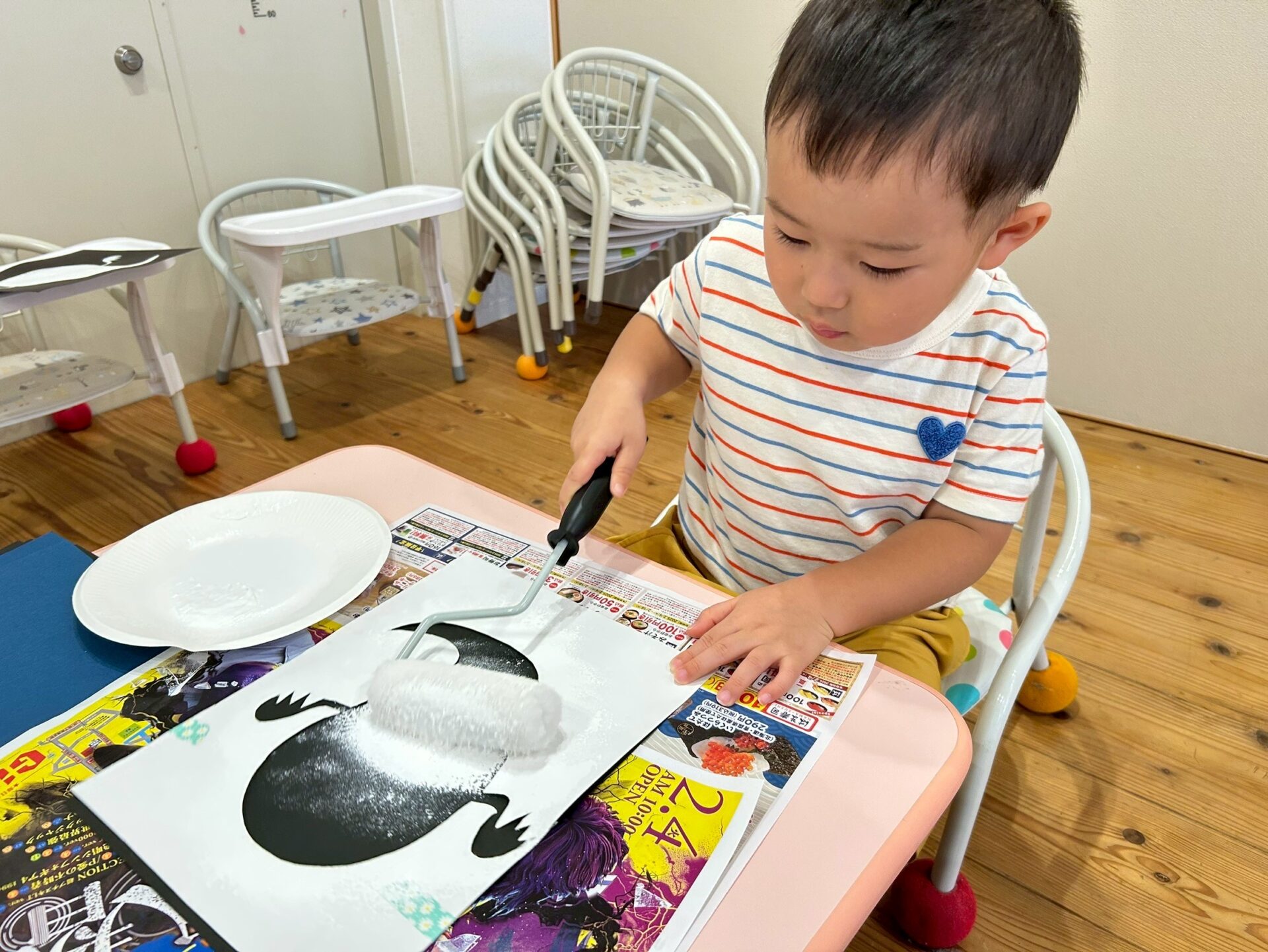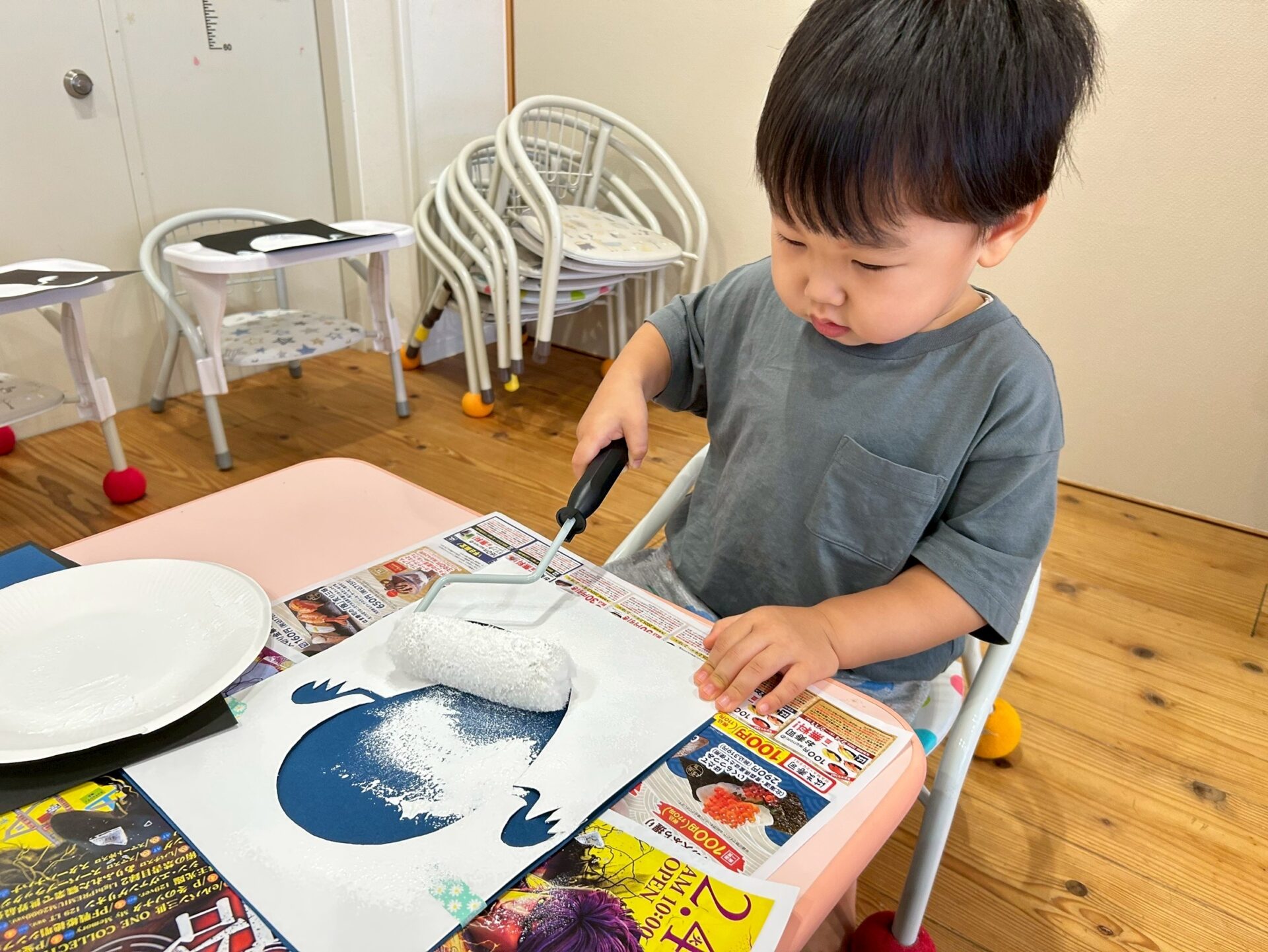 ローラーに絵の具をつけて、コロコロと転がしながら色塗りをしましたよ☺️