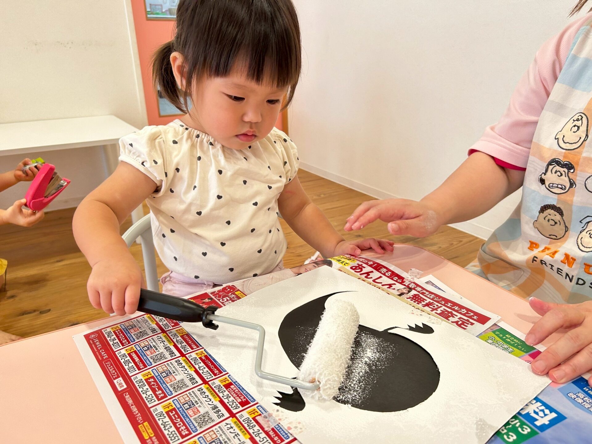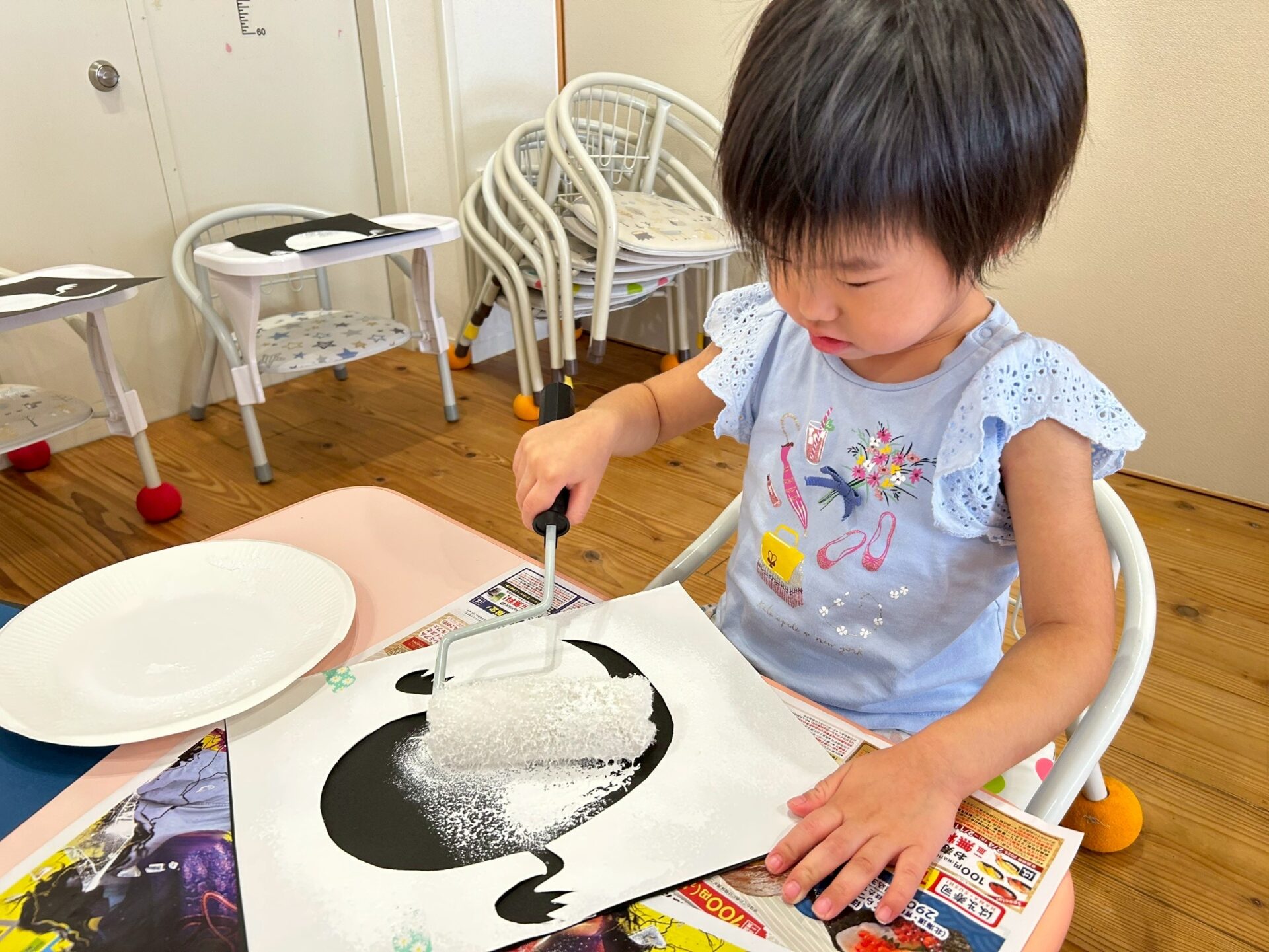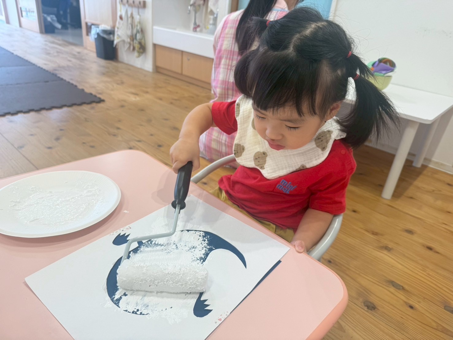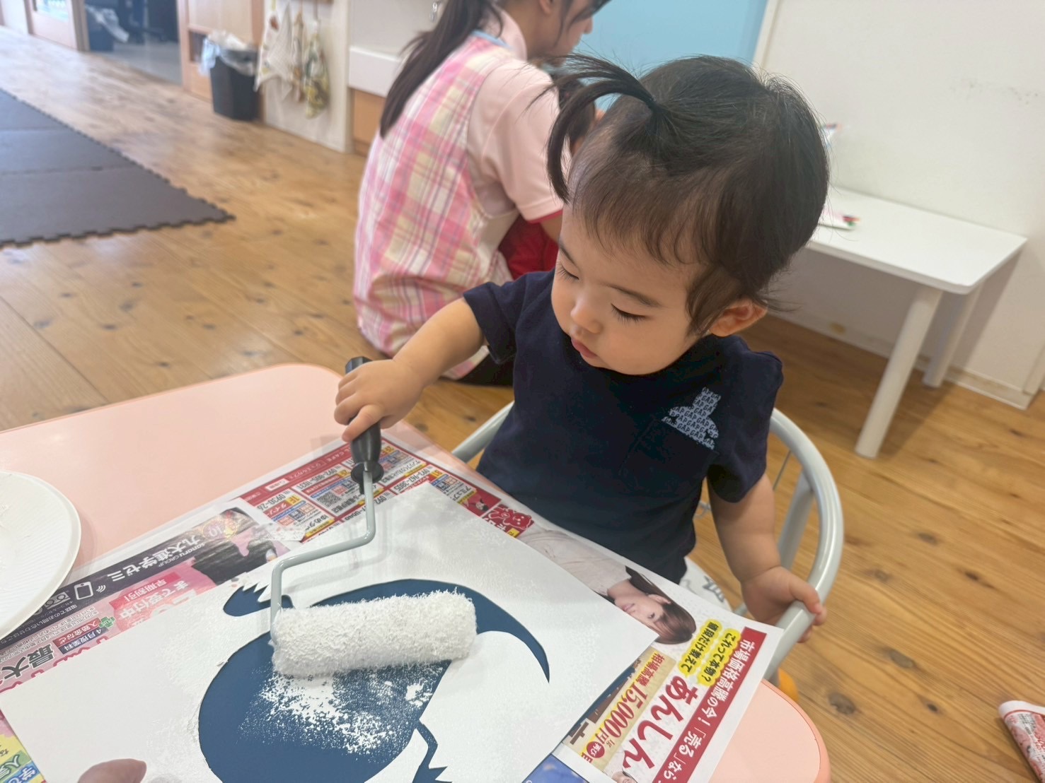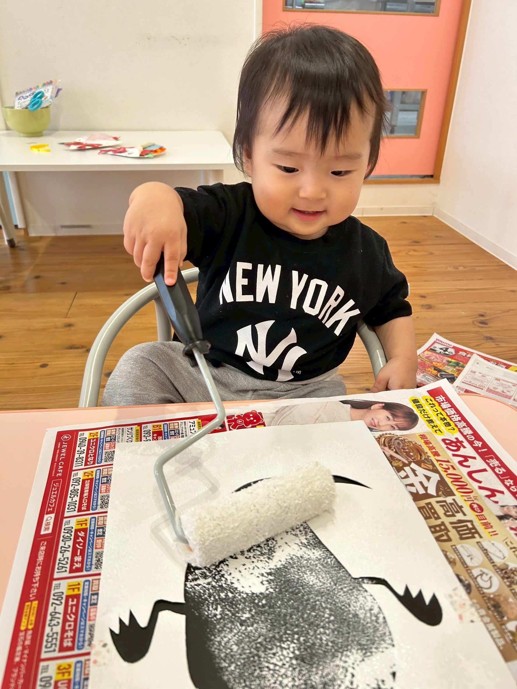 ローラーに絵の具をつけて、コロコロと転がしながら色塗りをしましたよ☺️