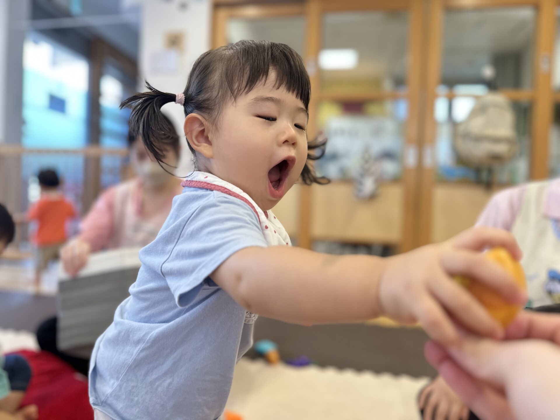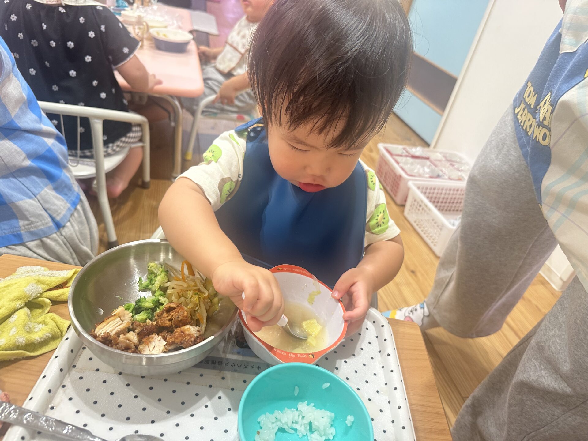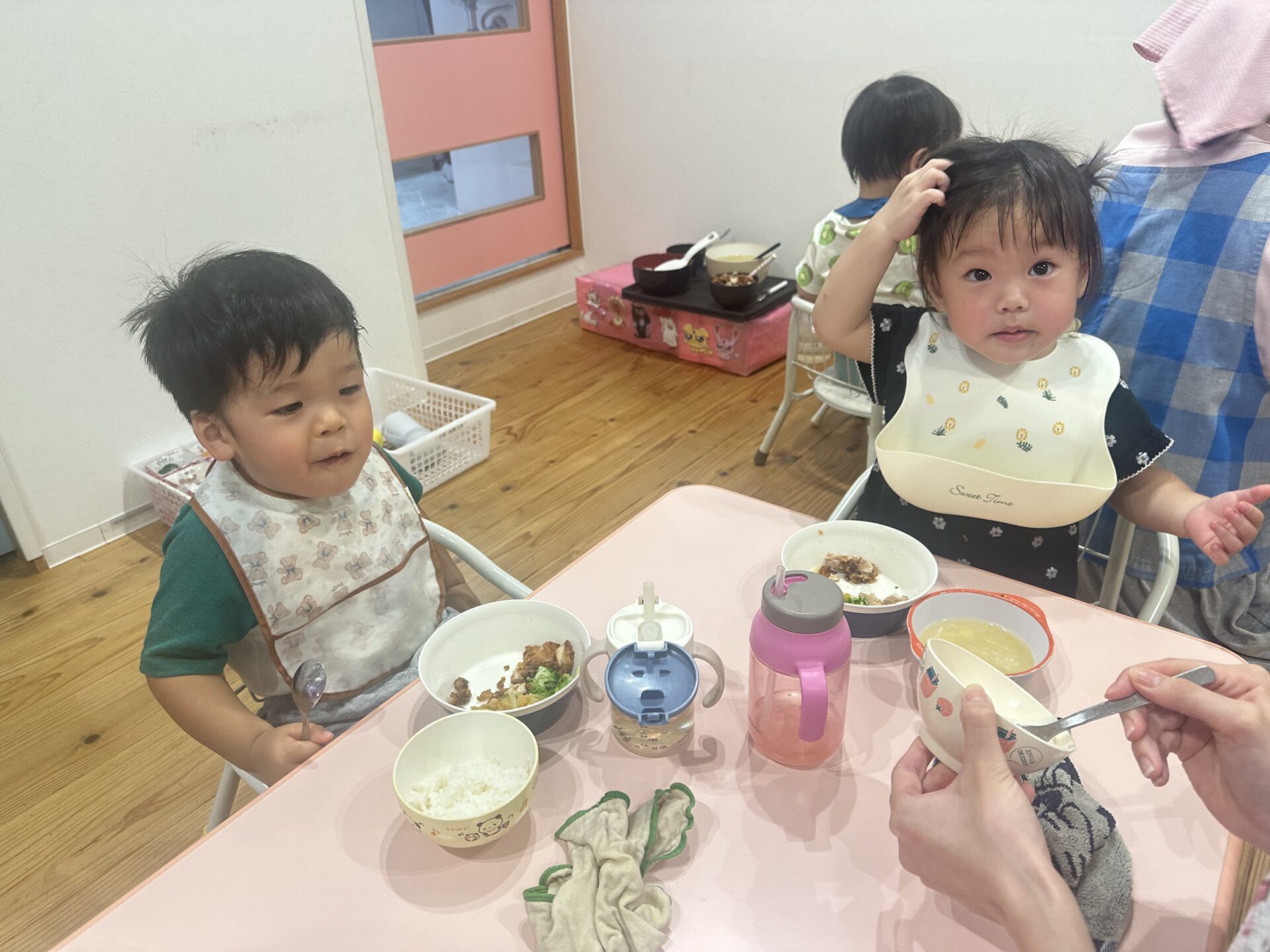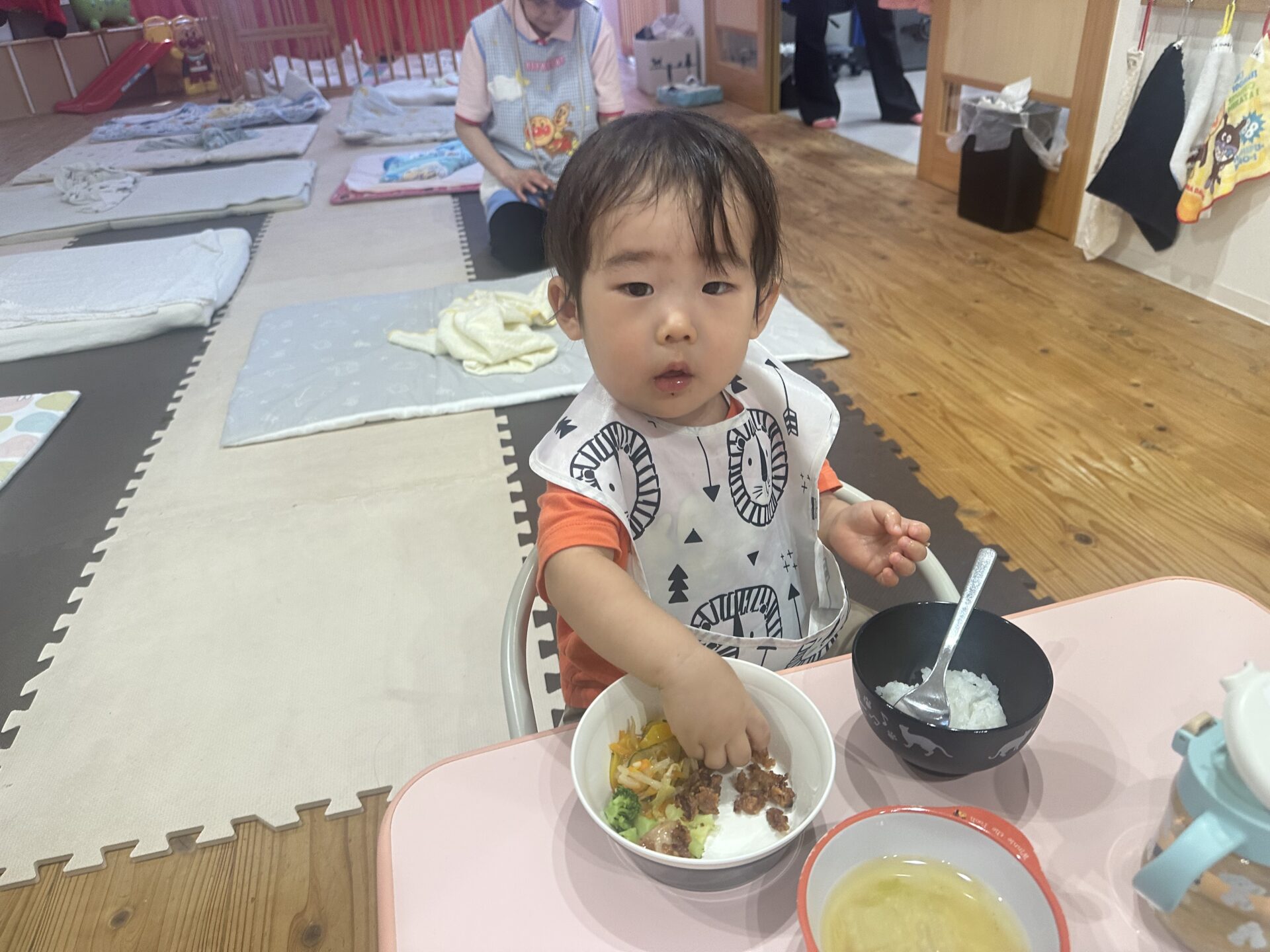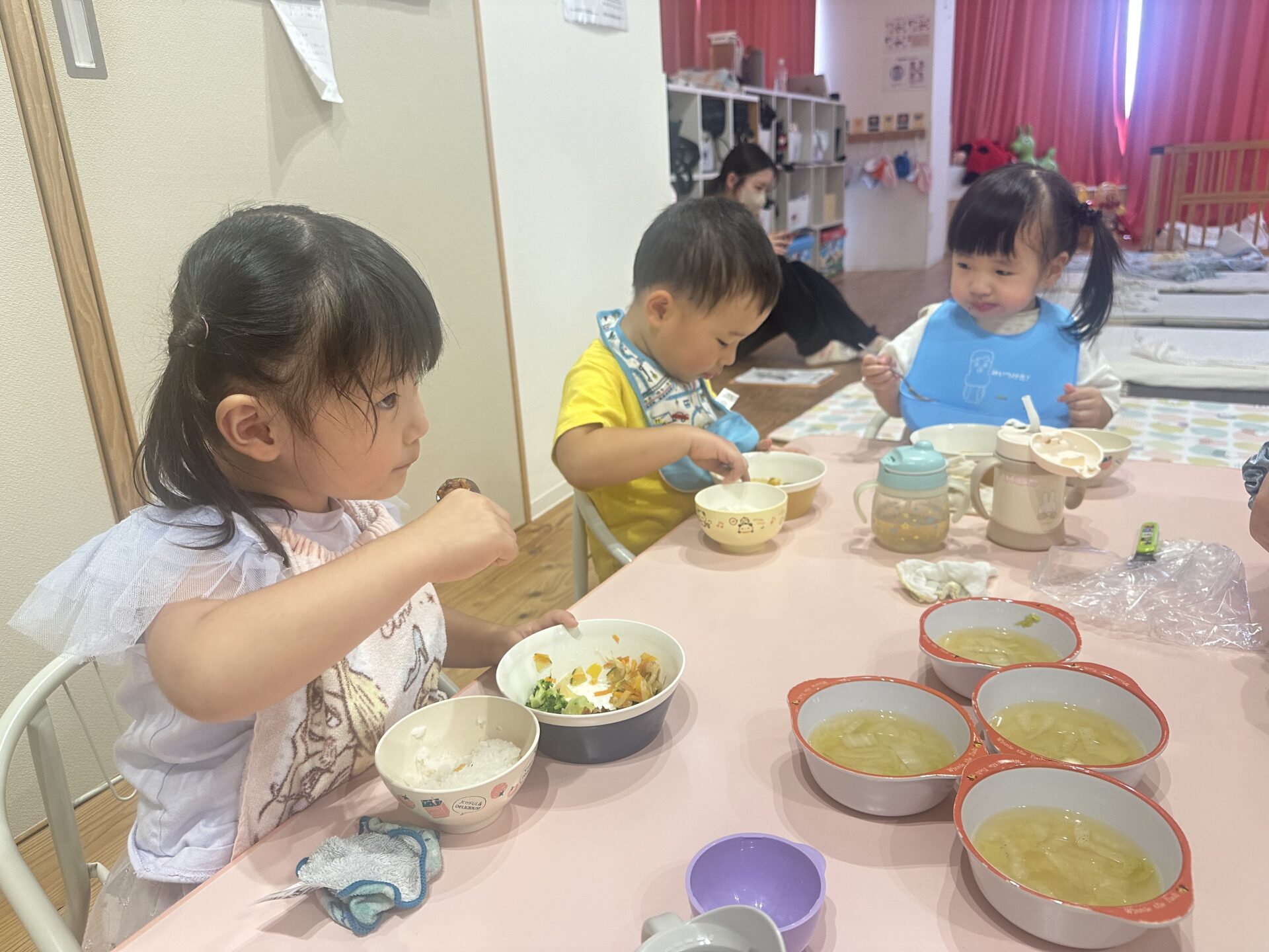 追いかけっこ、かくれんぼなどたくさん走り回ったあとは、お待ちかねの給食の時間🍙