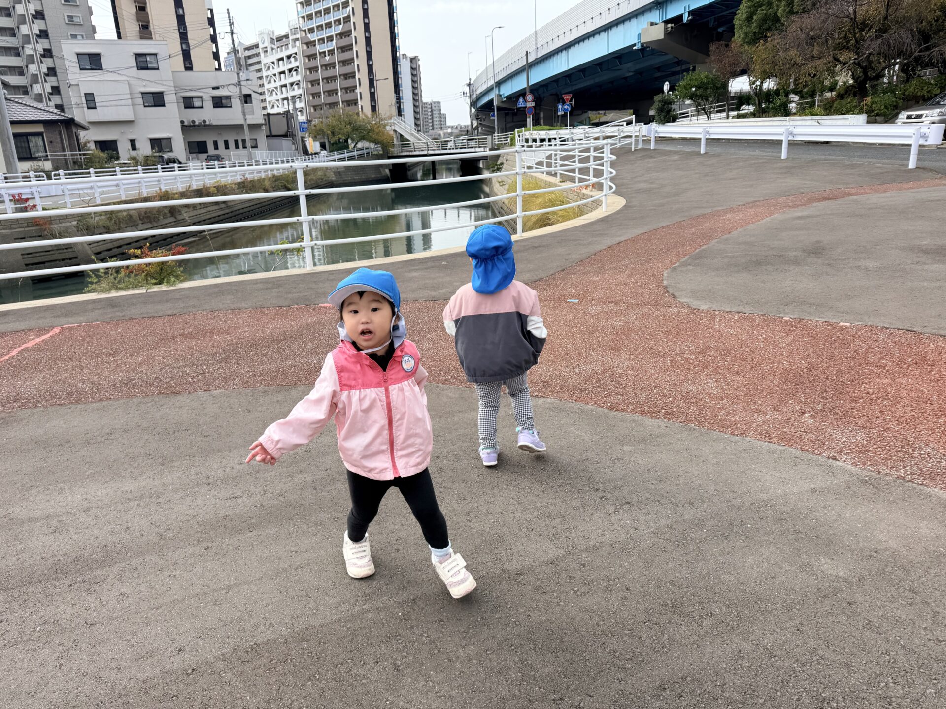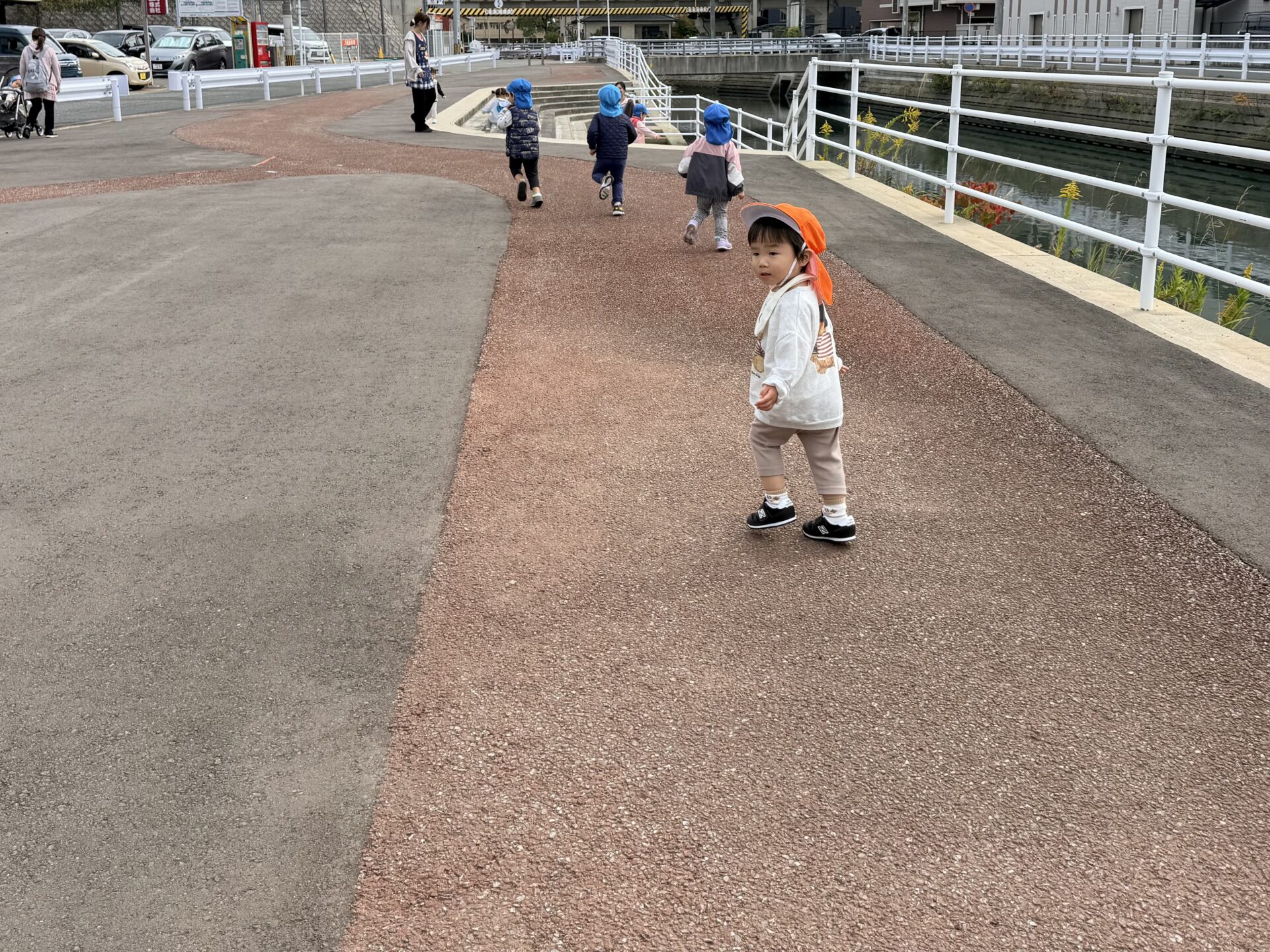 川の近くに行くと広場があるので、そこで皆で川を覗いてみたり、広場で追いかけっこをしたり、木の実を見つけて取ったり…好きな物を見つけて楽しんでいた子ども達です😆💓
