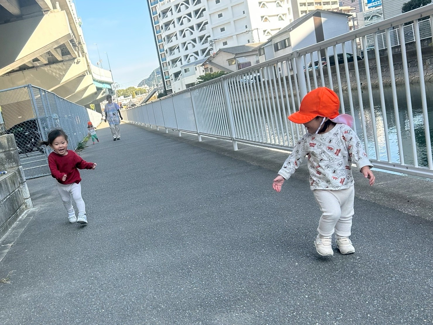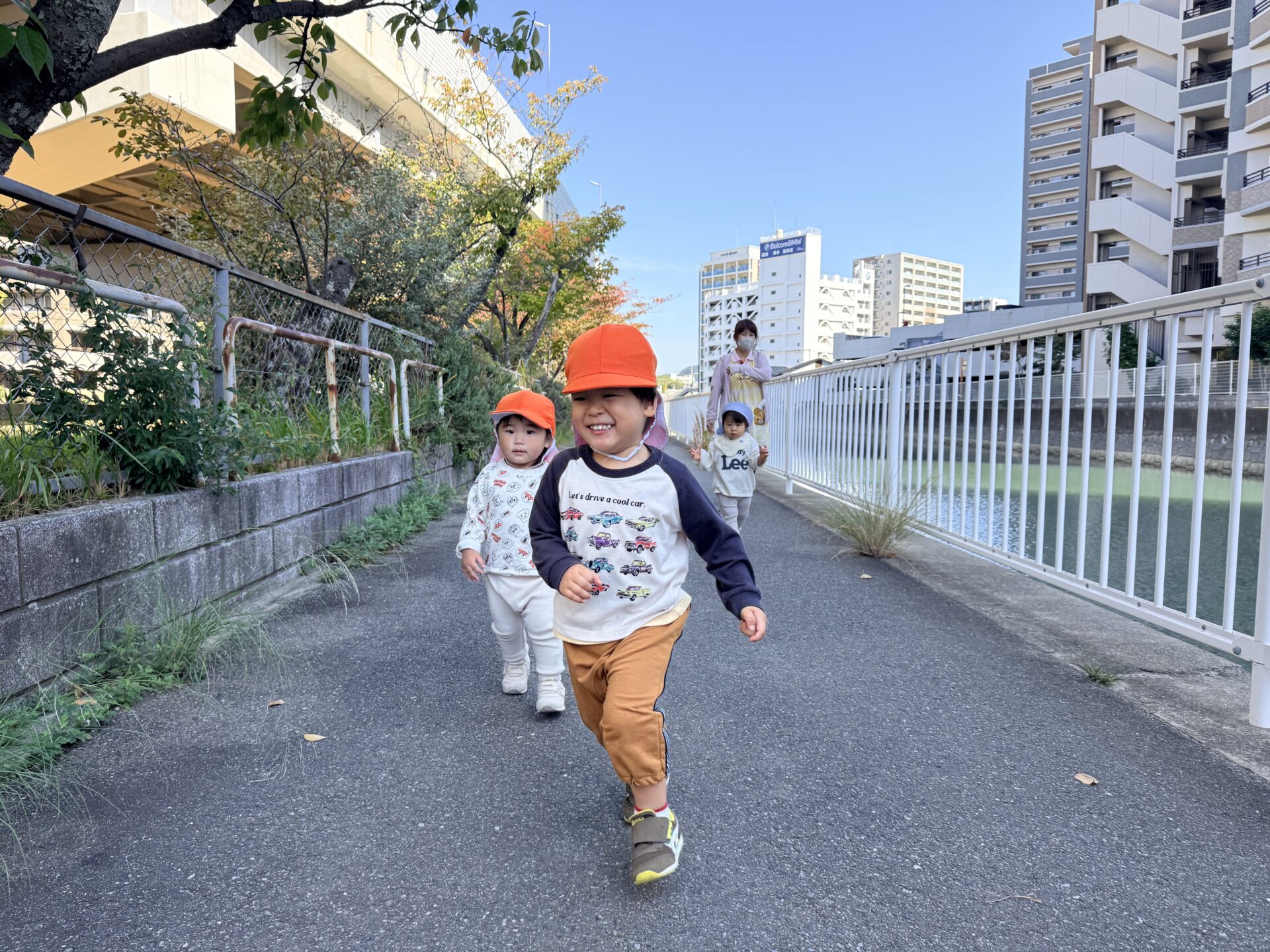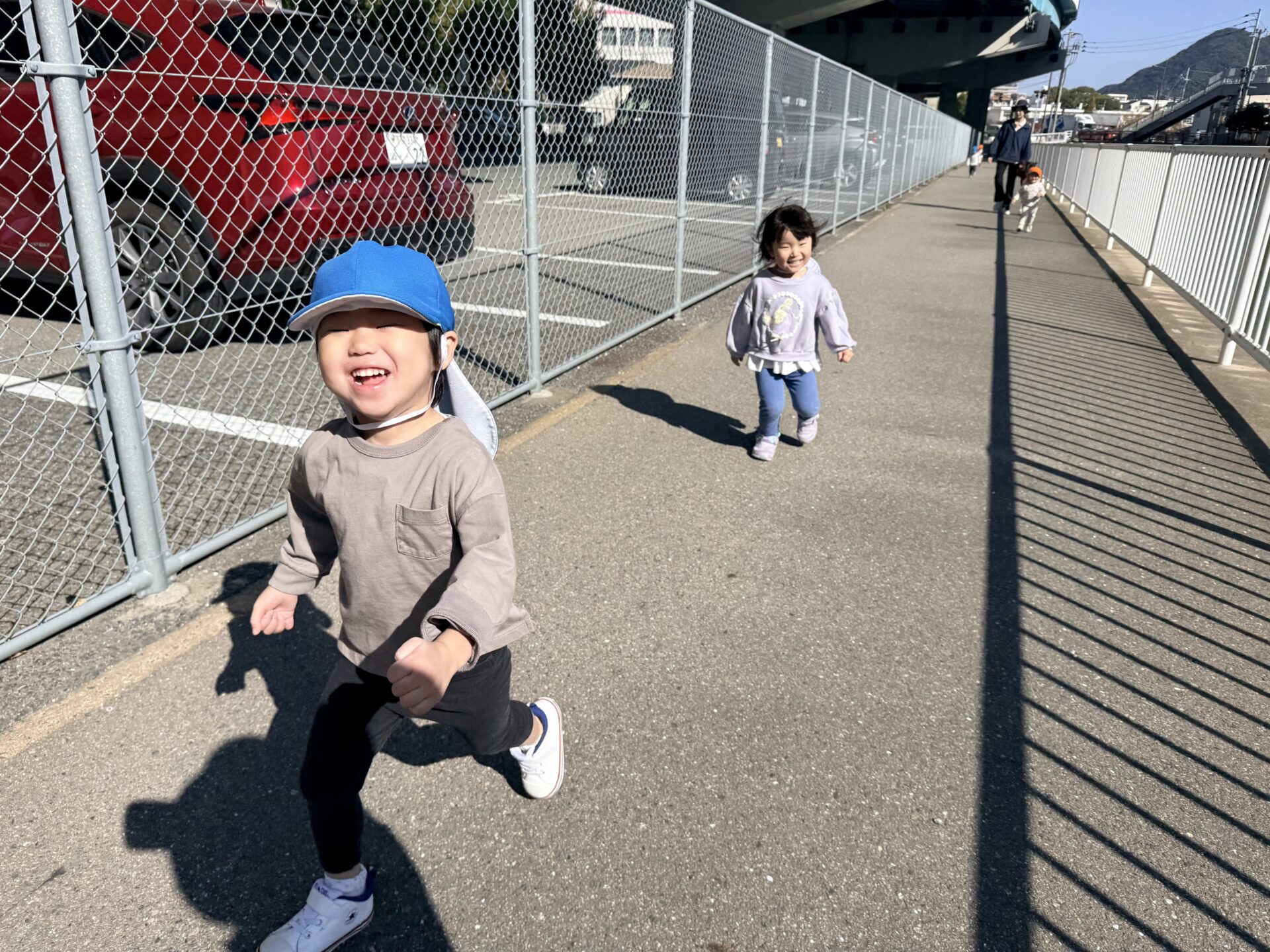 歩道橋を渡ってから、直線をみんなでよーいどん🏃♀️✨「きゃー😆」と言いながらお友達や先生と走ってニコニコな子ども達でした❤️