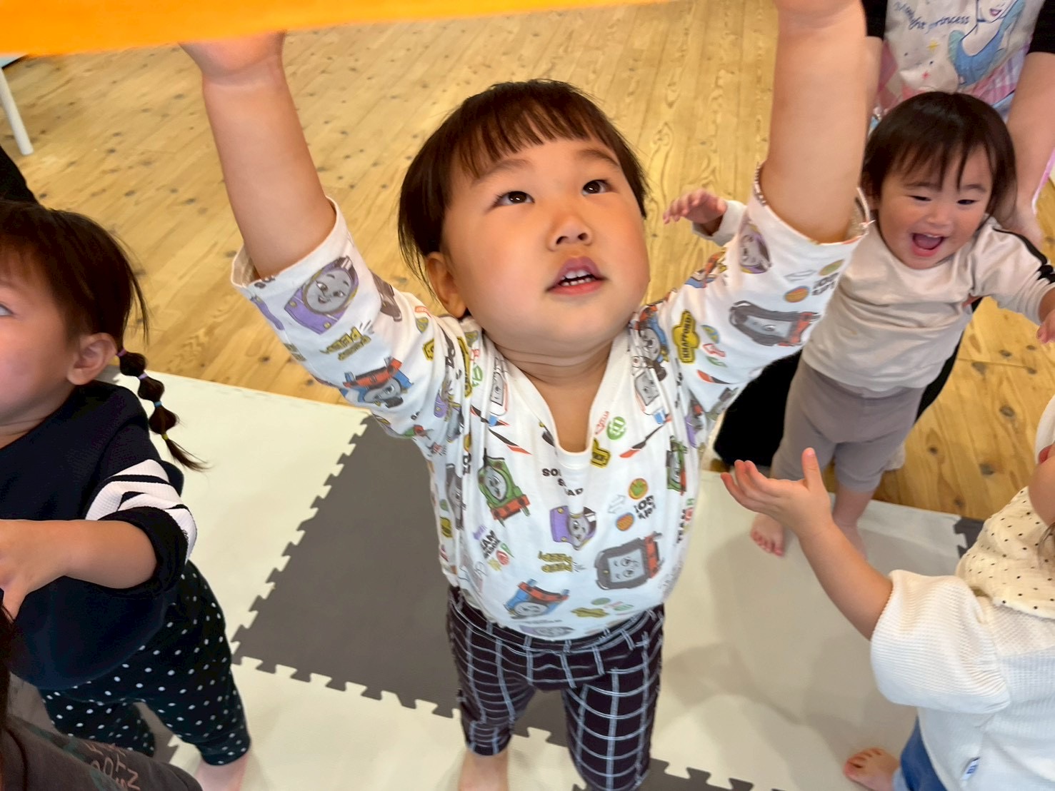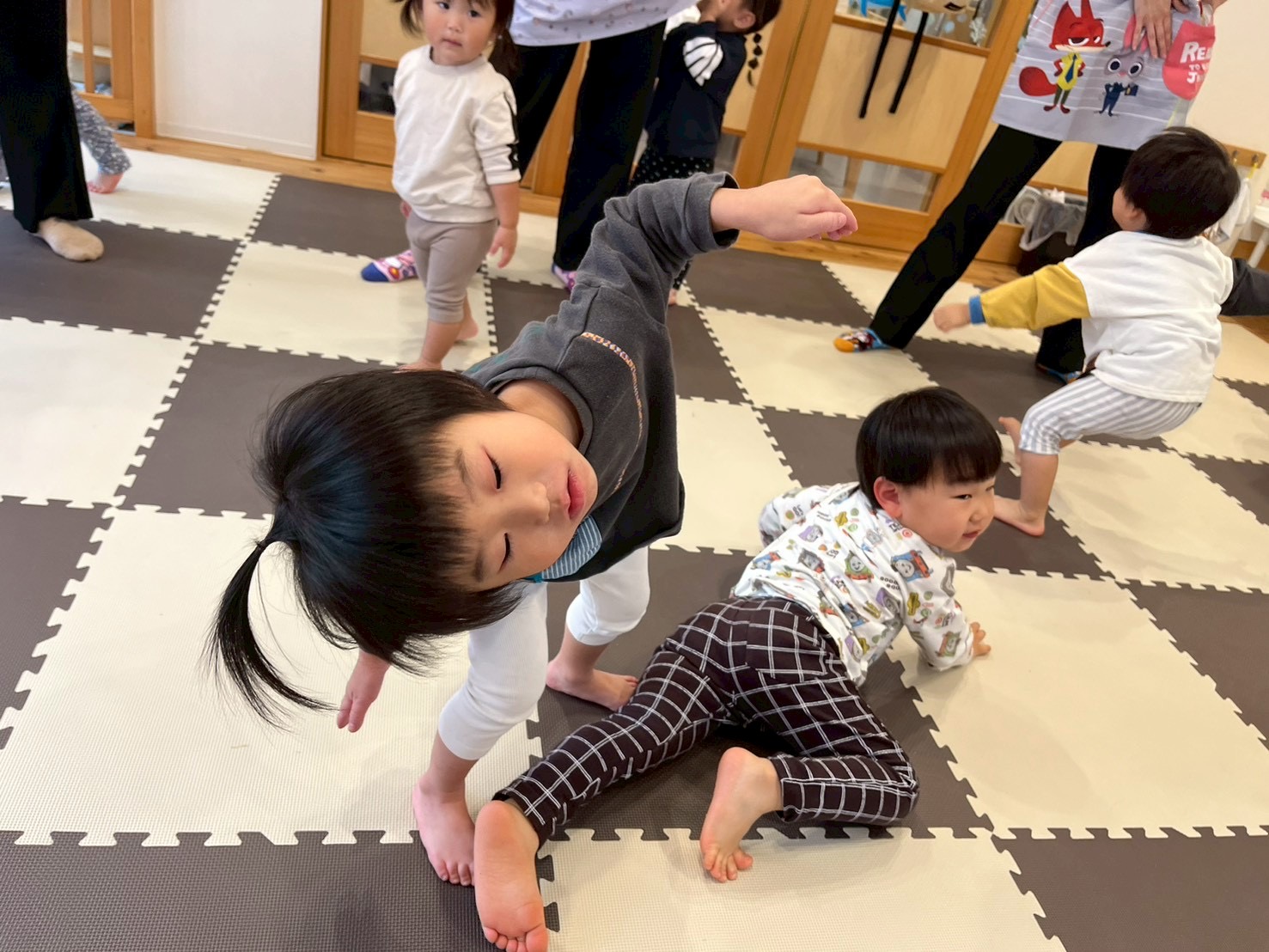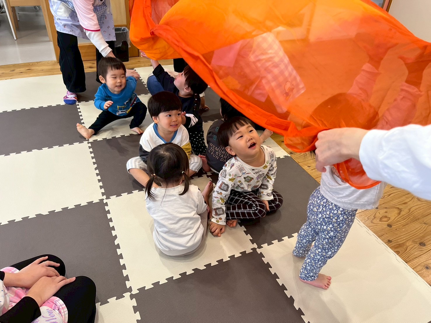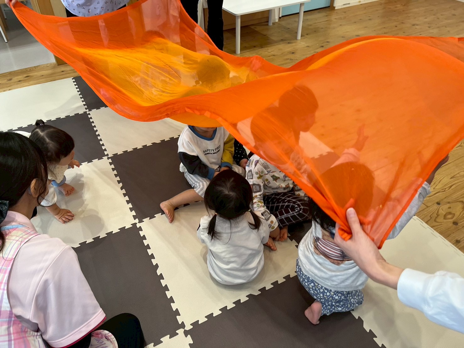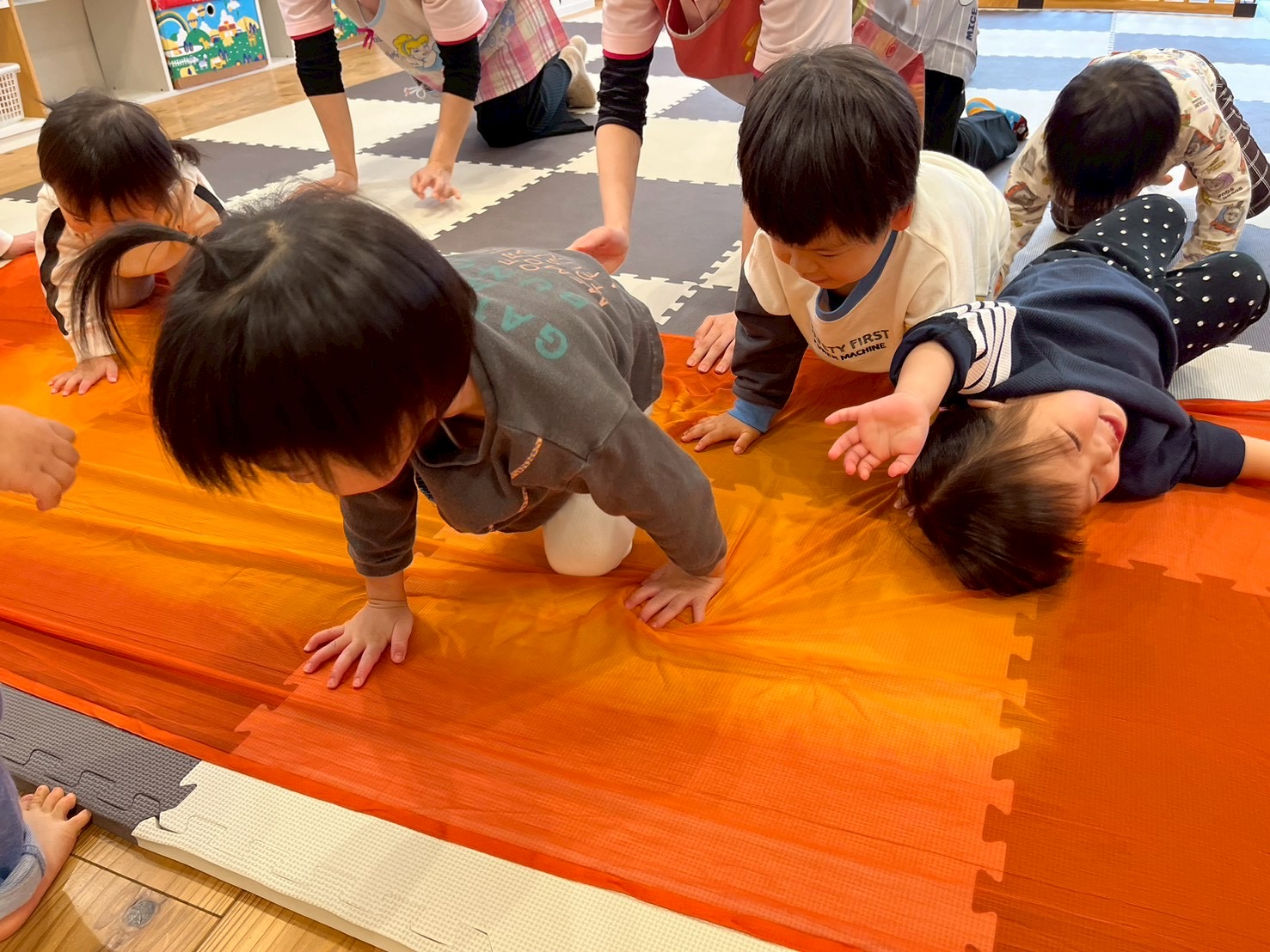 次にタンバリンを使って走ったり、つま先で歩いたり、止まったり。。「きゃー😆」と言いながらとても楽しんでいました⸜( *´꒳`*)⸝それから布を使って「ピーカブー」やハイハイなど体をいっぱい動かして楽しみました😊💕