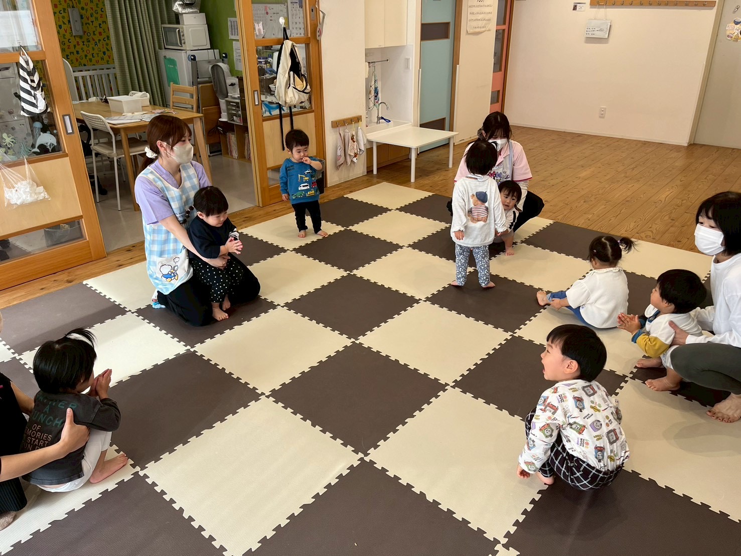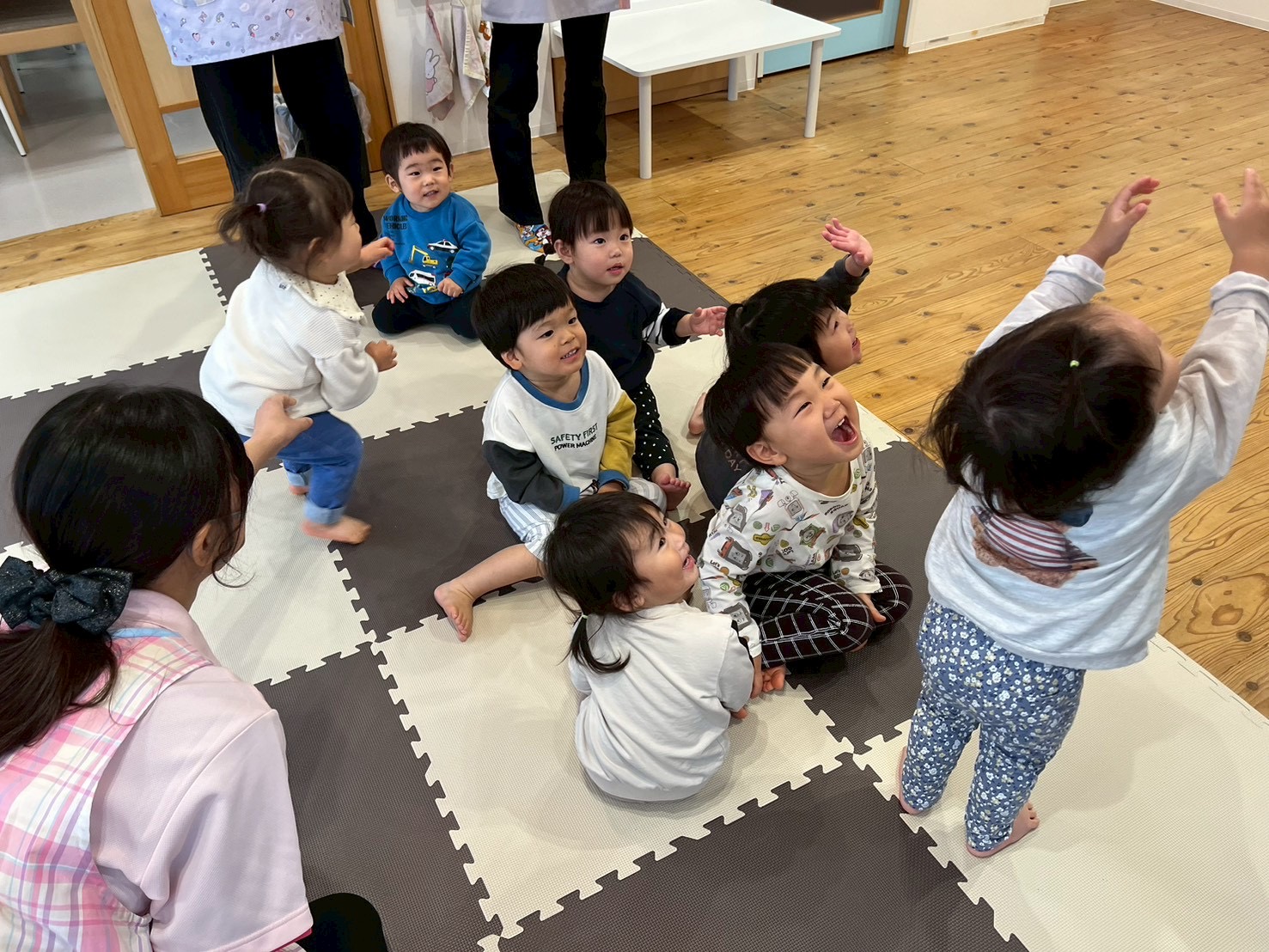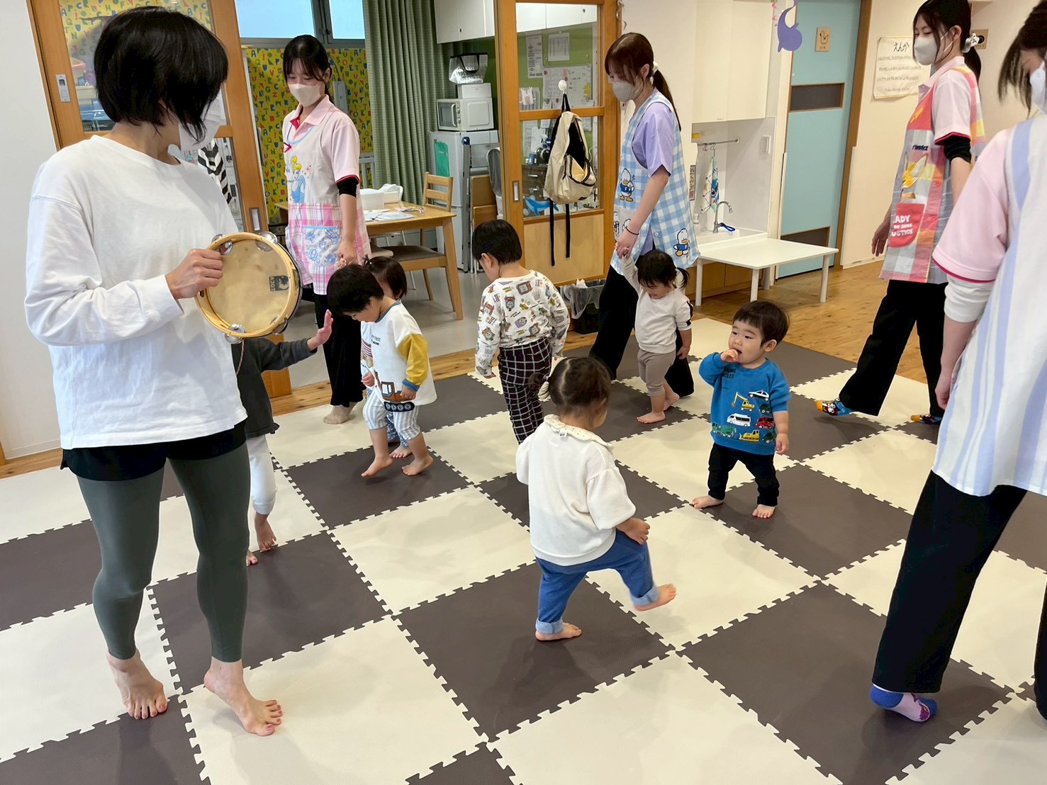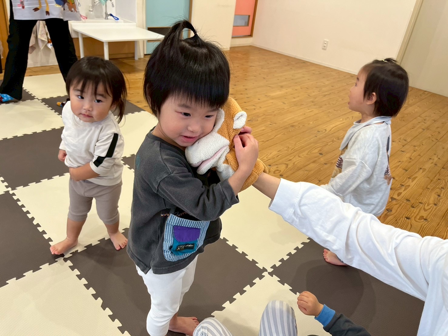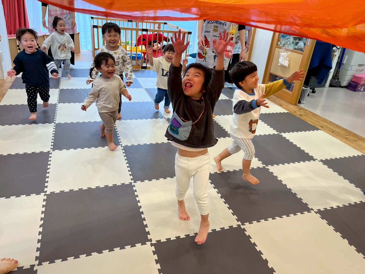 次にタンバリンを使って走ったり、つま先で歩いたり、止まったり。。「きゃー😆」と言いながらとても楽しんでいました⸜( *´꒳`*)⸝それから布を使って「ピーカブー」やハイハイなど体をいっぱい動かして楽しみました😊💕