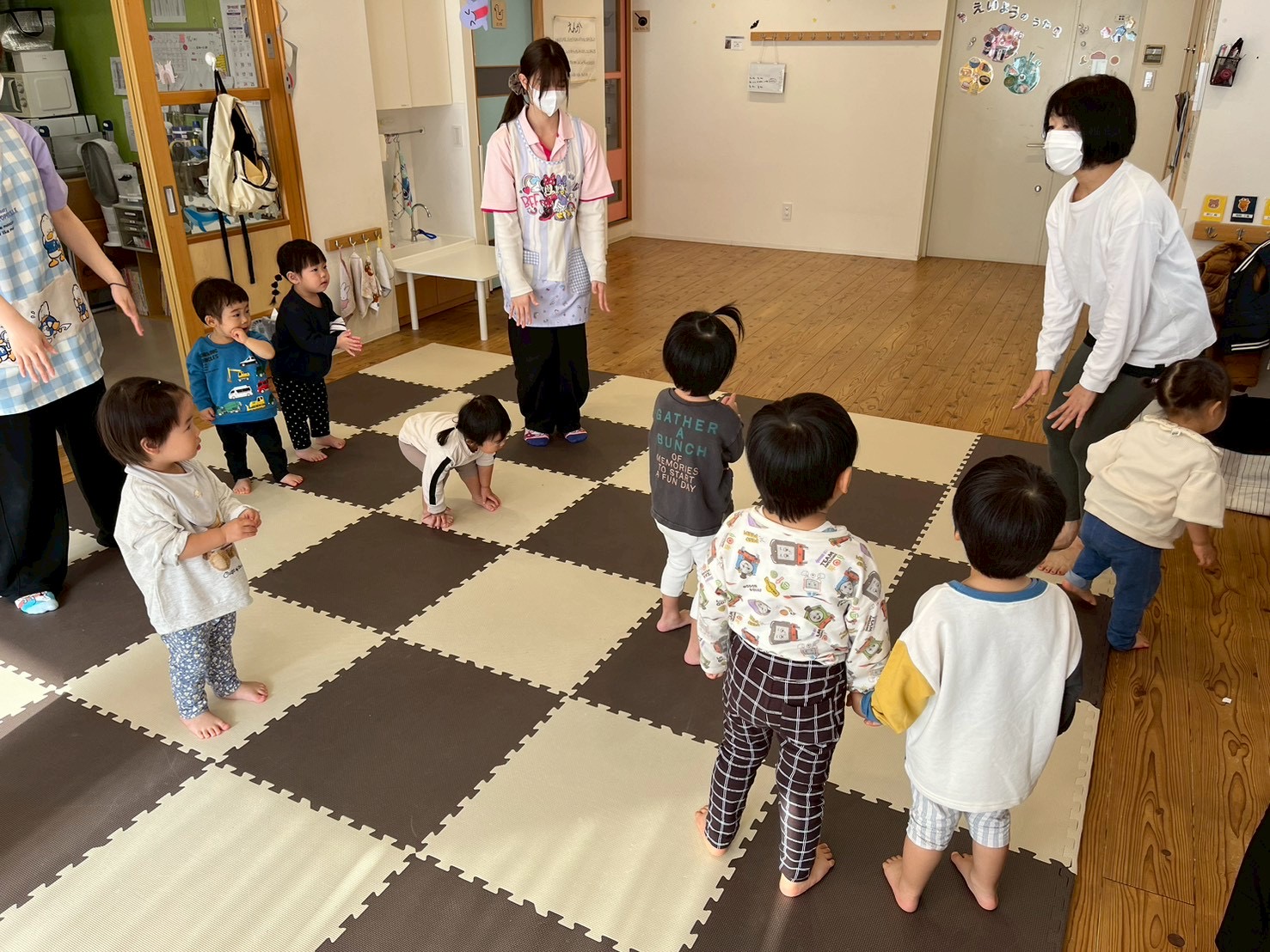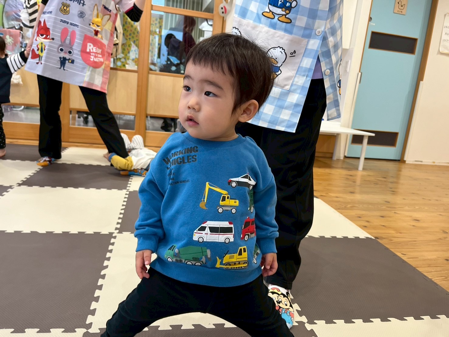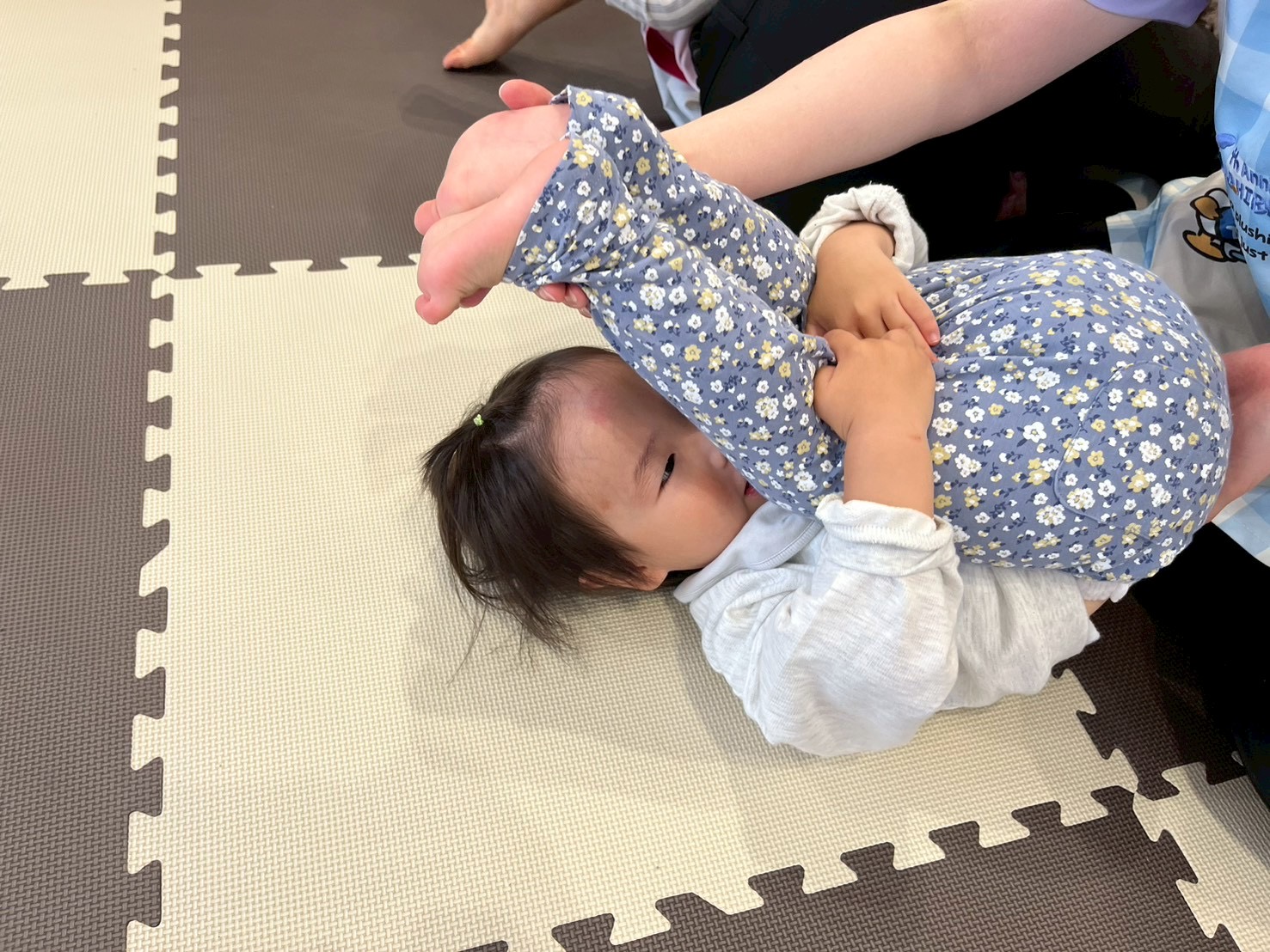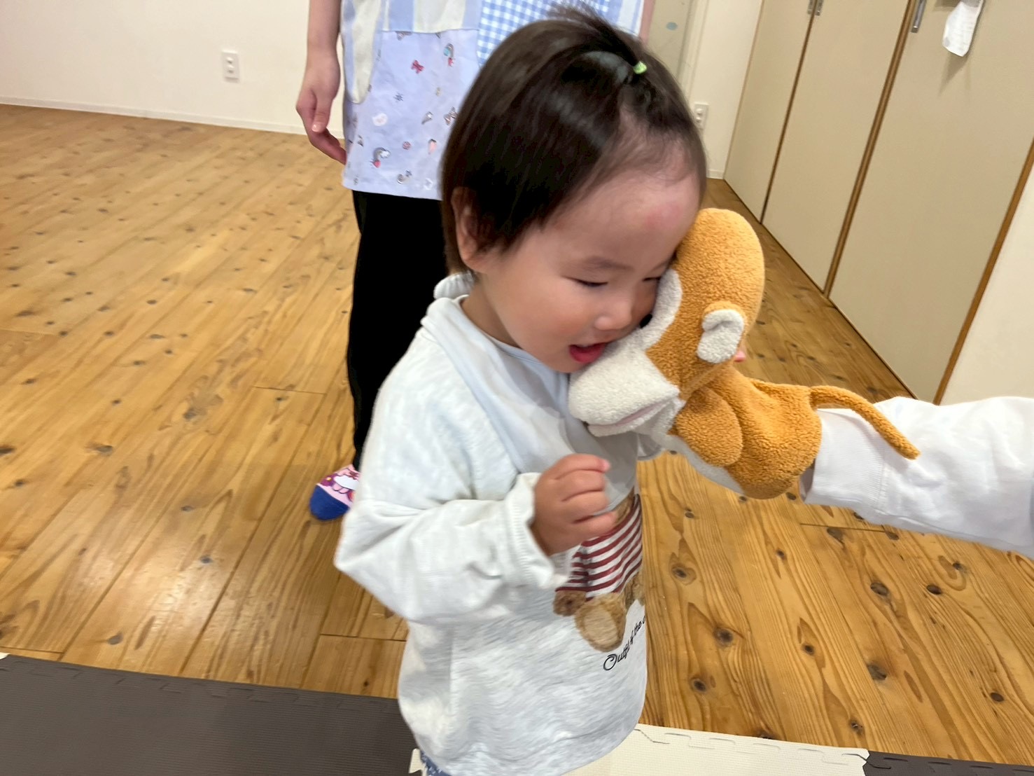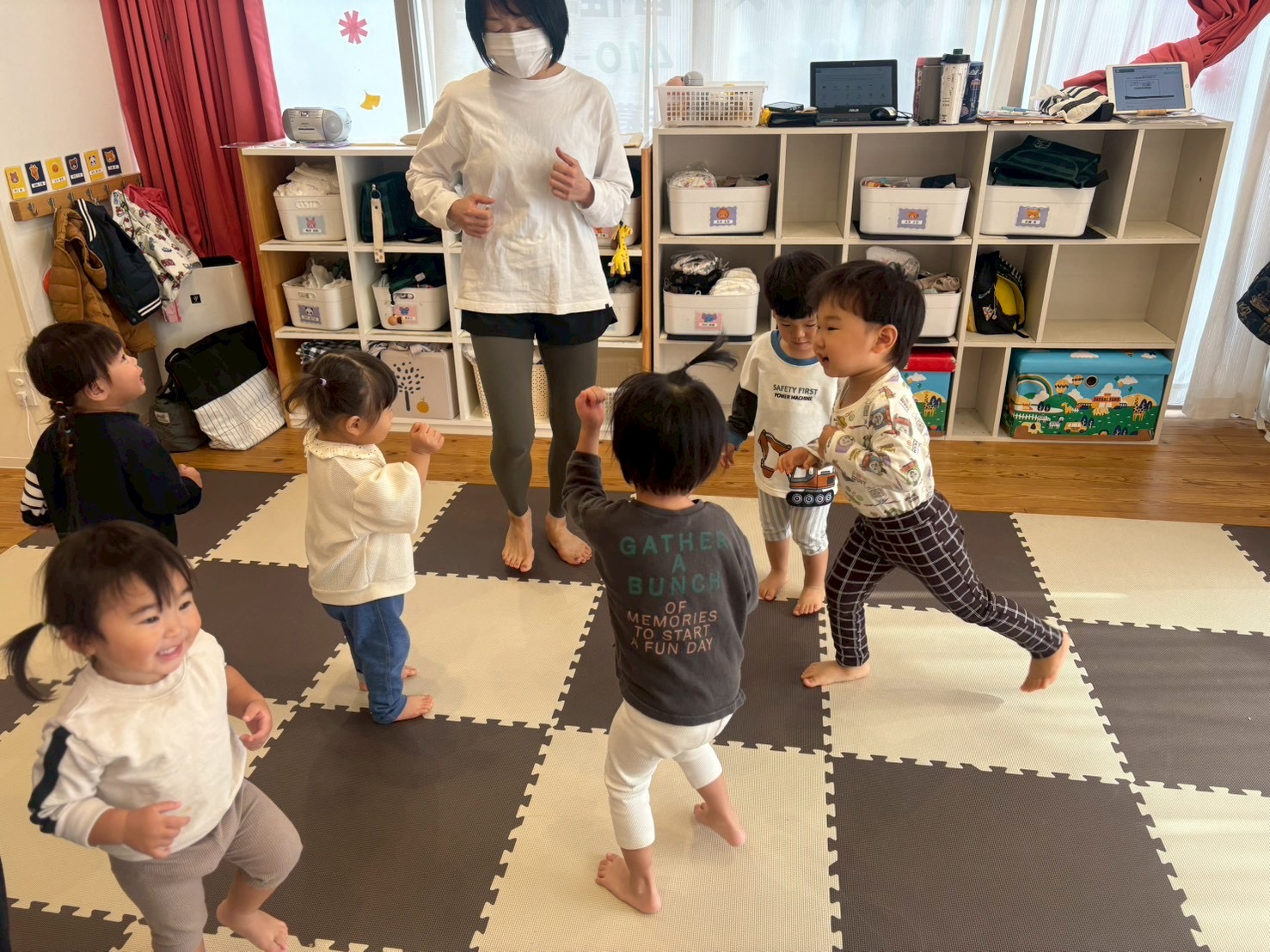 次にタンバリンを使って走ったり、つま先で歩いたり、止まったり。。「きゃー😆」と言いながらとても楽しんでいました⸜( *´꒳`*)⸝それから布を使って「ピーカブー」やハイハイなど体をいっぱい動かして楽しみました😊💕