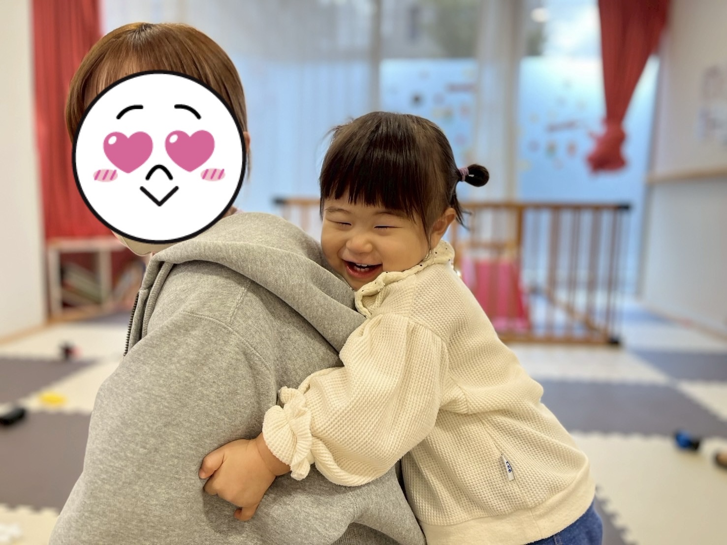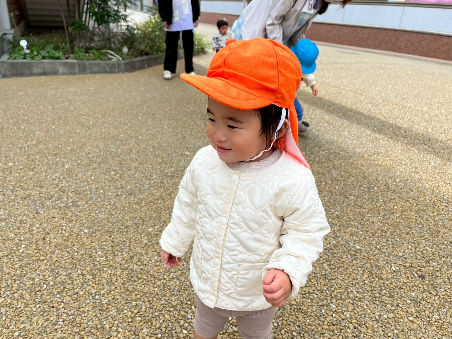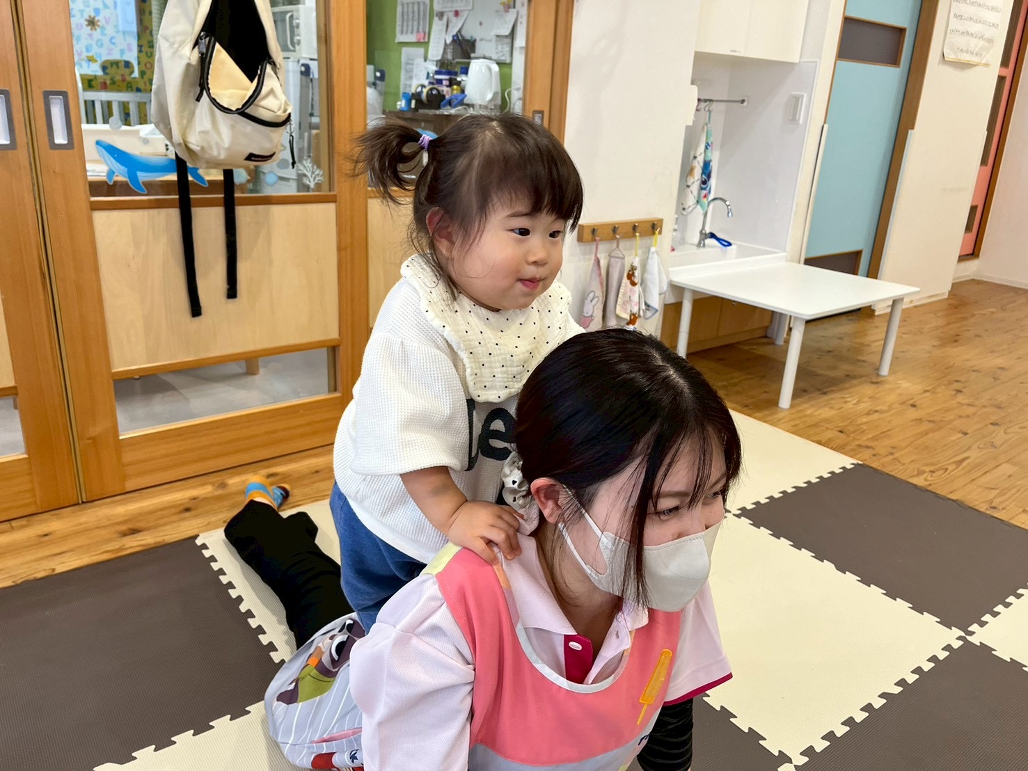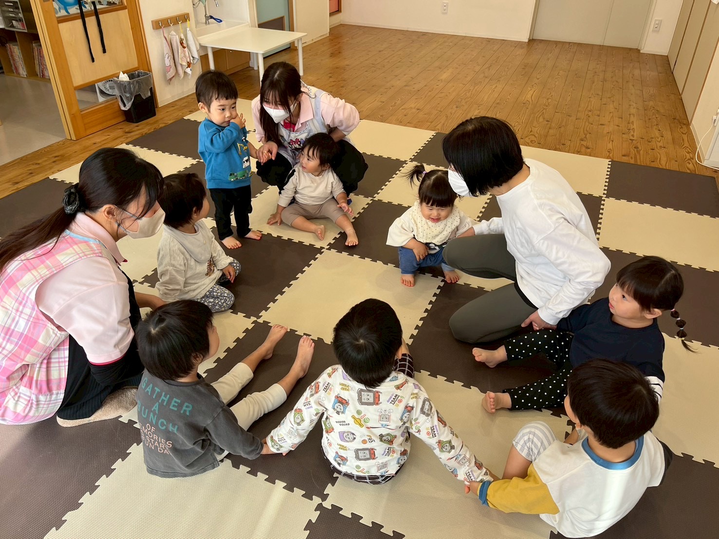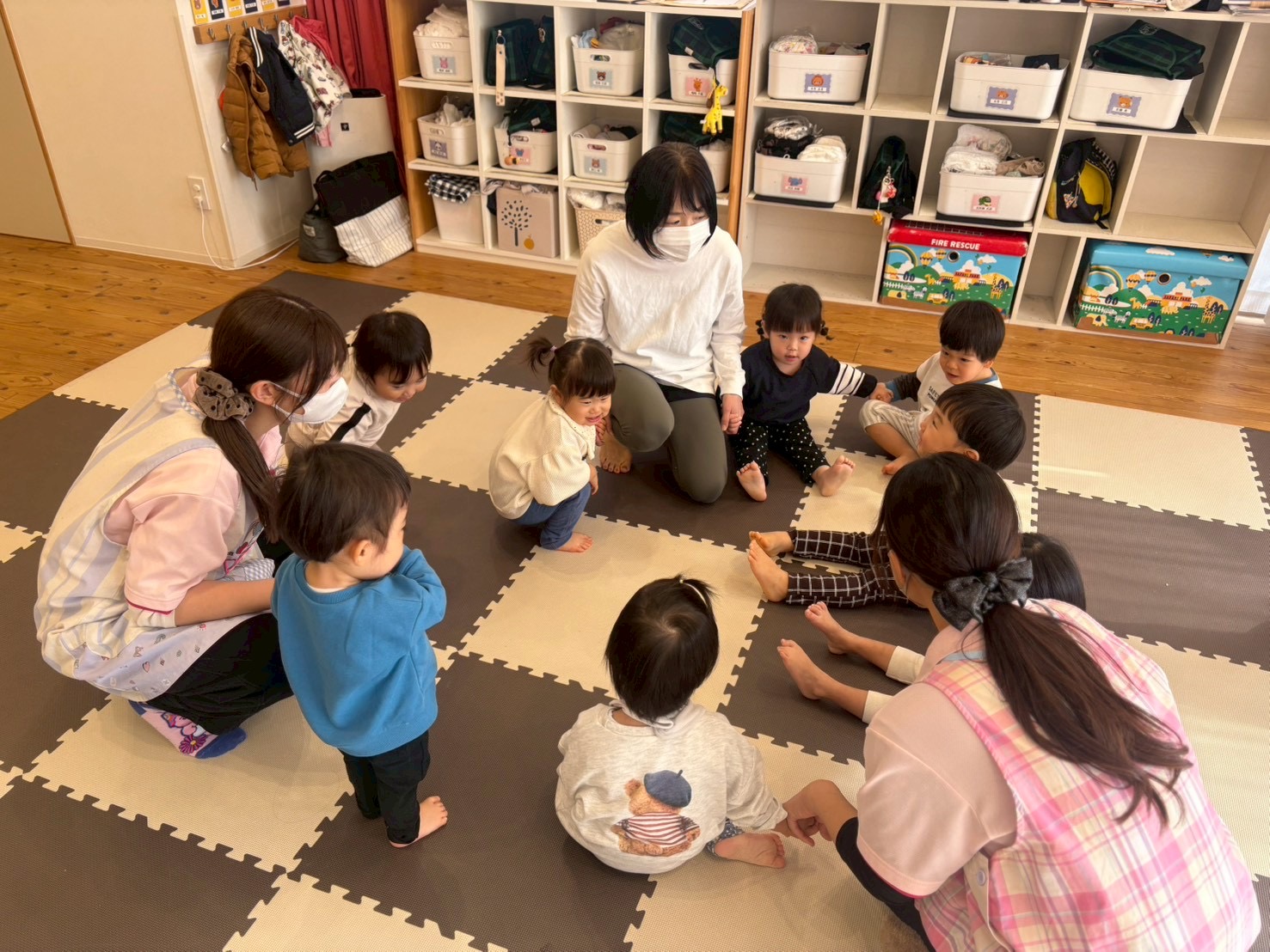 次にタンバリンを使って走ったり、つま先で歩いたり、止まったり。。「きゃー😆」と言いながらとても楽しんでいました⸜( *´꒳`*)⸝それから布を使って「ピーカブー」やハイハイなど体をいっぱい動かして楽しみました😊💕