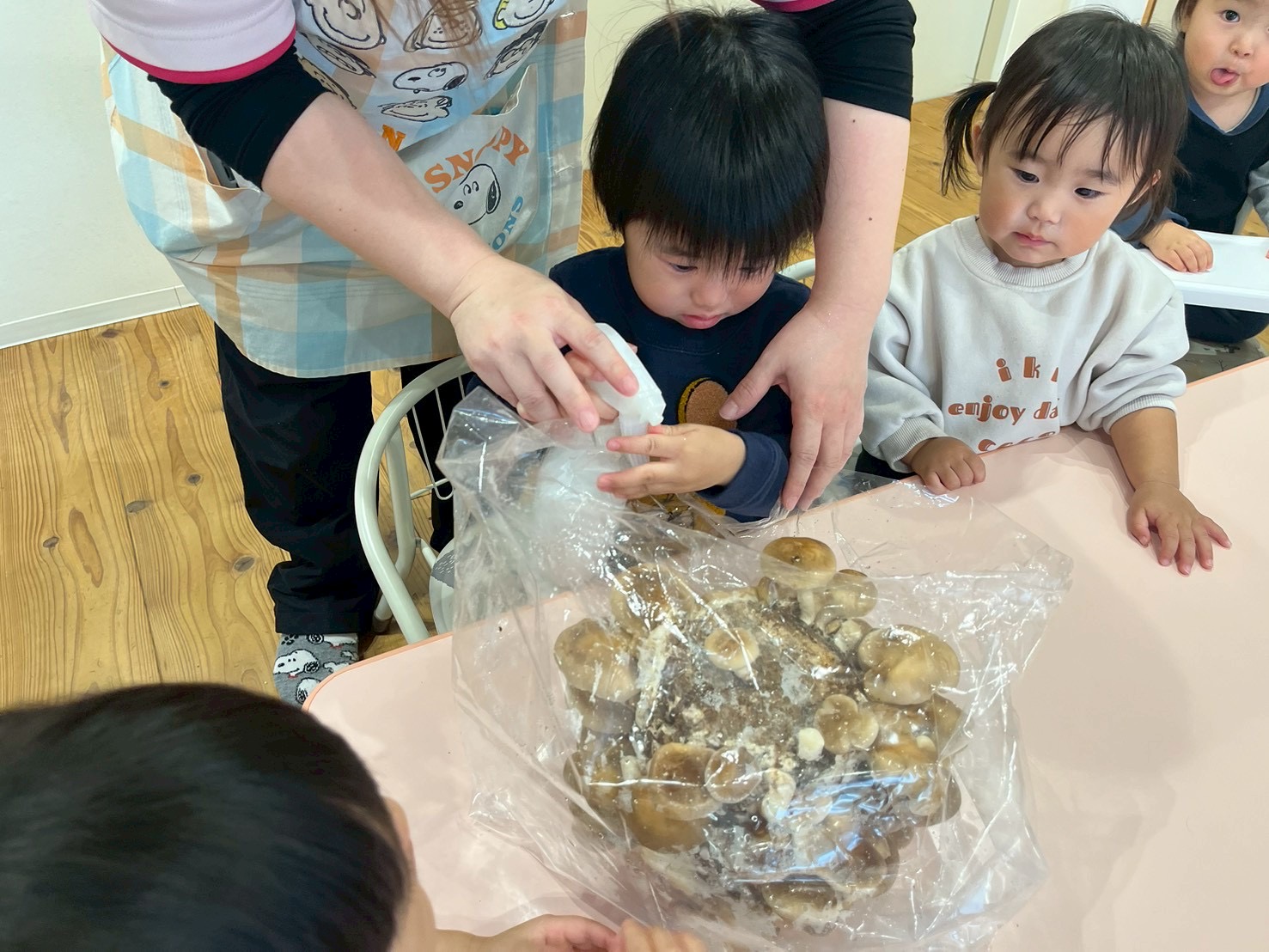 少し前からしいたけ栽培をしているので、今日も子ども達と一緒に水やりをしました😁大きくなったしいたけは先生が収穫して、子ども達も実際にしいたけを触ったり、匂ってみたりして興味津々なようでした😆✨収穫した給食のお味噌汁に使ってくれました🎶たくさん大きくな〜れ😍💕