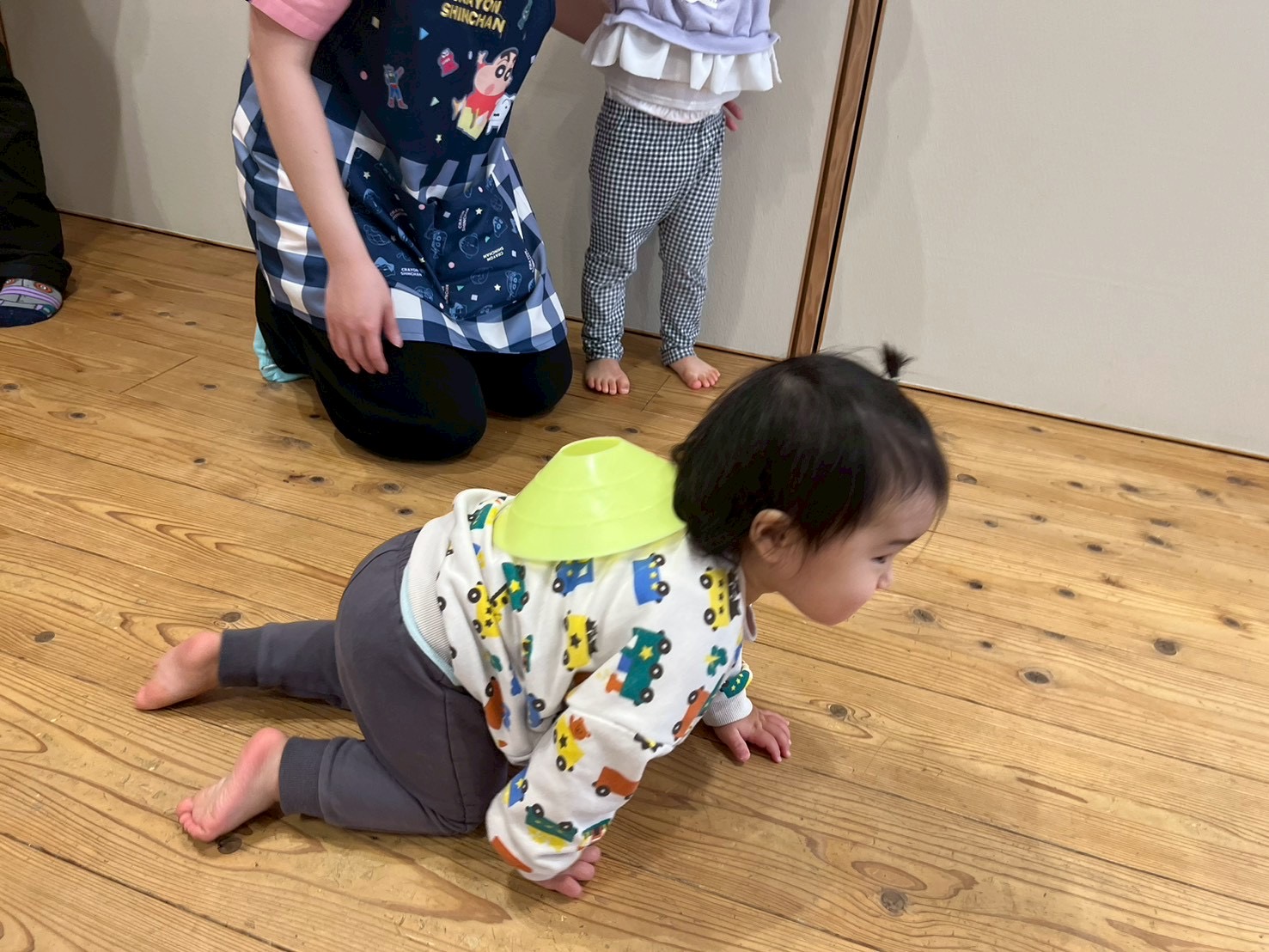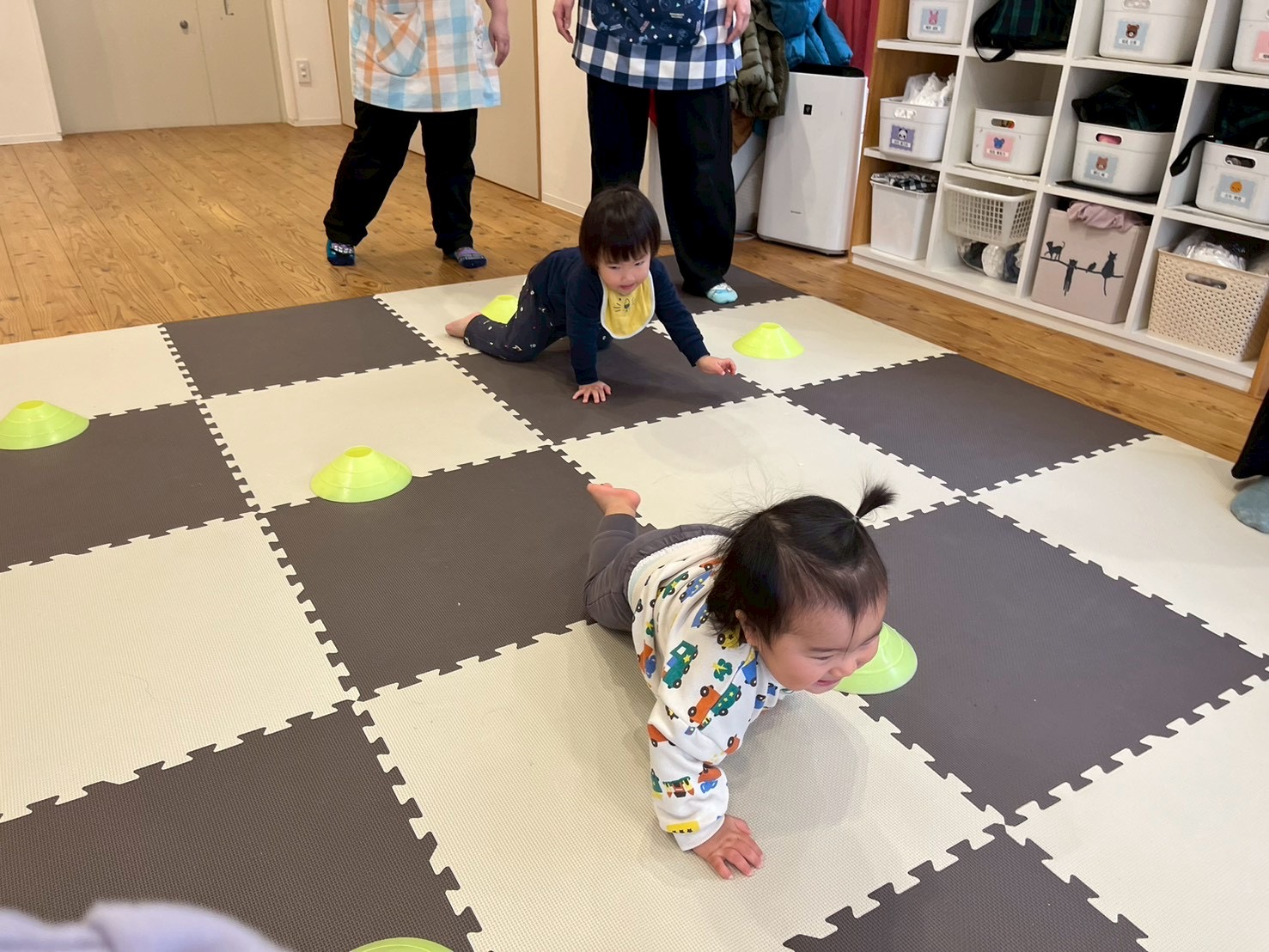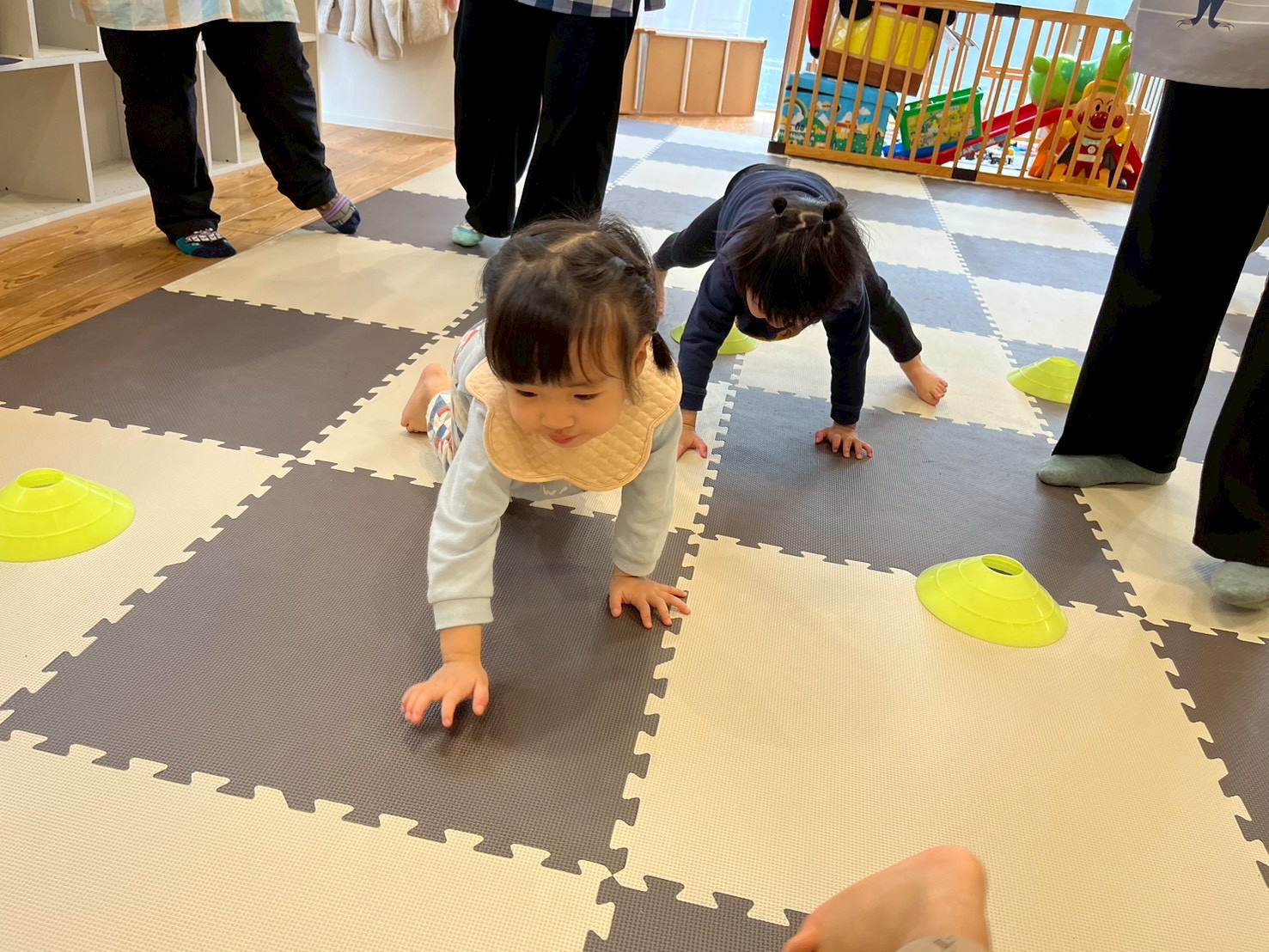 コーンに当たらないようにクマさん歩きをしたり、頭や手に乗せて落とさないように歩いたり、遠くに投げたりしました♬.*゚