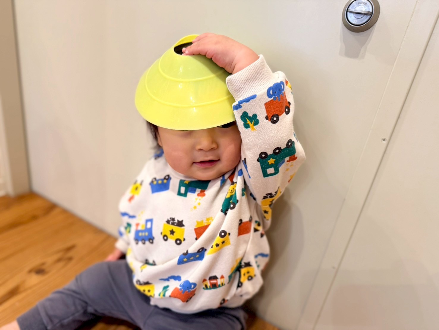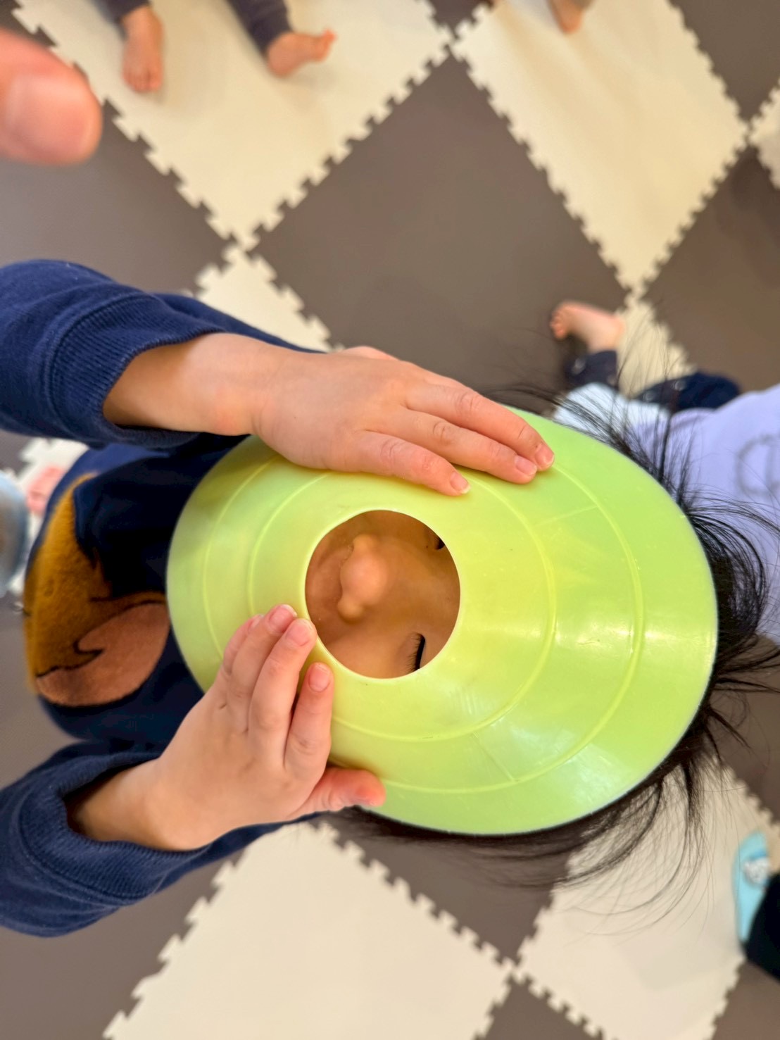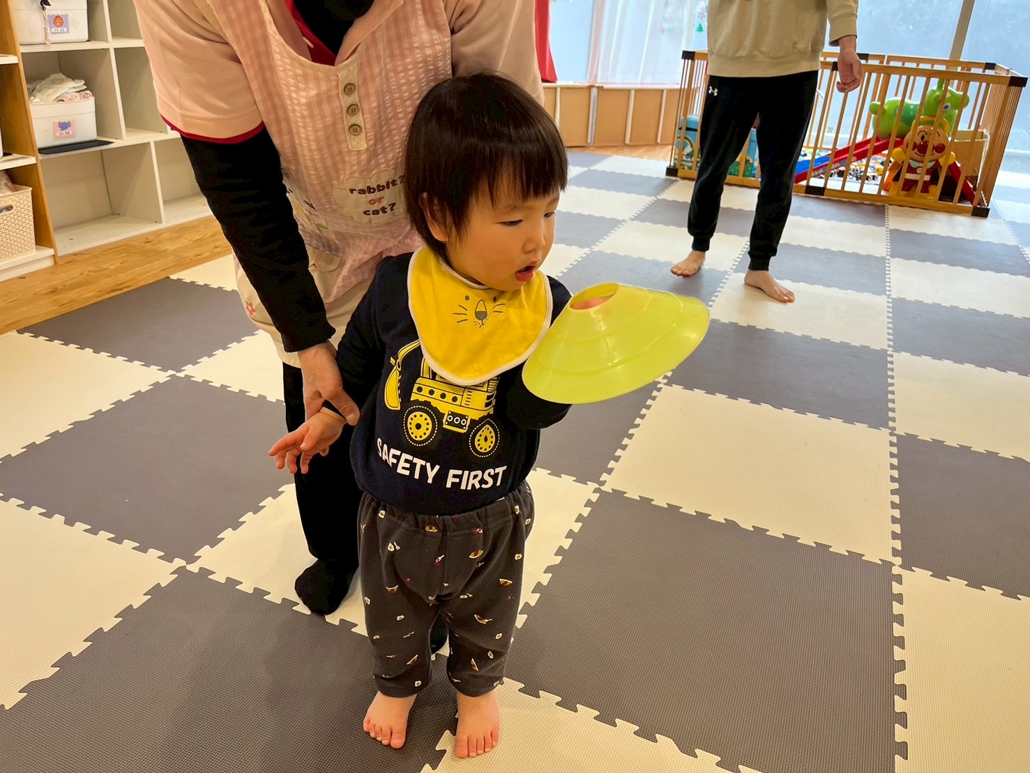 コーンに当たらないようにクマさん歩きをしたり、頭や手に乗せて落とさないように歩いたり、遠くに投げたりしました♬.*゚
