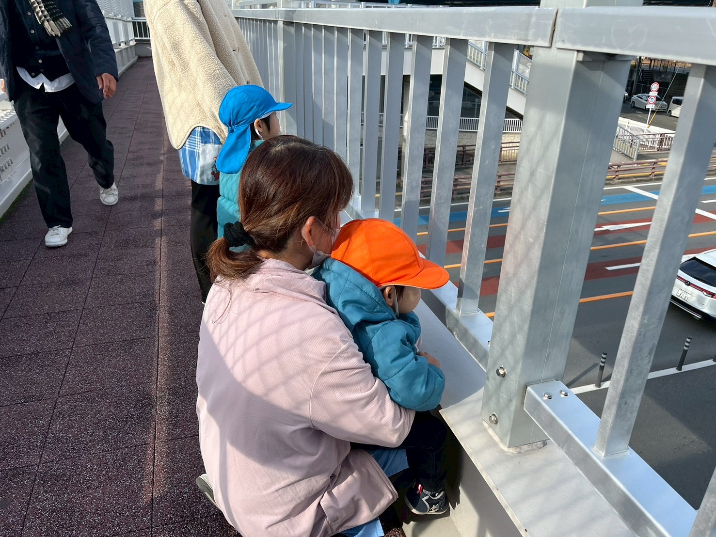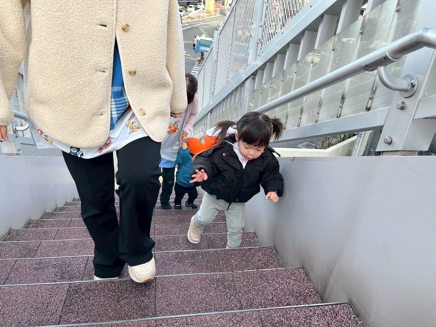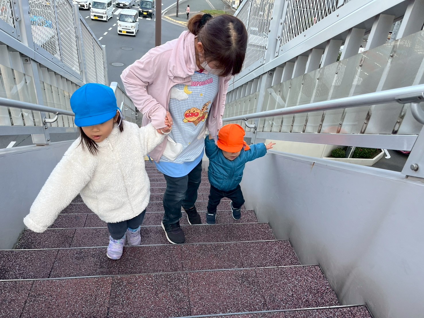 今日は新浜公園に遊びに行きました⛲️先生と手を繋いでお散歩しながら歩道橋へ🚶♀️³₃ 階段をあがって上からカートに乗っているお友達に「おーい(*^^*)」と手を振る子ども達でした😁︎💕︎︎