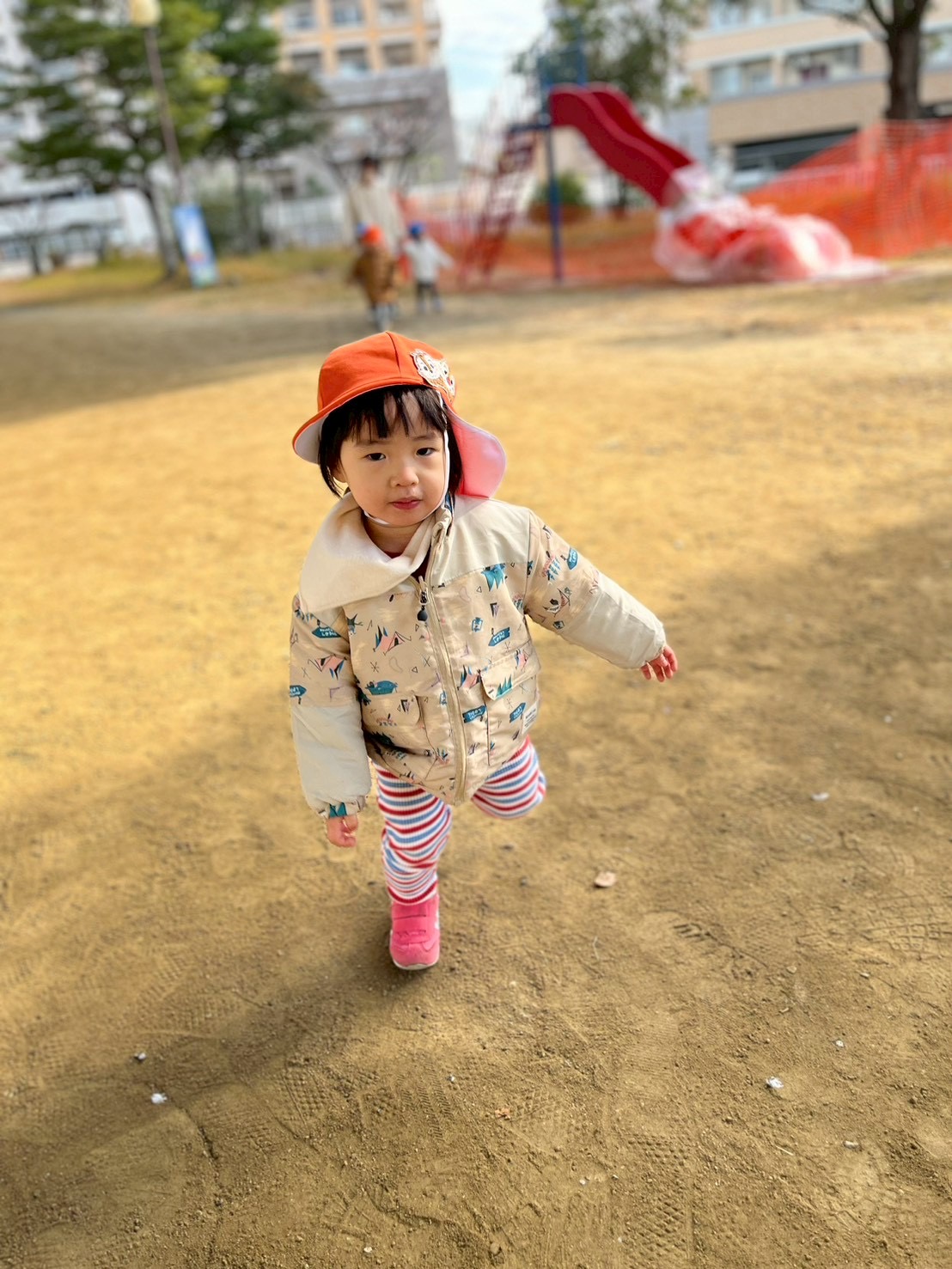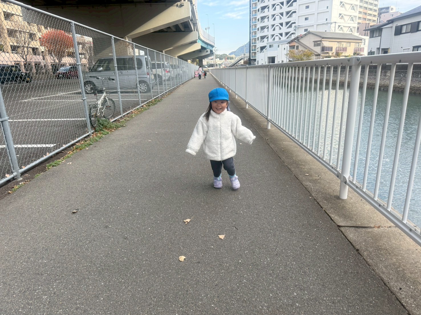 歩道橋を渡り終えるとみんなが大好きな真っ直ぐな道に到着✧*。『よーいどん!』で公園まで走って向かいました💨