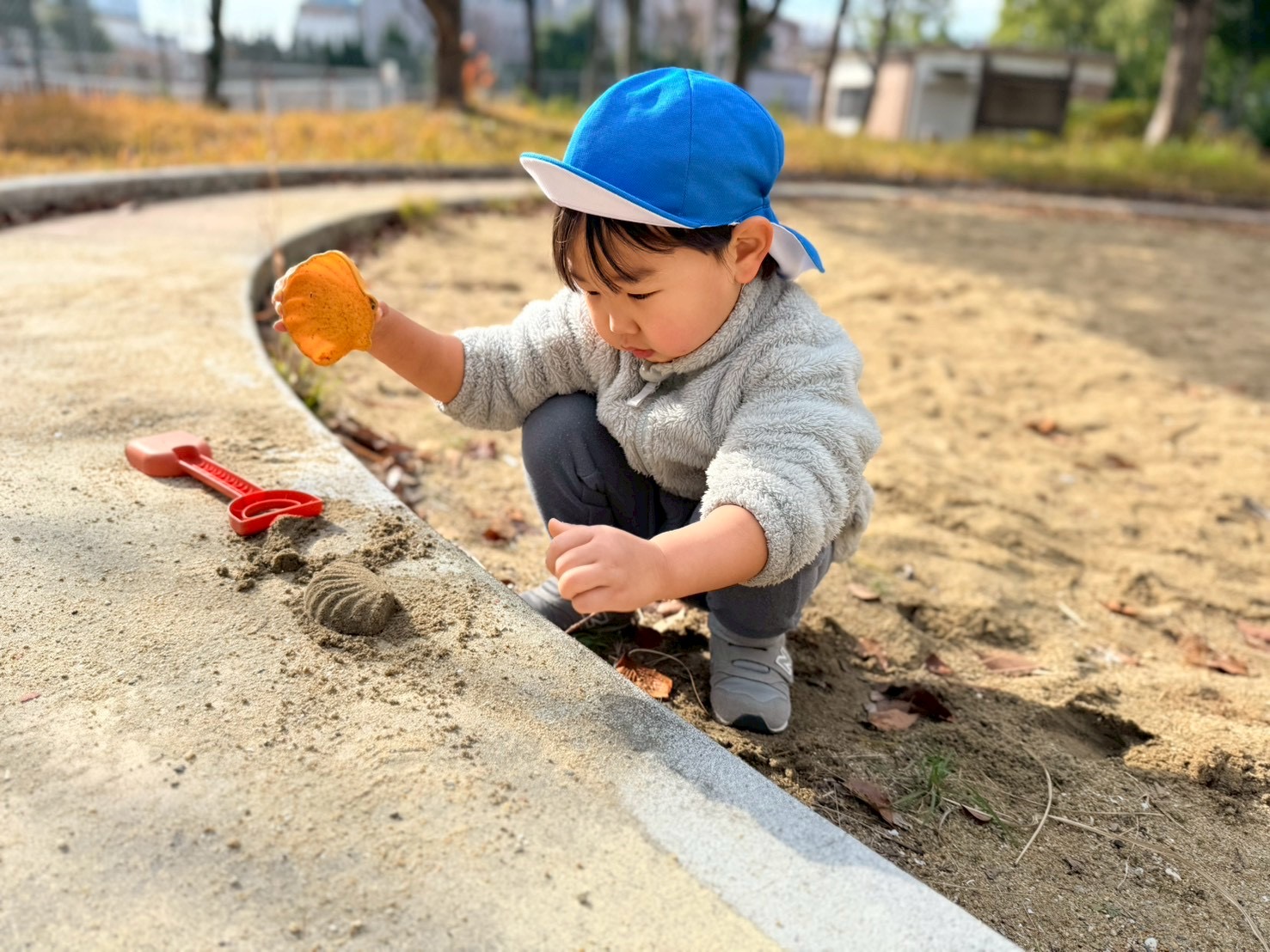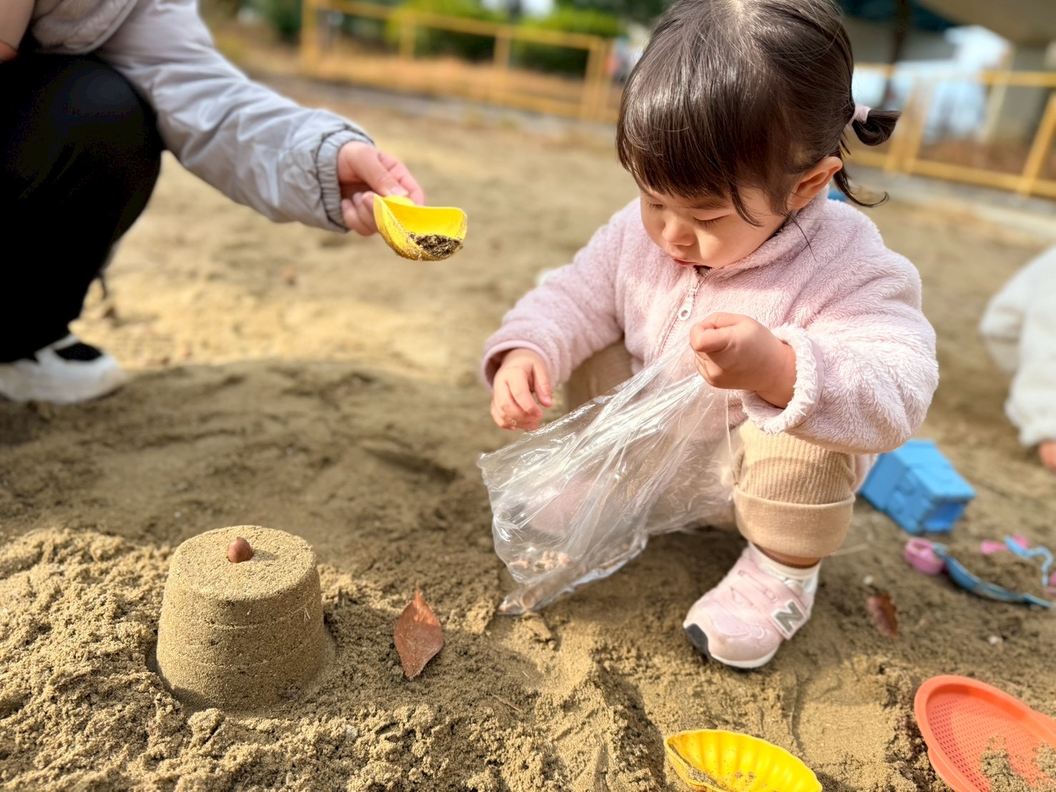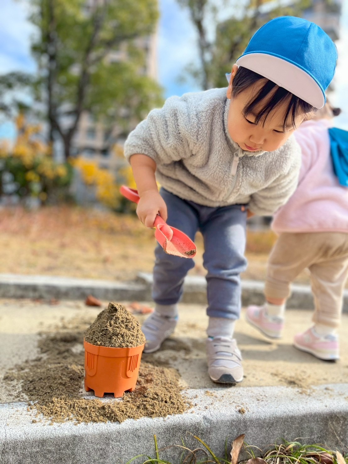 先生と一緒にブランコに乗ったり、お砂でどんぐりを使ってケーキやかき氷を作ったりして遊んでいましたよ🍀*゜