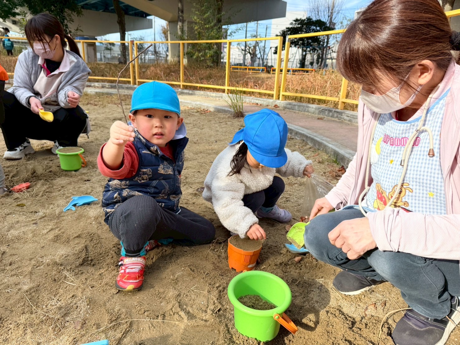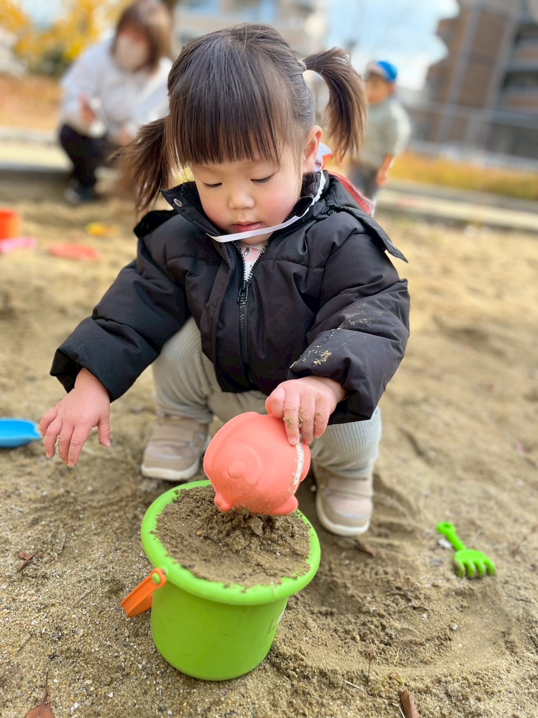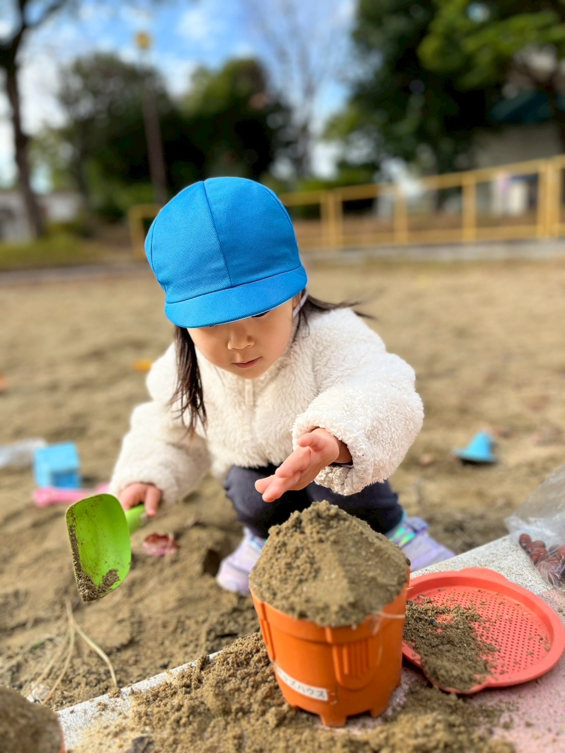 先生と一緒にブランコに乗ったり、お砂でどんぐりを使ってケーキやかき氷を作ったりして遊んでいましたよ🍀*゜