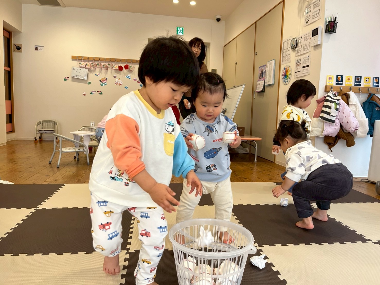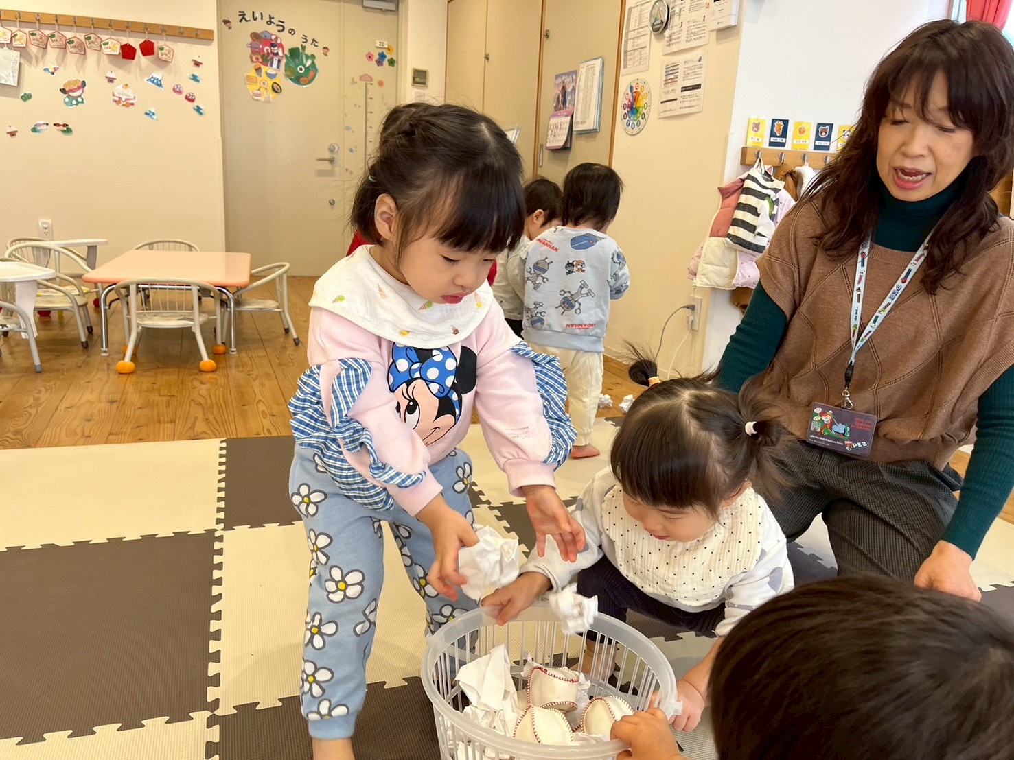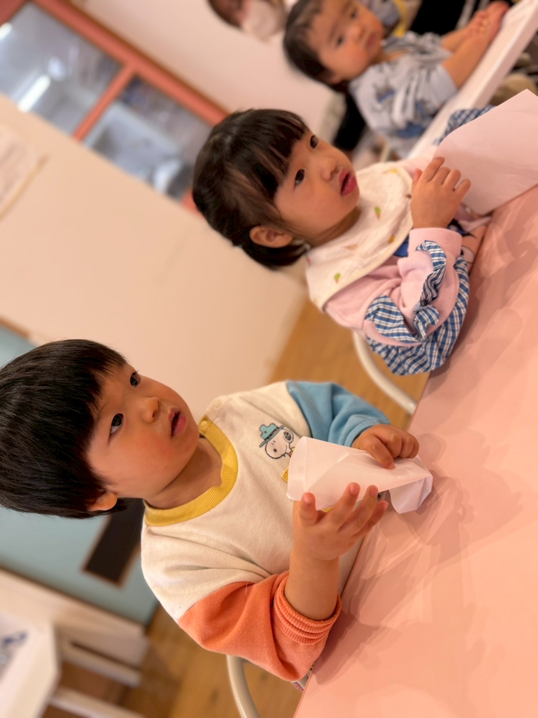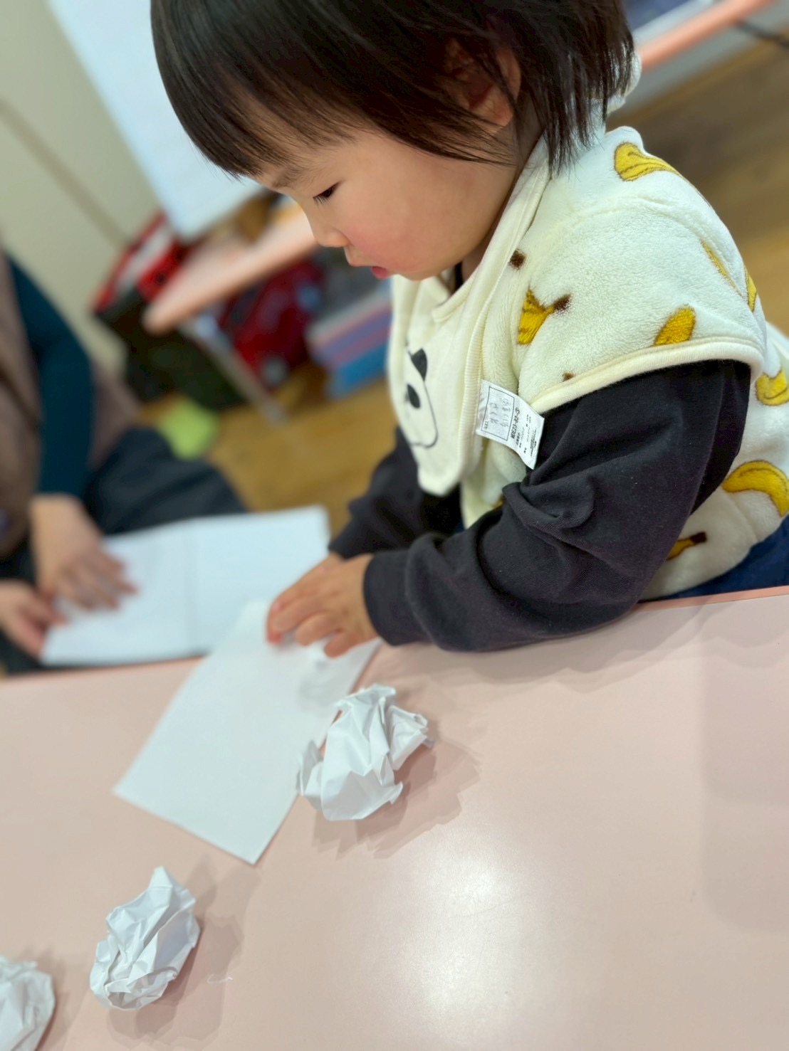 最後に紙をグシャグシャにして雪を作り、カゴに入れて遊びました⛄️「エイッ!」と投げたり先生と一緒にカゴを持って逃げたりと楽しんでいました(*´▽`*)♬*゜