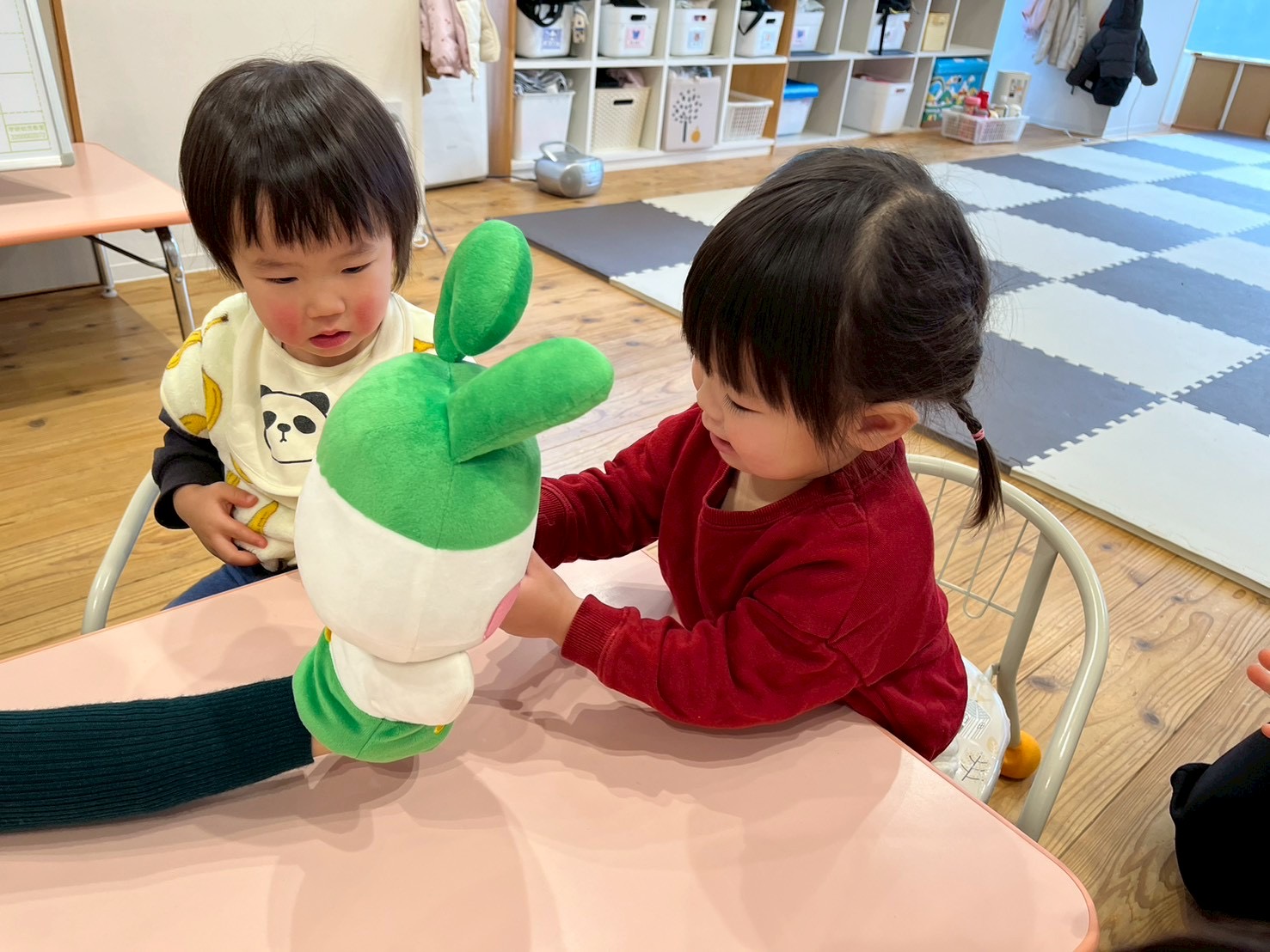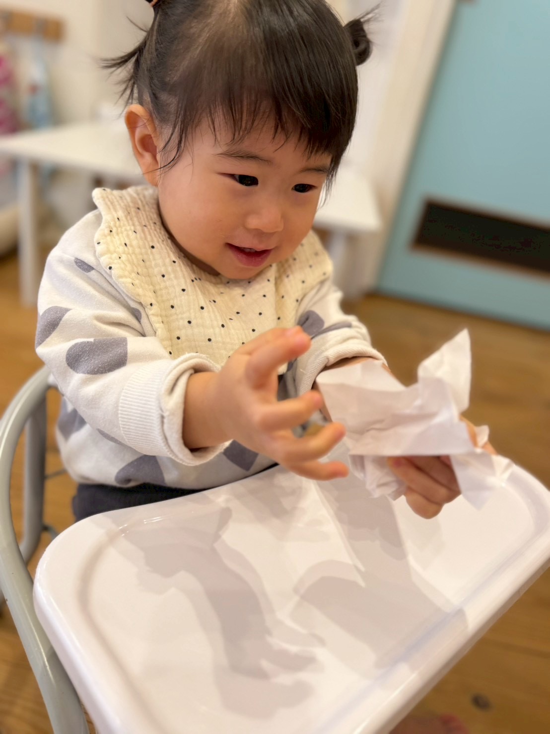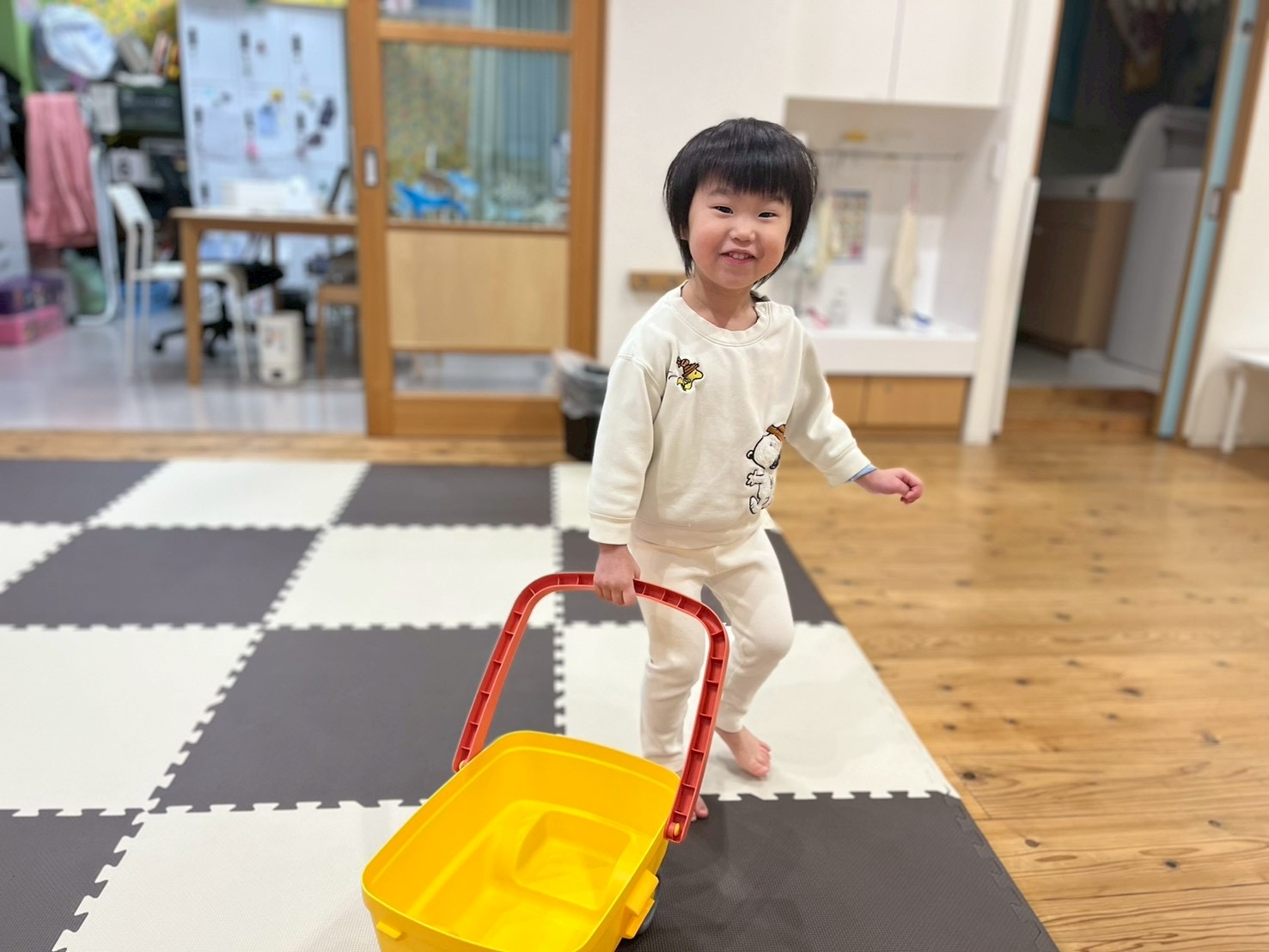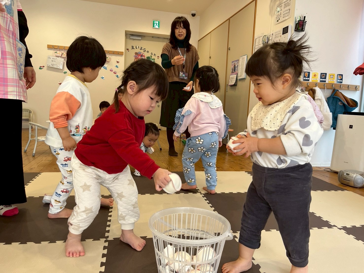 最後に紙をグシャグシャにして雪を作り、カゴに入れて遊びました⛄️「エイッ!」と投げたり先生と一緒にカゴを持って逃げたりと楽しんでいました(*´▽`*)♬*゜