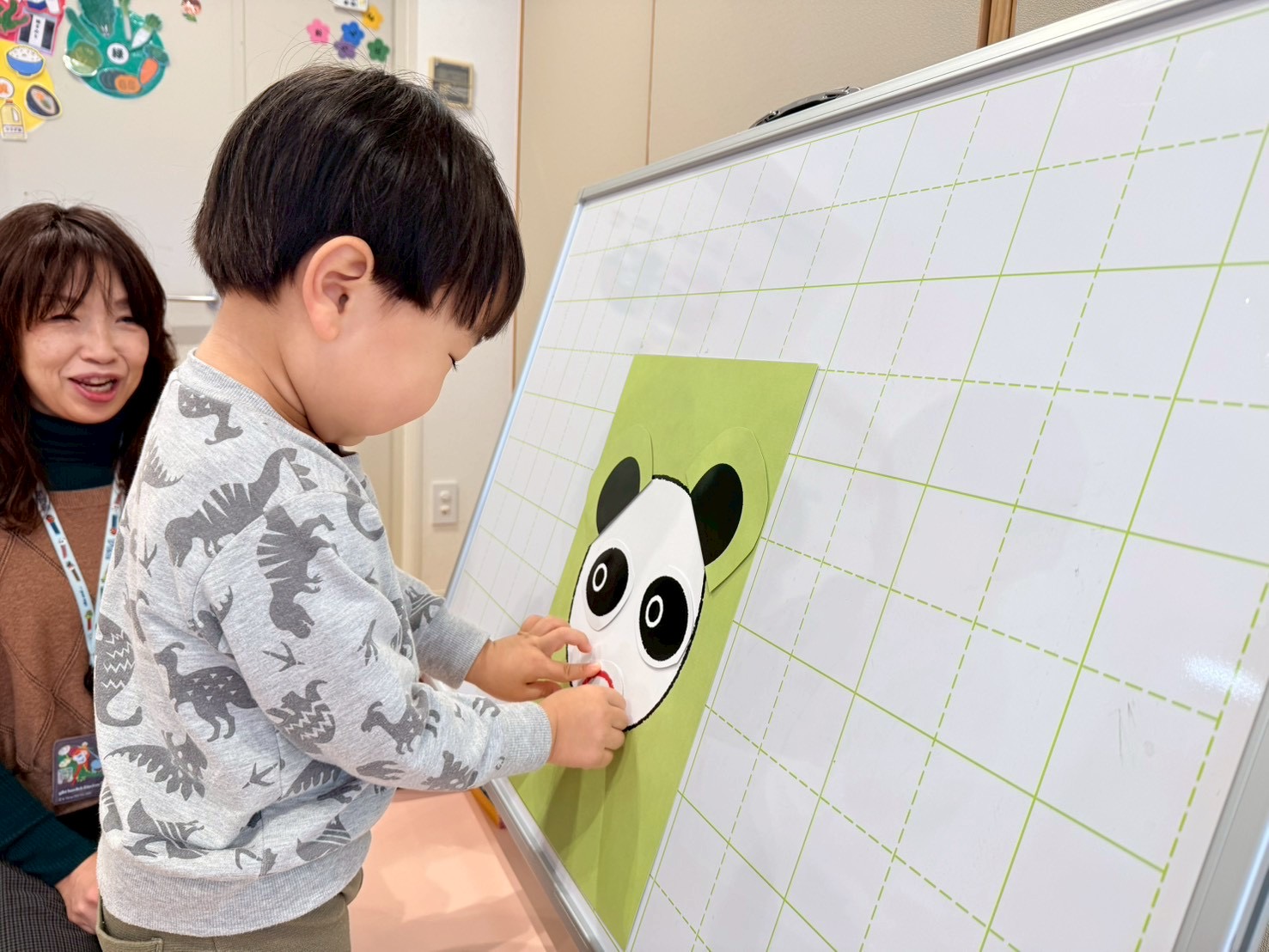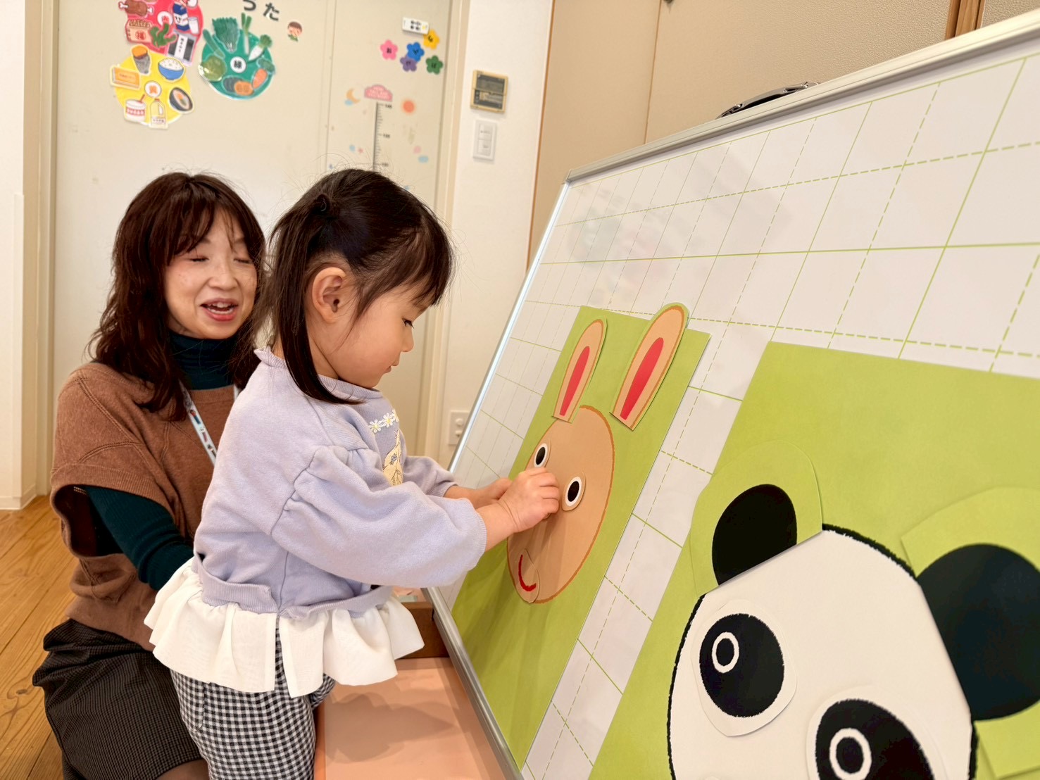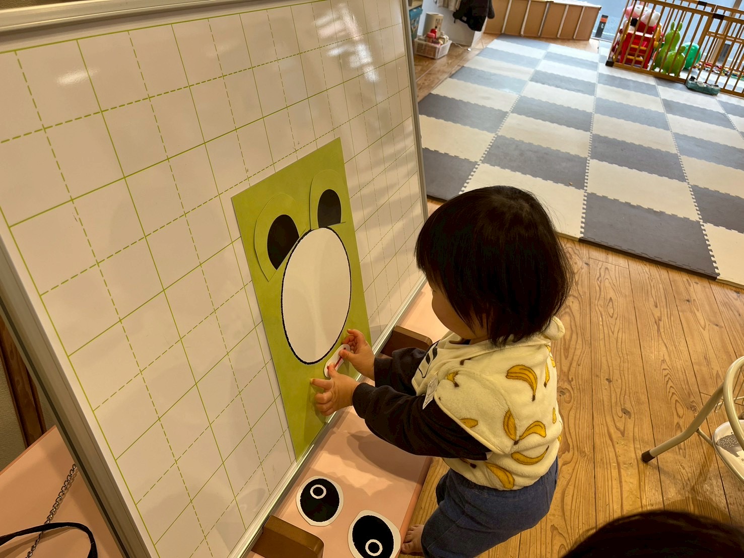 最初は0・1歳児さんから始まり、「目・鼻・耳・口」と顔の部位の名前を楽しく学びました🌟顔のパーツを貼ってパンダ🐼・ウサギ🐰・コアラ🐨の顔を作りました!