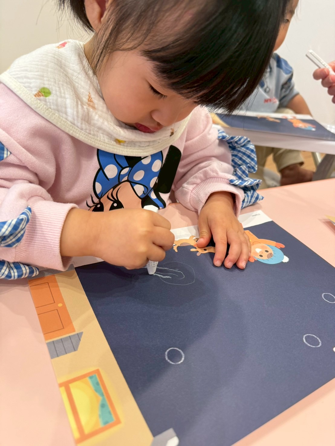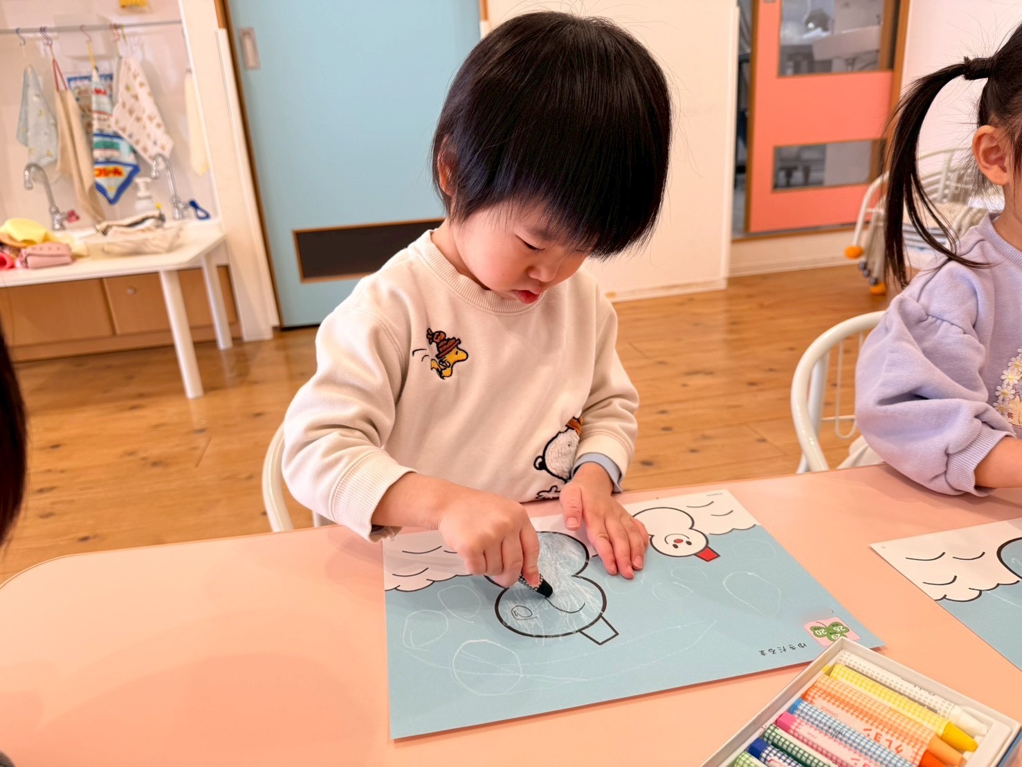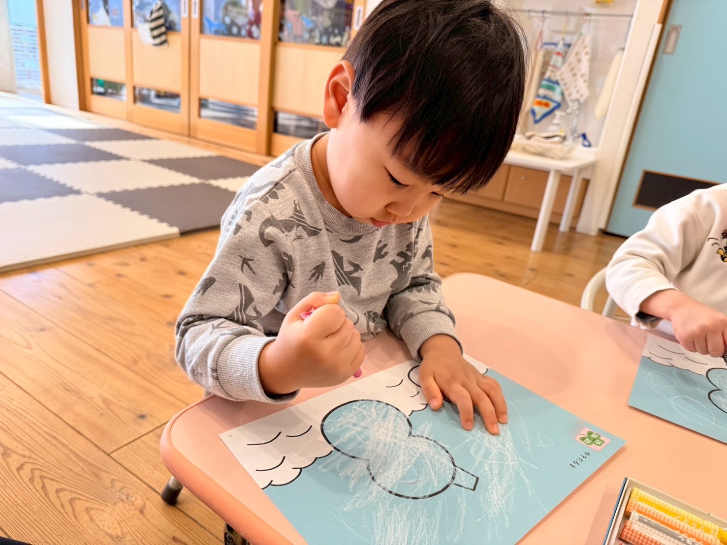 その後は白色のクレヨンを使って雪を描きました❅*॰ॱ丸を書いたり、線を引いたりして雪が降っている様子を上手に表現していましたよ👏✨
