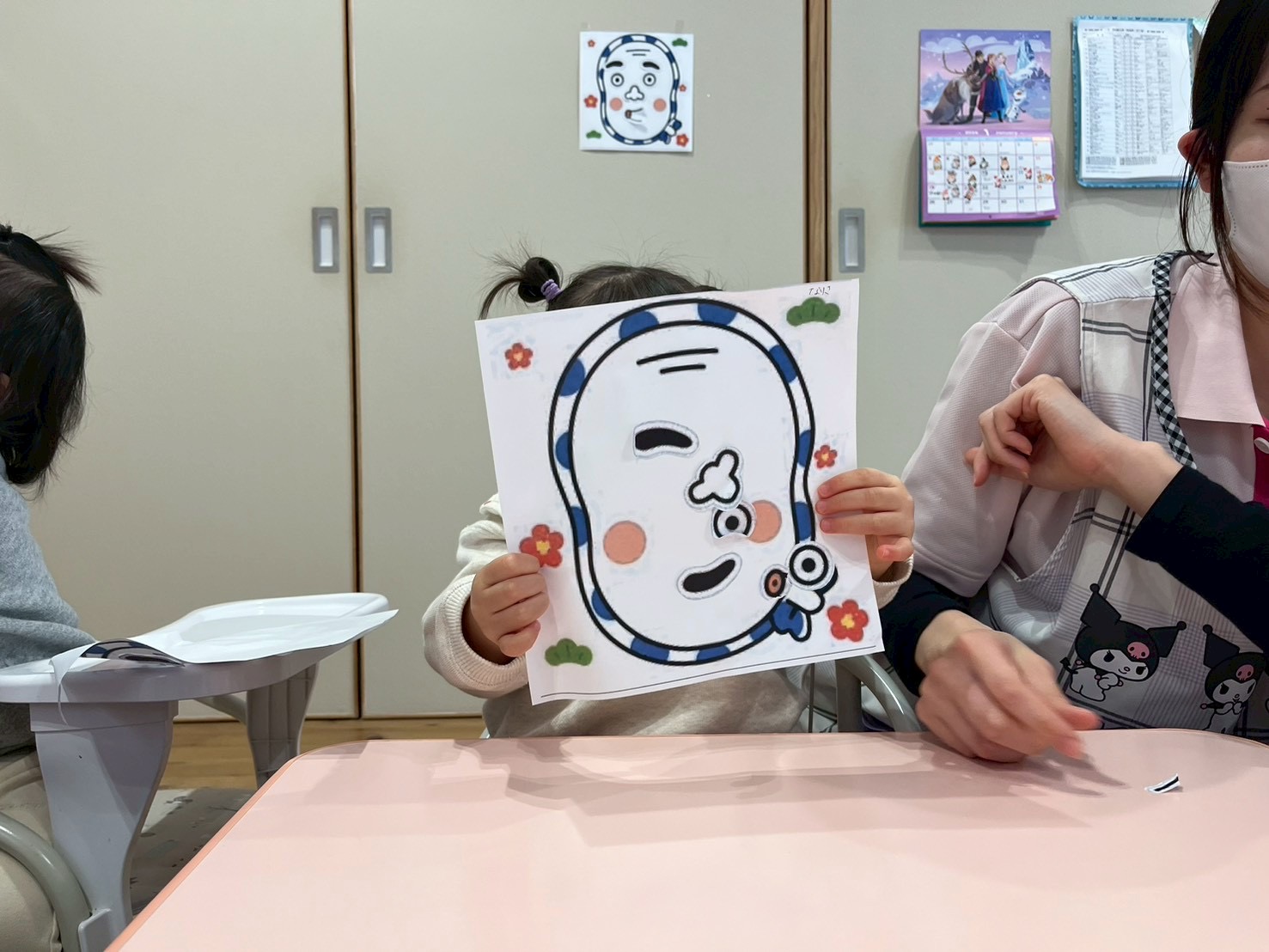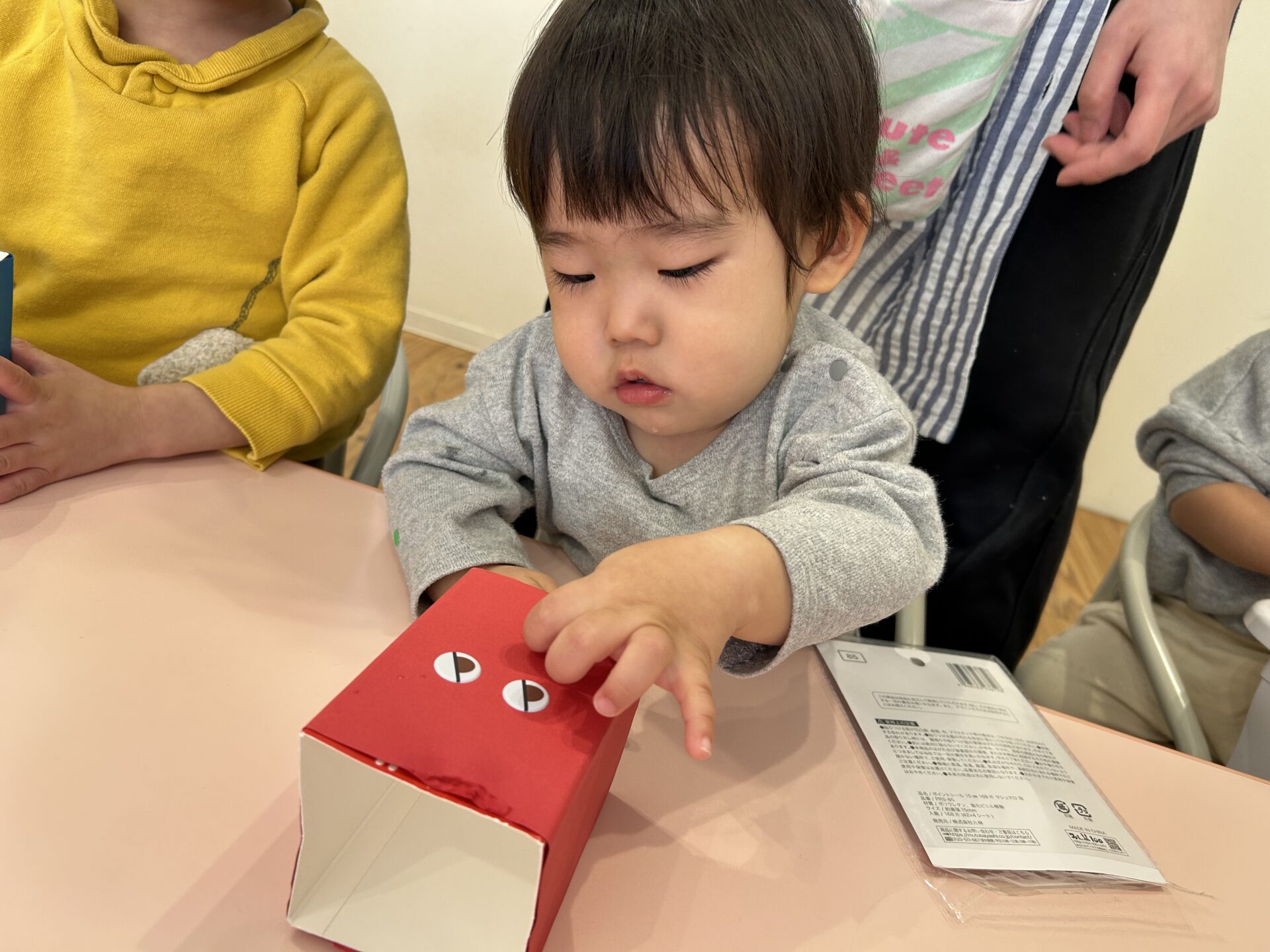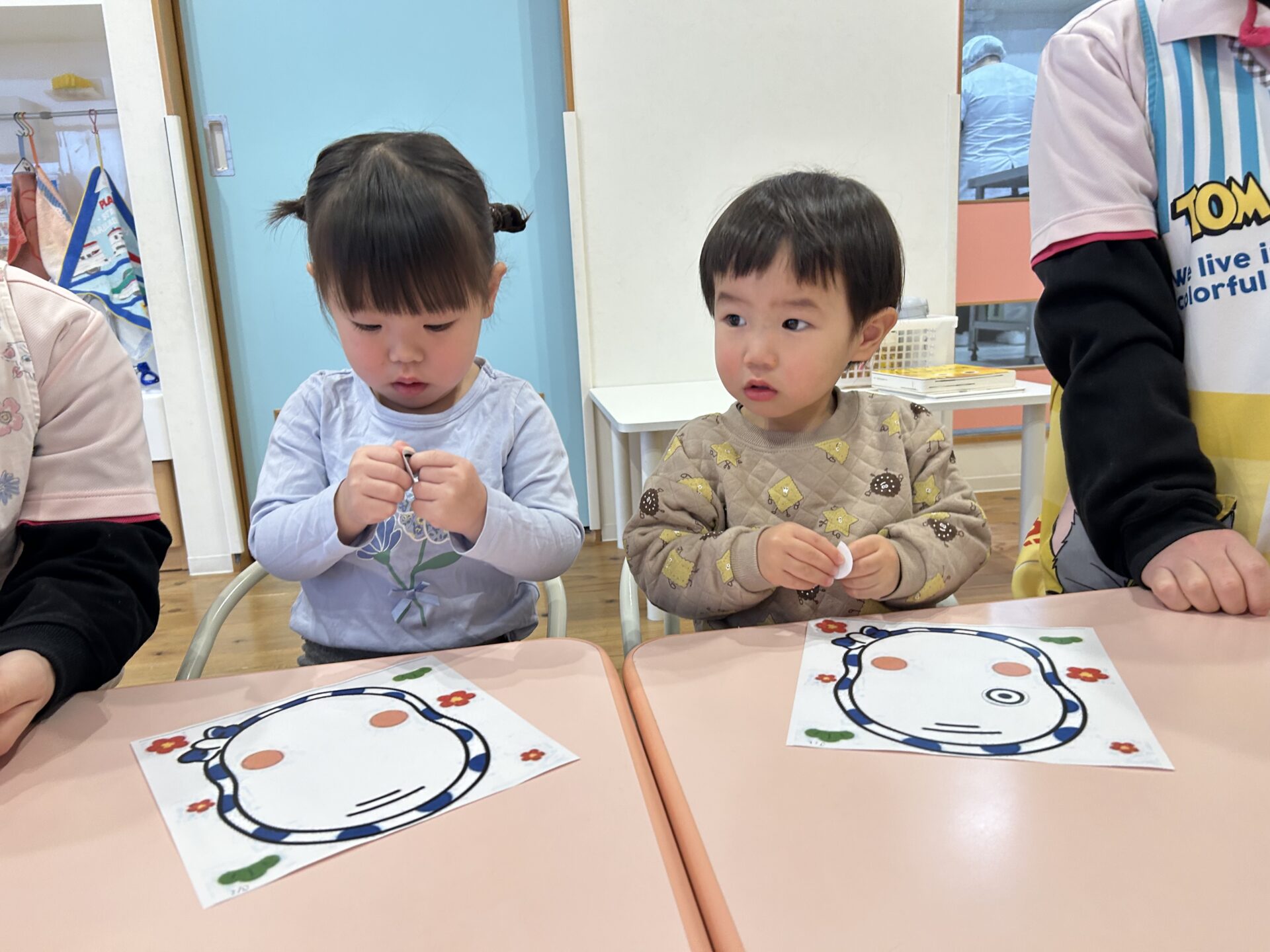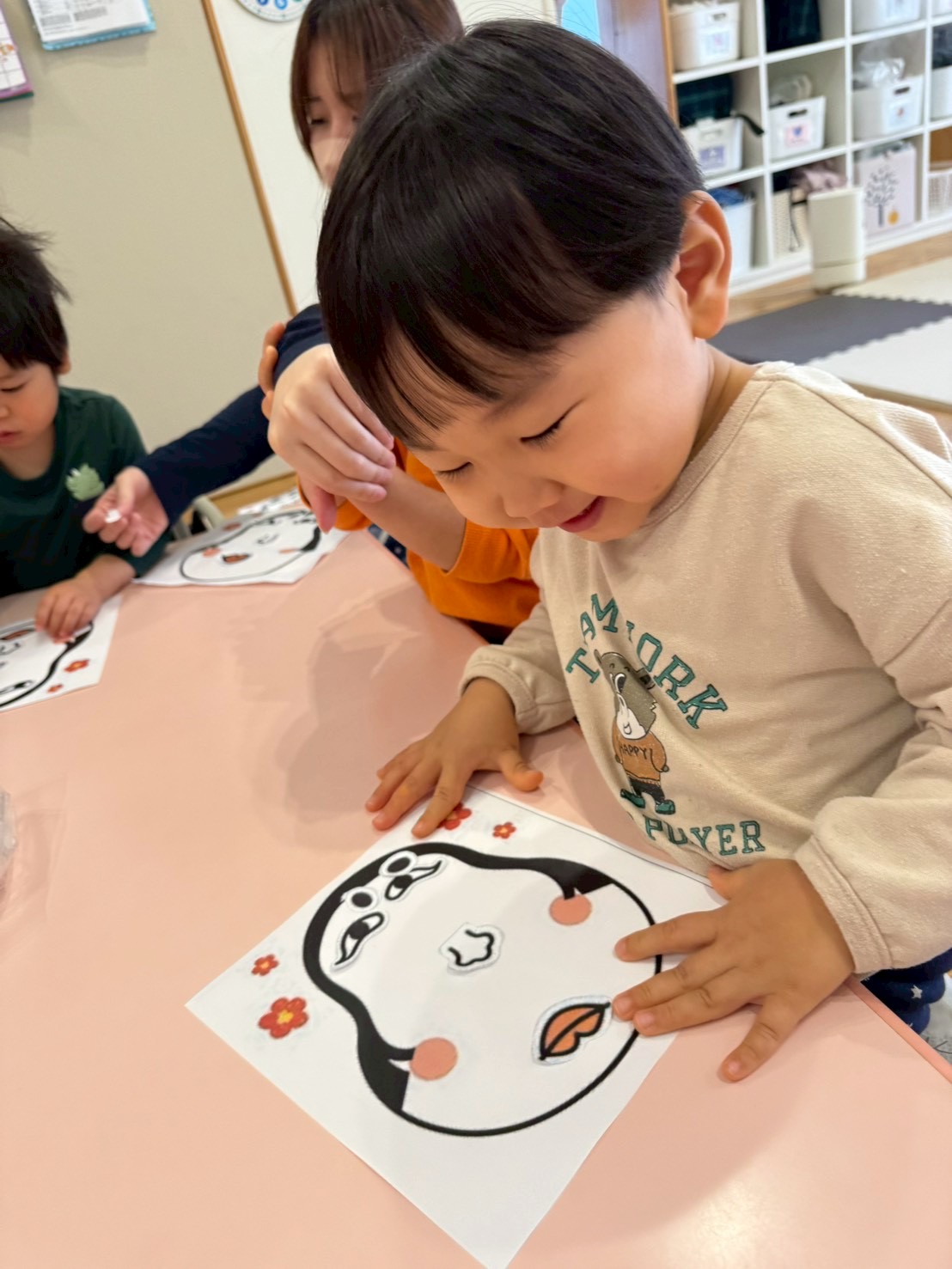 「どんなお顔がいいかなぁ?」と先生と子どもたちでお話をしながらマスの👹顔を作りました!