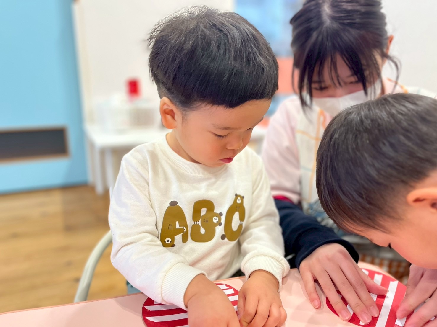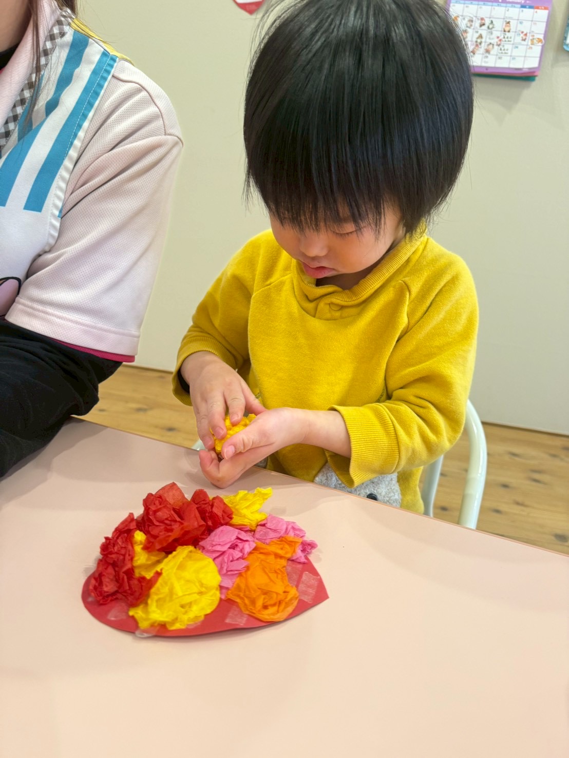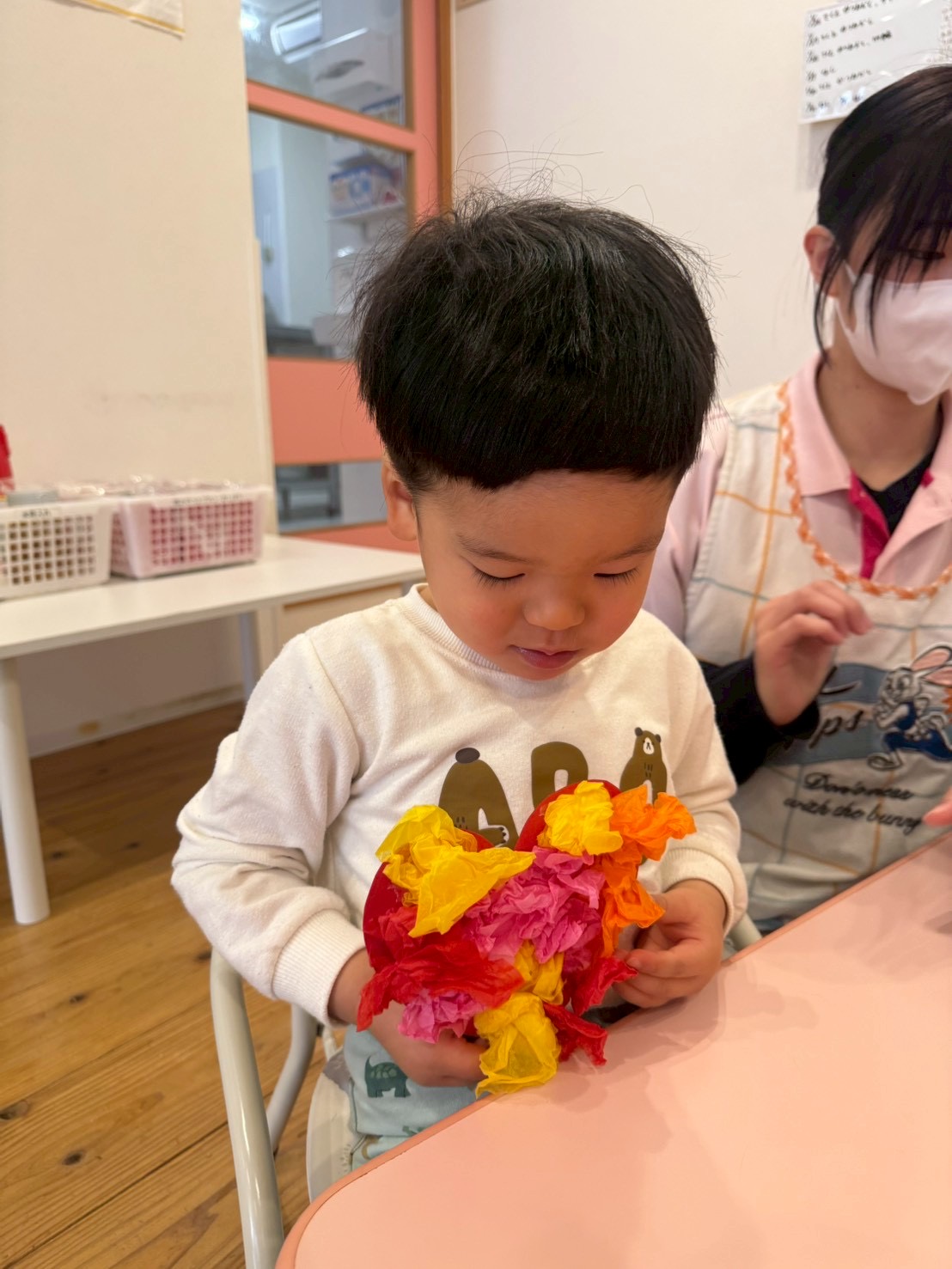 今日はバレンタインの製作で花紙を丸めて、ハート型の画用紙に貼っていきました💝🍫